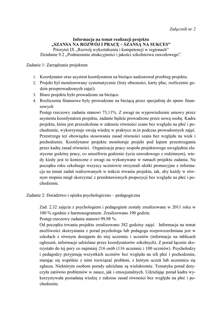 Załącznik nr 2 Informacja na temat realizacji projektu „SZANSA NA ROZWÓJ I PRACĘ – SZANSĄ NA SUKCES” Priorytet IX „Rozwój wykształcenia i kompetencji w regionach” Działanie 9.2 „Podniesienie atrakcyjności i jakości szkolnictwa zawodowego”. Zadanie 1: Zarządzanie projektem 1. Koordynator oraz asystent koordynatora na bieżąco nadzorował przebieg projektu. 2. Projekt był monitorowany systematycznie (listy obecności, karty płac, rozliczenie go- dzin przeprowadzonych zajęć). 3. Biuro projektu było prowadzone na bieżąco. 4. Rozliczenia finansowe były prowadzone na bieżącą przez specjalistę do spraw finansowych Postęp rzeczowy zadania stanowi 73,11%. Z uwagi na wypowiedzenie umowy przez asystenta koordynatora projektu, zadanie będzie prowadzone przez nową osobę. Kadra projektu, która jest przeszkolona w zakresie równości szans bez względu na płeć i pochodzenie, wykorzystuje swoją wiedzę w praktyce m.in podczas prowadzonych zajęć. Przestrzega też obowiązku stosowania zasad równości szans bez względu na wiek i pochodzenie. Koordynator projektu monitoruje projekt pod kątem przestrzegania przez kadrę zasad równości. Organizacja pracy zespołu projektowego uwzględnia elastyczne godziny pracy, co umożliwia godzenie życia zawodowego z rodzinnym), wtedy kiedy jest to konieczne z uwagi na wykonywane w ramach projektu zadania. Na początku roku szkolnego wszyscy uczniowie otrzymali ulotki promocyjne z informacja na temat zadań realizowanych w trakcie trwania projektu, tak, aby każdy w równym stopniu mógł skorzystać z przedstawionych propozycji bez względu na płeć i pochodzenie. Zadanie 2: Doradztwo i opieka psychologiczno – pedagogiczna Zad. 2.32 zajęcia z psychologiem i pedagogiem zostały zrealizowane w 2011 roku w 100 % zgodnie z harmonogramem. Zrealizowano 190 godzin. Postęp rzeczowy zadania stanowi 99,98 %. Od początku trwania projektu zrealizowano 382 godziny zajęć. Informacja na temat możliwości skorzystania z porad psychologa lub pedagoga rozpowszechniana jest w szkołach z równym dostępem do niej uczennic i uczniów (informacje na tablicach ogłoszeń, informacje udzielane przez koordynatorów szkolnych). Z porad łącznie skorzystało do tej pory co najmniej 216 osób (116 uczennic i 100 uczniów). Psycholodzy i pedagodzy przyjmują wszystkich uczniów bez względu na ich płeć i pochodzenie, starając się wspólnie z nimi rozwiązać problem, z którym uczeń lub uczennica się zgłasza. Niektórym osobom porady udzielane są wielokrotnie. Tematyka porad dotyczyła zarówno problemów w nauce, jak i emocjonalnych. Udzielając porad kadra wykorzystywała posiadaną wiedzę z zakresu zasad równości bez względu na płeć i pochodzenie. Zadanie 3: Praca z doradcą zawodowym Zadanie 3.34 - zajęcia z doradcą zawodowym zostały zrealizowane w 2011 roku - w 90,71% zgodnie z harmonogramem. Łącznie od stycznia do czerwca zrealizowano 166 godzin. Wynagrodzenie za 11 godzin zostanie wypłacone w lipcu. Zadanie 3.36 - godziny zrealizowane- administratora materiałów i danych słuchaczach - stanowi 45 %. Łącznie zrealizowano 162 godzin. Zadanie 3.37 - zajęcia moderatora na platformie MOODLE zrealizowano w 87,02 % Zrealizowano w okresie styczeń-czerwiec 2011 roku 74 godziny. Zadanie 3.38 - zajęcia internetowe zrealizowane zostały w 55% zgodnie z harmonogramem. Łącznie od miesiąca styczeń-czerwiec 2011 roku zrealizowano 181 godziny. Postęp rzeczowy zadania stanowi 88,43 % Na platformie zdalnego nauczania MOODLE zalogowanych jest do tej pory 178 osoby, w tym 51 uczennic i 127 uczniów. Każdy,kto wyrazi chęć skorzystania z ze zgromadzonych zasobów ma taką możliwość. Wszyscy uczniowie i uczennice mają równą możliwość wypowiadania się na forach tematycznych i korzystania z porad doradców zawodowych, którzy wykorzystują swoją wiedzę i umiejętności z zakresu równości szans bez względu na płeć i pochodzenie. Umożliwi im to łatwiejsze poruszanie się na rynku pracy po ukończeniu szkoły. 136 osób (w tym 31 uczennic i 105 uczniów) zrealizowało już minimum 3 moduły. Zadanie 4: Zajęcia profilaktyczne Zadanie 4.101 - zajęcia z psychologiem i pedagogiem zrealizowano w 100 % zgodnie z harmonogramem. Łącznie zajęć przeprowadzono od stycznia do maja w ilości 327 godzin. Od początku trwania projektu zrealiozowano 627 godzin zajęć. Zadanie 4.106 - kurs I pomocy przeprowadzono w dniach 10-11/03/2011 - ilość osób 11, 17-18/03/2011 - 9 osób, 19-20/03/2011 - 20 osób. Postęp rzeczowy zadania stanowi 97,4% .W zajęciach profilaktycznych wzięło udział do tej pory nie mniej niż 271 uczniów i 459 uczennic (zajęcia, które zostały podsumowane), co odpowiada strukturze klas, w których były prowadzone. Omawiane były różnorodne tematy dotyczące m.in. udziału młodzieży w życiu społecznym i rodzinnym oraz ponoszonych konsekwencji własnego zachowania bez względu na płeć i pochodzenie. W szkoleniu z I pomocy przedmedycznej wzięło udział 46 % uczennic i 54 % uczniów, co stanowi wynik zbliżony do zakładanego równego udziału. Na zajęcia zakwalifikowani zostali wszyscy, którzy wyrazili swoją wolę poprzez złożenie zgody na udział w zajęciach. Zajęcia prowadzone były z zachowaniem zasad równości szans bez względu na płeć i pochodzenie. Zadanie 5: kurs mediacji Zadanie 5.125 - zajęcia z mediacji - przeprowadzono w dniach 26-27/02/2011 oraz 05-06/03/2011 oraz 19-20/03/2011. Łącznie zrealizowano 45 godzin. Zorganizowano dowóz beneficjentów na zajęcia z mediacji. Postęp rzeczowy zadania stanowi 82,26% . Postęp rzeczowy w realizacji zajęć stanowi 94,12%. W kursie mediacji wzięlo udział 48,9 % uczennic i 51,1 % uczniów, co stanowi wynik zbliżony do zakładanego równego udziału. Na zajęcia zakwalifikowani zostali wszyscy, którzy wyrazili swoją wolę poprzez złożenie zgody na udział w zajęciach. Zajęcia prowadzone były z zachowaniem