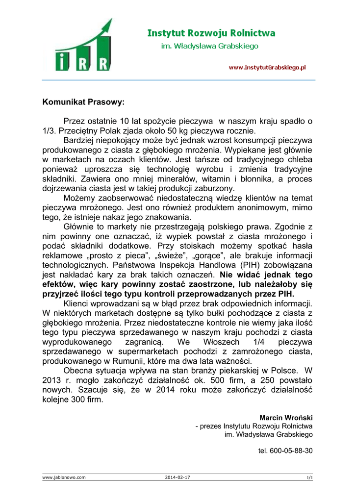 Komunikat Prasowy: Przez ostatnie 10 lat spożycie pieczywa w naszym kraju spadło o 1/3. Przeciętny Polak zjada około 50 kg pieczywa rocznie. Bardziej niepokojący może być jednak wzrost konsumpcji pieczywa produkowanego z ciasta z głębokiego mrożenia. Wypiekane jest głównie w marketach na oczach klientów. Jest tańsze od tradycyjnego chleba ponieważ uproszcza się technologię wyrobu i zmienia tradycyjne składniki. Zawiera ono mniej minerałów, witamin i błonnika, a proces dojrzewania ciasta jest w takiej produkcji zaburzony. Możemy zaobserwować niedostateczną wiedzę klientów na temat pieczywa mrożonego. Jest ono również produktem anonimowym, mimo tego, że istnieje nakaz jego znakowania. Głównie to markety nie przestrzegają polskiego prawa. Zgodnie z nim powinny one oznaczać, iż wypiek powstał z ciasta mrożonego i podać składniki dodatkowe. Przy stoiskach możemy spotkać hasła reklamowe „prosto z pieca”, „świeże”, „gorące”, ale brakuje informacji technologicznych. Państwowa Inspekcja Handlowa (PIH) zobowiązana jest nakładać kary za brak takich oznaczeń. Nie widać jednak tego efektów, więc kary powinny zostać zaostrzone, lub należałoby się przyjrzeć ilości tego typu kontroli przeprowadzanych przez PIH. Klienci wprowadzani są w błąd przez brak odpowiednich informacji. W niektórych marketach dostępne są tylko bułki pochodzące z ciasta z głębokiego mrożenia. Przez niedostateczne kontrole nie wiemy jaka ilość tego typu pieczywa sprzedawanego w naszym kraju pochodzi z ciasta wyprodukowanego zagranicą. We Włoszech 1/4 pieczywa sprzedawanego w supermarketach pochodzi z zamrożonego ciasta, produkowanego w Rumunii, które ma dwa lata ważności. Obecna sytuacja wpływa na stan branży piekarskiej w Polsce. W 2013 r. mogło zakończyć działalność ok. 500 firm, a 250 powstało nowych. Szacuje się, że w 2014 roku może zakończyć działalność kolejne 300 firm. Marcin Wroński - prezes Instytutu Rozwoju Rolnictwa im. Władysława Grabskiego tel. 600-05-88-30 www.jablonowo.com 2014-02-17 1/1
