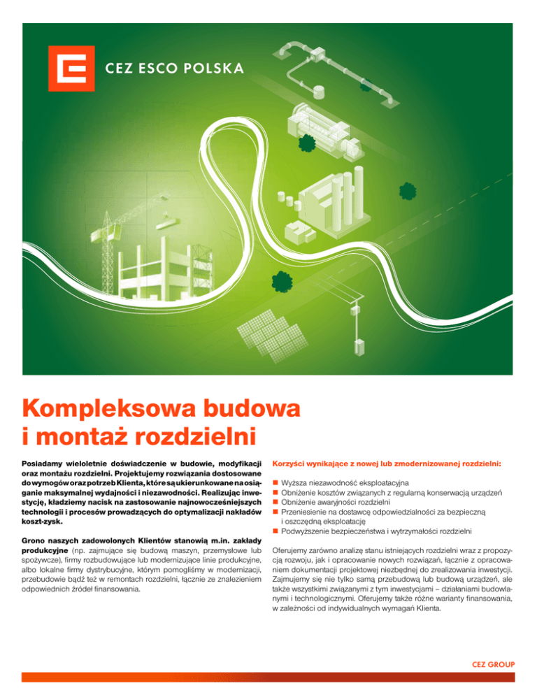CEZ ESCO POLSK A Kompleksowa budowa i montaż rozdzielni Posiadamy wieloletnie doświadczenie w budowie, modyfikacji oraz montażu rozdzielni. Projektujemy rozwiązania dostosowane do wymogów oraz potrzeb Klienta, które są ukierunkowane na osiąganie maksymalnej wydajności i niezawodności. Realizując inwestycję, kładziemy nacisk na zastosowanie najnowocześniejszych technologii i procesów prowadzących do optymalizacji nakładów koszt-zysk. Grono naszych zadowolonych Klientów stanowią m.in. zakłady produkcyjne (np. zajmujące się budową maszyn, przemysłowe lub spożywcze), firmy rozbudowujące lub modernizujące linie produkcyjne, albo lokalne firmy dystrybucyjne, którym pomogliśmy w modernizacji, przebudowie bądź też w remontach rozdzielni, łącznie ze znalezieniem odpowiednich źródeł finansowania. Korzyści wynikające z nowej lub zmodernizowanej rozdzielni: Wyższa niezawodność eksploatacyjna Obniżenie kosztów związanych z regularną konserwacją urządzeń Obniżenie awaryjności rozdzielni Przeniesienie na dostawcę odpowiedzialności za bezpieczną i oszczędną eksploatację Podwyższenie bezpieczeństwa i wytrzymałości rozdzielni Oferujemy zarówno analizę stanu istniejących rozdzielni wraz z propozycją rozwoju, jak i opracowanie nowych rozwiązań, łącznie z opracowaniem dokumentacji projektowej niezbędnej do zrealizowania inwestycji. Zajmujemy się nie tylko samą przebudową lub budową urządzeń, ale także wszystkimi związanymi z tym inwestycjami – działaniami budowlanymi i technologicznymi. Oferujemy także różne warianty finansowania, w zależności od indywidualnych wymagań Klienta. CEZ GROUP Oferta „pod klucz” proponowana przez CEZ ESCO Polska: Konsultacje i doradztwo Przeprowadzanie badań/opracowania koncepcji rozdzielni (ocena aktualnego stanu, audyt energetyczny, projekt modernizacji, propozycje środków prowadzących do obniżenia kosztów eksploatacji/zagrożeń) Opracowanie dokumentacji projektowej przebudowy, rozwoju lub budowy nowego obiektu Modernizacja albo przebudowa aktualnej rozdzielni Pomoc w uzyskiwaniu atrakcyjnego finansowania, łącznie z dotacjami Referencje Stacja transformatorowa „pod klucz” w Rožnově pod Radhoštěm Stacja transformatorowa M8 została dostarczona inwestorowi w tzw. formie „pod klucz”, czyli od początkowego projektu rozwiązania technicznego, przez wielostopniowe przygotowanie dokumentacji projektowej, do samej realizacji i uruchomienia – wszystko w bardzo krótkim czasie, tj. w 6 miesięcy. W ramach prac budowalnych niezbędne było również wykonanie przybudówki do obiektu zakładu produkcyjnego, w której umieszczone zostało nowo dostarczone wyposażenie rozdzielni, jak również przebudowanie całego wnętrza istniejącej rozdzielni. Z punktu widzenia dostaw technologicznych postawiono kompleksowe rozdzielnie wysokiego i niskiego napięcia, łącznie z transformatorami przesyłowymi, instalacją systemu zarządzającego i osłon rozdzielni. W związku z typem urządzeń i formą ich eksploatacji niezbędne było zabezpieczenie pomieszczeń pod kątem wytrzymałości termicznej i ochrony przeciwpożarowej. Przedmiotem zlecenia była także eksploatacja stacji transformatorowej M8 przez okres 7 lat. Eksploatacja i obsługa urządzeń, łącznie z możliwością zapewnienia dostaw elektryczności Serwis i konserwacja, przeglądy okresowe i kontrole Zapewnianie szkoleń i egzaminowanie personelu obsługującego urządzenia Doświadczenia Zrealizowaliśmy wiele pomyślnie zakończonych budów i modernizacji rozdzielni, zarówno w kategorii dużych projektów, jak i mniejszych zleceń, wykonywanych „pod klucz” dla małych i średnich przedsiębiorstw. Korzyści: Oszczędności finansowe wynikające z obniżenia kosztów produkcji Możliwość rozwoju produkcji w obiekcie Eksploatacja i serwis urządzeń w latach kolejnych Dane podstawowe Klient: ON SEMICONDUCTOR CZECH REPUBLIC, s.r.o. Czas realizacji: czerwiec – grudzień 2014 r. Parametry rozdzielni: Kontakt W przypadku zainteresowania ofertą prosimy o kontakt z naszym przedstawicielem handlowym. Wszystkich nowych Klientów uprzejmie prosimy o korzystanie z podanych obok kontaktów. 22/0,4 kV z zarezerwowanym poborem mocy 3,15 MW CEZ ESCO Polska sp. z o.o. Al. Jerozolimskie 61, 00-697 Warszawa telefon: +48 22 218 01 41, fax: + 48 22 218 01 40 e-mail: [email protected] www.cezpolska.pl Treści tutaj zawarte nie stanowią oferty handlowej w rozumieniu art. 66 Kodeksu cywilnego, a są jedynie informacją w rozumieniu art. 71 Kodeksu cywilnego. CEZ ESCO Polska sp. z o.o. z siedzibą w Warszawie zastrzega, że wszelkie przedstawione wyżej inwestycje zostały zaprojektowane i wykonane przez spółkę ČEZ ESCO, a.s. z siedzibą w Pradze, w ramach jej działalności. Jednocześnie zastrzega, że żaden fragment niniejszej publikacji nie może być powielany lub rozpowszechniany w jakiejkolwiek formie i w jakikolwiek sposób bez zezwolenia. Wszelkie znaki towarowe, znaki graficzne, nazwy własne, logotypy i inne dane są chronione na podstawie przepisów ustawy o prawie autorskim i prawach pokrewnych, ustawy prawo własności przemysłowej, a także innych ustaw.