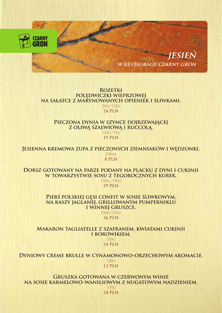 jesień w restauracji czarny groń Rozetki polędwiczki wieprzowej na sałatce z marynowanych opieniek i śliwkami. 80g/120g 24 PLN Pieczona dynia w szynce dojrzewającej z oliwą szałwiową i ruccolą. 120g/15g 19 PLN Jesienna kremowa zupa z pieczonych ziemniaków i wędzonki. 250ml 8 PLN Dorsz gotowany na parze podany na placku z dyni i cukinii w towarzystwie sosu z tegorocznych kurek. 150g/150g 29 PLN Pierś polskiej gęsi confit w sosie śliwkowym, na kaszy jaglanej, grillowanym pumperniklu i winnej gruszce. 150g/150g 36 PLN Makaron tagliatelle z szafranem, kwiatami cukinii i borowikiem. 250g 24 PLN Dyniowy creme brulle w cynamonowo-orzechowym aromacie. 120g 12 PLN Gruszka gotowana w czerwonym winie na sosie karmelowo-waniliowym z nugatowym nadzieniem. 170g 24 PLN