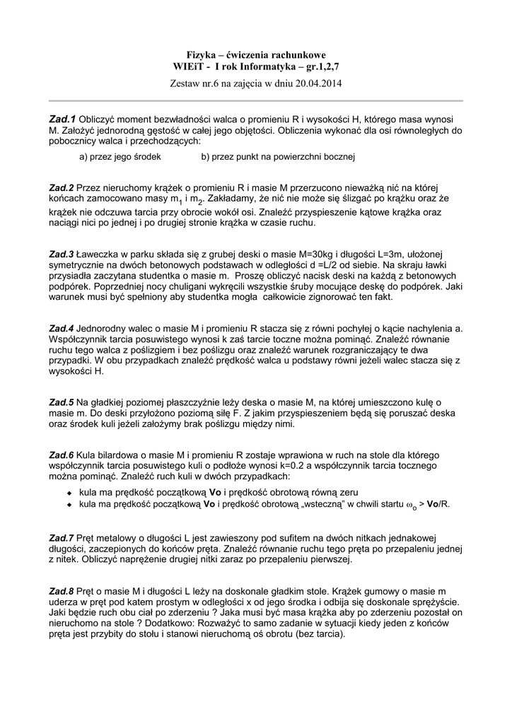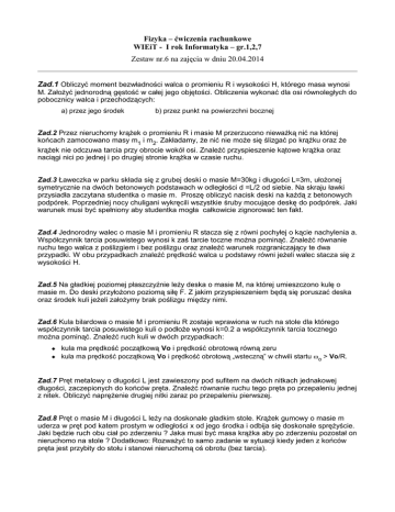 Fizyka – ćwiczenia rachunkowe WIEiT - I rok Informatyka – gr.1,2,7 Zestaw nr.6 na zajęcia w dniu 20.04.2014 Zad.1 Obliczyć moment bezwładności walca o promieniu R i wysokości H, którego masa wynosi M. Założyć jednorodną gęstość w całej jego objętości. Obliczenia wykonać dla osi równoległych do pobocznicy walca i przechodzących: a) przez jego środek b) przez punkt na powierzchni bocznej Zad.2 Przez nieruchomy krążek o promieniu R i masie M przerzucono nieważką nić na której końcach zamocowano masy m1 i m2. Zakładamy, że nić nie może się ślizgać po krążku oraz że krążek nie odczuwa tarcia przy obrocie wokół osi. Znaleźć przyspieszenie kątowe krążka oraz naciągi nici po jednej i po drugiej stronie krążka w czasie ruchu. Zad.3 Ławeczka w parku składa się z grubej deski o masie M=30kg i długości L=3m, ułożonej symetrycznie na dwóch betonowych podstawach w odległości d =L/2 od siebie. Na skraju ławki przysiadła zaczytana studentka o masie m. Proszę obliczyć nacisk deski na każdą z betonowych podpórek. Poprzedniej nocy chuligani wykręcili wszystkie śruby mocujące deskę do podpórek. Jaki warunek musi być spełniony aby studentka mogła całkowicie zignorować ten fakt. Zad.4 Jednorodny walec o masie M i promieniu R stacza się z równi pochyłej o kącie nachylenia a. Współczynnik tarcia posuwistego wynosi k zaś tarcie toczne można pominąć. Znaleźć równanie ruchu tego walca z poślizgiem i bez poślizgu oraz znaleźć warunek rozgraniczający te dwa przypadki. W obu przypadkach znaleźć prędkość walca u podstawy równi jeżeli walec stacza się z wysokości H. Zad.5 Na gładkiej poziomej płaszczyźnie leży deska o masie M, na której umieszczono kulę o masie m. Do deski przyłożono poziomą siłę F. Z jakim przyspieszeniem będą się poruszać deska oraz środek kuli jeżeli założymy brak poślizgu między nimi. Zad.6 Kula bilardowa o masie M i promieniu R zostaje wprawiona w ruch na stole dla którego współczynnik tarcia posuwistego kuli o podłoże wynosi k=0.2 a współczynnik tarcia tocznego można pominąć. Znaleźć ruch kuli w dwóch przypadkach: kula ma prędkość początkową Vo i prędkość obrotową równą zeru kula ma prędkość początkową Vo i prędkość obrotową „wsteczną” w chwili startu wo > Vo/R. Zad.7 Pręt metalowy o długości L jest zawieszony pod sufitem na dwóch nitkach jednakowej długości, zaczepionych do końców pręta. Znaleźć równanie ruchu tego pręta po przepaleniu jednej z nitek. Obliczyć naprężenie drugiej nitki zaraz po przepaleniu pierwszej. Zad.8 Pręt o masie M i długości L leży na doskonale gładkim stole. Krążek gumowy o masie m uderza w pręt pod katem prostym w odległości x od jego środka i odbija się doskonale sprężyście. Jaki będzie ruch obu ciał po zderzeniu ? Jaka musi być masa krążka aby po zderzeniu pozostał on nieruchomo na stole ? Dodatkowo: Rozważyć to samo zadanie w sytuacji kiedy jeden z końców pręta jest przybity do stołu i stanowi nieruchomą oś obrotu (bez tarcia).