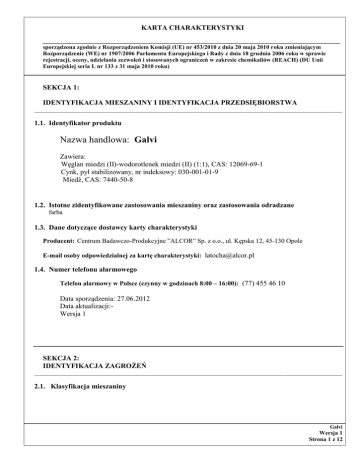 KARTA CHARAKTERYSTYKI __________________________________________________________________________________ sporządzona zgodnie z Rozporządzeniem Komisji (UE) nr 453/2010 z dnia 20 maja 2010 roku zmieniającym Rozporządzenie (WE) nr 1907/2006 Parlamentu Europejskiego i Rady z dnia 18 grudnia 2006 roku w sprawie rejestracji, oceny, udzielania zezwoleń i stosowanych ograniczeń w zakresie chemikaliów (REACH) (DU Unii Europejskiej seria L nr 133 z 31 maja 2010 roku) SEKCJA 1: IDENTYFIKACJA MIESZANINY I IDENTYFIKACJA PRZEDSIĘBIORSTWA ______________________________________________________________________________________________________ 1.1. Identyfikator produktu Nazwa handlowa: Galvi Zawiera: Węglan miedzi (II)-wodorotlenek miedzi (II) (1:1), CAS: 12069-69-1 Cynk, pył stabilizowany, nr indeksowy: 030-001-01-9 Miedź, CAS: 7440-50-8 1.2. Istotne zidentyfikowane zastosowania mieszaniny oraz zastosowania odradzane farba 1.3. Dane dotyczące dostawcy karty charakterystyki Producent: Centrum Badawczo-Produkcyjne ”ALCOR” Sp. z o.o., ul. Kępska 12, 45-130 Opole E-mail osoby odpowiedzialnej za kartę charakterystyki: [email protected] 1.4. Numer telefonu alarmowego Telefon alarmowy w Polsce (czynny w godzinach 8:00 – 16:00): (77) 455 46 10 Data sporządzenia: 27.06.2012 Data aktualizacji:Wersja 1 SEKCJA 2: IDENTYFIKACJA ZAGROŻEŃ ______________________________________________________________________________________________________ 2.1. Klasyfikacja mieszaniny Galvi Wersja 1 Strona 1 z 12 KARTA CHARAKTERYSTYKI __________________________________________________________________________________ sporządzona zgodnie z Rozporządzeniem Komisji (UE) nr 453/2010 z dnia 20 maja 2010 roku zmieniającym Rozporządzenie (WE) nr 1907/2006 Parlamentu Europejskiego i Rady z dnia 18 grudnia 2006 roku w sprawie rejestracji, oceny, udzielania zezwoleń i stosowanych ograniczeń w zakresie chemikaliów (REACH) (DU Unii Europejskiej seria L nr 133 z 31 maja 2010 roku) Szkodliwe skutki działania na zdrowie człowieka: Oczy: Nie stwarza zagrożeń. Skóra: Nie stwarza zagrożeń. Wdychanie: Nie stwarza zagrożeń. Skutki działania na środowisko: Produkt niebezpieczny dla środowiska; działa toksycznie na organizmy wodne, może powodować długo utrzymujące się niekorzystne zmiany w środowisku wodnym Skutki działania związane z właściwości fizykochemicznymi: nie stwarza zagrożeń. 2.2. Elementy oznakowania N niebezpieczny dla środowiska symbol: Zwroty wskazujące rodzaj zagrożenia: R51/53 Działa toksycznie na organizmy wodne, może powodować długo utrzymujące się niekorzystne zmiany w środowisku wodnym Zwroty określające warunki Bezpiecznego stosowania: S2 Chronić przed dziećmi S23 Nie wdychać rozpylonej cieczy S46 W razie połknięcia niezwłocznie zasięgnij porady lekarza - pokaż opakowanie lub etykietę S56 Zużyty produkt oraz opakowanie dostarczyć na składowisko odpadów niebezpiecznych S51 - Stosować wyłącznie w dobrze wentylowanych pomieszczeniach : Zawiera: węglan miedzi (II)-wodorotlenek miedzi (II) (1:1), cynk, miedź Zawiera (w produkcie gotowym do użycia): maksymalnie 30g/l lotnych związków organicznych 2.3. Inne zagrożenia Nie ma wystarczających podstaw do sklasyfikowania jako PBT i vPvB SEKCJA 3: SKŁAD / INFORMACJA O SKŁADNIKACH ______________________________________________________________________________________________________ 3.1. Identyfikator produktu: Galvi Zawiera: Węglan miedzi (II)-wodorotlenek miedzi (II) (1:1) Galvi Wersja 1 Strona 2 z 12 KARTA CHARAKTERYSTYKI __________________________________________________________________________________ sporządzona zgodnie z Rozporządzeniem Komisji (UE) nr 453/2010 z dnia 20 maja 2010 roku zmieniającym Rozporządzenie (WE) nr 1907/2006 Parlamentu Europejskiego i Rady z dnia 18 grudnia 2006 roku w sprawie rejestracji, oceny, udzielania zezwoleń i stosowanych ograniczeń w zakresie chemikaliów (REACH) (DU Unii Europejskiej seria L nr 133 z 31 maja 2010 roku) Cynk, pył stabilizowany Miedź 3.2.1. Węglan miedzi (II) – wodorotlenek miedzi (II) (1 : 1): Zakres stężeń: ˂2 % wag. Numer CAS: 12069-69-1 Numer WE (EINECS): 235-113-6 Numer rejestracji właściwej: nie podlega Klasyfikacja wg 67/548/EWG: R22, Xn; R50, N Klasyfikacja wg 1272/2008/WE: H302 Acute Tox.4, H400 Aquatic Acute 1 3.2.2. CYNK, pył stabilizowany: Zakres stężeń: ˂1 % wag. Numer CAS: 7440-66-6 Numer WE (EINECS): 231-175-3 (030-002-00-9) Numer rejestracji właściwej: 01-2119467174-37-XXXX Klasyfikacja wg 67/548/EWG: N; R50/53 Klasyfikacja wg 1272/2008/WE: H400, H410. 3.2.3. Miedź: Zakres stężeń: ˂ % wag. Numer CAS: 7440-50-8 Numer WE (EINECS): 231-159-6 Numer rejestracji właściwej: 01-2119480154-42-XXXX Klasyfikacja wg 67/548/EWG: nie podlega Klasyfikacja wg 1272/2008/WE: nie podlega SEKCJA 4: ŚRODKI PIERWSZEJ POMOCY ______________________________________________________________________________________________________ Galvi Wersja 1 Strona 3 z 12 KARTA CHARAKTERYSTYKI __________________________________________________________________________________ sporządzona zgodnie z Rozporządzeniem Komisji (UE) nr 453/2010 z dnia 20 maja 2010 roku zmieniającym Rozporządzenie (WE) nr 1907/2006 Parlamentu Europejskiego i Rady z dnia 18 grudnia 2006 roku w sprawie rejestracji, oceny, udzielania zezwoleń i stosowanych ograniczeń w zakresie chemikaliów (REACH) (DU Unii Europejskiej seria L nr 133 z 31 maja 2010 roku) 4.1. Opis środków pierwszej pomocy Usunąć szkła kontaktowe, natychmiast płukać dużą ilością wody przez 15 minut. Jeżeli wystąpią jakiekolwiek podrażnienia skonsultować się z lekarzem. Kontakt ze skórą: Obficie zmywać letnią, bieżącą wodą i mydłem. Zdjąć zanieczyszczoną odzież. Nie używać rozpuszczalników lub rozcieńczalników. Jeśli podrażnienie nie ustępuje, zasięgnąć porady lekarza. Ogólne zalecenia: Powinny być przestrzegane zwykłe środki ostrożności jak przy pracy z ch