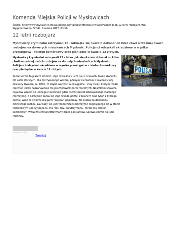Komenda Miejska Policji w Mysłowicach Źródło: http://www.myslowice.slaska.policja.gov.pl/k16/informacje/wiadomosci/44436,12-letni-rozbojarz.html Wygenerowano: Środa, 8 marca 2017, 03:56 12 letni rozbojarz Mysłowiccy kryminalni zatrzymali 12 - latka.Jak się okazało dokonał on kilka chwil wcześniej dwóch rozbojów na dorosłych mieszkańcach Mysłowic. Policjanci odzyskali skradzione w wyniku przestępstw - telefon komórkowy oraz pieniądze w kwocie 12 złotych. Mysłowiccy kryminalni zatrzymali 12 - latka. Jak się okazało dokonał on kilka chwil wcześniej dwóch rozbojów na dorosłych mieszkańcach Mysłowic. Policjanci odzyskali skradzione w wyniku przestępstw - telefon komórkowy oraz pieniądze w kwocie 12 złotych. Teoretycznie to jeszcze dziecko. Jego rówieśnicy uczą się w szkołach, także szacunku dla osób starszych. Dla zatrzymanego wczoraj póżnym wieczorem w mysłowickiej dzielnicy Rymera 12- latka, to chyba wartości nieosiągalne - inny świat, którym rządzi przemoc i brak poszanowania dla jakichkolwiek norm moralnych. Nastoletni sprawca najpierw wszedł do jednego z mieszkań gdzie steroryzował schorowanego starszego mężczyznę, a następnie zabrał na jego szkodę portfel z bilonem oraz tytoń z którego póżniej wraz ze swoimi kolegami "skręcał" papierosy. Na krótko po dokonaniu pierwszego rozboju zauważył na ulicy Robotniczej mężczyznę znajdującego się w stanie nietrzeżwym i po wykręceniu mu rąk i tzw. przytrzymaniu, skradł mu telefon komórkowy. Wówczas został zatrzymany przez policjantów. Sprawą zajmie się sąd rodzinny. Ocena: 0/5 (0) Tweetnij