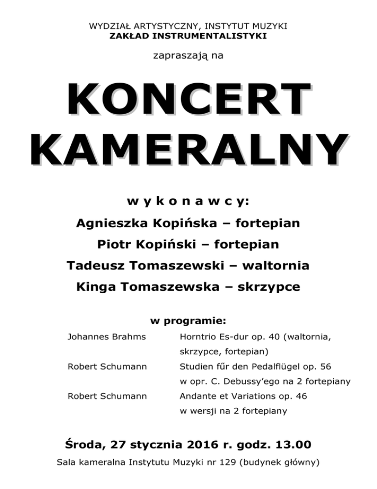 WYDZIAŁ ARTYSTYCZNY, INSTYTUT MUZYKI ZAKŁAD INSTRUMENTALISTYKI zapraszają na KONCERT KAME RALNY w y k o n a w c y: Agnieszka Kopińska – fortepian Piotr Kopiński – fortepian Tadeusz Tomaszewski – waltornia Kinga Tomaszewska – skrzypce w programie: Johannes Brahms Horntrio Es-dur op. 40 (waltornia, skrzypce, fortepian) Robert Schumann Studien fűr den Pedalflügel op. 56 w opr. C. Debussy’ego na 2 fortepiany Robert Schumann Andante et Variations op. 46 w wersji na 2 fortepiany Środa, 27 stycznia 2016 r. godz. 13.00 Sala kameralna Instytutu Muzyki nr 129 (budynek główny)