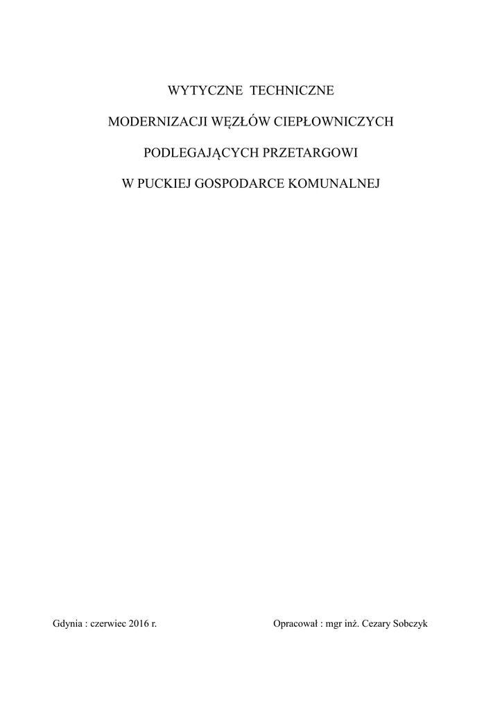 WYTYCZNE TECHNICZNE MODERNIZACJI WĘZŁÓW CIEPŁOWNICZYCH PODLEGAJĄCYCH PRZETARGOWI W PUCKIEJ GOSPODARCE KOMUNALNEJ Gdynia : czerwiec 2016 r. Opracował : mgr inż. Cezary Sobczyk ZAŁĄCZNIK TECHNICZNY DO PRZETARGU NA MODERNIZACJE WĘZŁÓW CIEPŁOWNICZYCH DLA PUCKIEJ GOSPODARKI KOMUNALNEJ Sp z o. o. I. Dane ogólne dla wszystkich węzłów : - parametry sieci : – – – – – – – – zima – 90/600 C lato - 70/300 C - parametry instalacji : 80/600 C ciepła woda użytkowa : 5/550 C na wejściu wysokich i powrocie niskich parametrów magnetoodmulacze lub filtroodmulniki pompy Grundfos ze zmianą obrotów jeden pomiar ciepła dla stacji wodomierz na przewodzie wody zimnej do wymiennika liczniki ciepła Kamastrup na wejściu regulator różnicy ciśnień i przepływu uzupełnianie zładu – z powrotu wysokich parametrów z wodomierzem naczynia ciśnieniowe - Reflex II. Zapotrzebowanie ciepła : - dla 5 budynków Spółdzielni : Derdowskiego 2, 4 oraz Przebendowskiego 21 , 23 , 25 Qco = 65 kW Qcwu = 90 kW - budynek Gimnazjum Publicznego : Qco = 130 kW Qcwu = 130 kW praca wymiennika cwu w kaskadzie z rozdziałem przepływu 30/70% (dwa zawory regulacyjne) - budynek Lipowa 7 : Qco = 20 kW Qcwu = 30 kW - budynek Przebendowskiego 19 Qco = 100 kW Qcwu = 90 kW - budynek Derdowskiego 1 Qco = 85 kW Qcwu = 80 kW - budynek Derdowskiego 3 Qco = 80 kW Qcwu = 80 kW III. Zakres prac objętych przetargiem. Projektowane stacje montowane będą w istniejących pomieszczeniach węzłów, gdzie budynki zasilane są bezpośrednio z sieci zarówno na co jak i doprowadzona jest ciepła woda użytkowa i cyrkulacja cwu. Pomieszczenia węzłów wymagają odpowiedniego przygotowania w zakresie robót technologicznych , budowlanych, sanitarnych oraz elektrycznych. W zakresie prac przewidzianych do wykonania przetargiem przewiduje się następujące zakresy robót : Zakres prac technologicznych przewiduje : a. demontaż istniejących układów zasilania budynków w pomieszczeniach węzłów (przewodów, armatury, kolektorów) b. montaż wymienników, c. montaż zespołów pompowych, d. wymianę istniejących rozdzielaczy z montażem zaworów odcinających na zasilaniu i zaworów regulacyjno – odcinających na powrocie rozdzielaczy, e. montaż rurociągów technologicznych (co i cwu) wraz z izolacją łupkową Zakres prac wodociągowo - kanalizacyjnych i wentylacji przewiduje : a. sprawdzenie prawidłowości działania instalacji kanalizacji (o ile jest w węźle), b. wykonanie instalacji wodociągowej – doprowadzenie przewodu zimnej wody do stacji wymienników, c. wykonanie instalacji wentylacyjnej (jeżeli jej nie ma). Zakres prac budowlanych przewiduje remont pomieszczeń węzłów (8 szt.) - na podstawie obmiaru Wykonawcy, w tym: a. Zeskrobanie i zmycie starej farby z powierzchni ścian b. Przygotowanie pod malowanie farbami emulsyjnymi starych tynków z poszpachlowaniem nierówności i uzupełnieniem ubytków na wszystkich powierzchniach c. Dwukrotne malowanie farbami emulsyjnymi powierzchni ścian, sufitu d. Uzupełnienie ubytków w posadzce cementowej z zatarciem na gładko e. Gruntowanie posadzki i malowanie farbą akrylową lub epoksydową o wysokiej odporności na wilgoć i ścieranie w kolorze uzgodnionym z Zamawiającym f. Wymiana istniejących drzwi wejściowych do stacji w tym: - demontaż istniejącej stolarki drewnianej wewnętrznej - montaż nowych drzwi (w 8 pomieszczeniach węzłów): szerokość 90 cm, wysokość 205 cm, pełne stalowe, wewnętrzne z futryną koloru szarego, wkładka patentowa, komplet kluczy (klucz matka 5 szt.), drzwi lewe 4 szt. prawe 4 szt., kompletna obróbka ścian otworu drzwiowego do stanu pierwotnego Zakres prac elektroenergetycznych przewiduje : a. doprowadzenie przewodu zasilania pomp do stacji, o ile go nie ma b. dokonanie montażu nowej rozdzielni, c. podłączenie pomp, d. wykonanie instalacji sterowniczej i sygnalizacyjnej. Zakres prac dodatkowych: Dostawa radiowego systemu odczytu ciepłomierzy zainstalowanych w nowych węzłach, w tym: a. głowica radiowa z odbiorczym modułem radiowym 868MHz, b. praca w trybie jednokierunkowym c. tablet z zainstalowanym oprogramowaniem odczytowym IZAR MOBILE d. aplikacja IZAR@NET do zainstalowania na komputerze odczytowym Zamawiający wymaga by elementy nadawcze lub nadawczo-odbiorcze systemu odczytu radiowego liczników ciepła spełniały wymagania aktywności nadajnika zgodnie z Rozporządzeniem Ministra Transportu z dnia 3 lipca 2007 r. w sprawie urządzeń radiowych nadawczych i nadawczo odbiorczych, które mogą być używane bez pozwolenia radiowego (Dz. U. nr 138 poz. 972). IV. Schematy technologiczne poszczególnych węzłów z przykładowym doborem urządzeń. UWAGA! Nazwy własne produktów, producentów, znaki towarowe, patenty lub pochodzenie zostały użyte w celu określenia parametrów technicznych poszczególnych elementów. Dopuszcza się zastosowanie rozwiązań „równoważnych” o parametrach nie gorszych niż te, które zostały opisane w dokumentacji i posiadających wymagane certyfikaty. Zastosowanie rozwiązań innych niż projektowane wymaga akceptacji projektanta i inwestora. Zestawienie materiałów węzeł wymiennikowy dla budynków mieszkalnych : − ul. Derdowskiego 2 − ul. Derdowskiego 4 − ul. Przebendowskiego 21 − ul. Przebendowskiego 23 − ul. Przebendowskiego 25 UWAGA! Nazwy własne produktów, producentów, znaki towarowe, patenty lub pochodzenie zostały użyte w celu określenia parametrów technicznych poszczególnych elementów. Dopuszcza się zastosowanie rozwiązań „równoważnych” o parametrach nie gorszych niż te, które zostały opisane w dokumentacji i posiadających wymagane certyfikaty. Zastosowanie rozwiązań innych niż projektowane wymaga akceptacji projektanta i inwestora Lp. Materiał Ilość Producent/ 1 Wymiennik płytowy XB37M-1-36 G 1 (20mm) 1 DANFOSS 2 Wymiennik płytowy XB12M-1-26 G 5/4 (25mm) 1 DANFOSS 3 Filtroodmulnik FO2M, kvs 19.3, PN16,