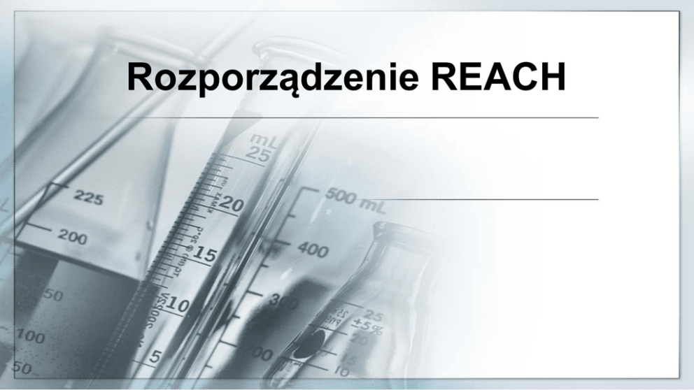 Rozporządzenie REACH Rozporządzenie REACH REACH (Registration, Evaluation and Authorisation of Chemicals; Rejestracja, Ocena i Autoryzacja Chemikaliów) Rozporządzenie Parlamentu Europejskiego i Rady (WE 1907/2006) dotyczące bezpiecznego stosowania chemikaliów poprzez ich rejestrację, ocenę oraz w niektórych przypadkach udzielanie zezwoleń lub ograniczeń obrotu Rozporządzenie REACH Rozporządzenie REACH obowiązuje w Europejskim Obszarze Gospodarczym (Unii Europejskia, Norwegia, Islandia i Liechtenstein) rejestracja substancji chemicznych będących w obrocie rejestracja substancji chemicznych wprowadzanych do obrotu (nowych) Rozporządzenie REACH Podstawowe cele REACH 1. Ochrona zdrowia ludzkiego i środowiska naturalnego 2. Ograniczenie do minimum badań na zwierzętach kręgowych 3. Utrzymanie i wzmocnienie konkurencyjności europejskiego przemysłu chemicznego 4. Zapobieganie fragmentaryzacji rynku wewnętrznego 5. Integracja działań europejskich z działaniami światowymi Rozporządzenie REACH Przepisy REACH oparte są o zasadę ostrożności Producenci (importerzy i dalsi użytkownicy) gwarantują, że substancje, które produkują (wprowadzają do obrotu lub stosują) nie wpływają w sposób szkodliwy na zdrowie człowieka ani na środowisko. Rozporządzenie REACH REACH przenosi ciężar zapewnienia bezpieczeństwa stosowania i użytkowania substancji chemicznych, będących w obrocie rynkowym, z organów władzy publicznej na przedsiębiorców Rozporządzenie REACH Obowiązek rejestracji substancji w REACH dotyczy: • Producentów substancji chemicznych z EOG i wytwarzających te substancje w EOG w ilościach ponad 1 tonę rocznie • Importerów substancji chemicznych z EOG i wprowadzających te substancje na obszar celny EOG w ilościach ponad 1 tonę rocznie Rozporządzenie REACH Obowiązek rejestracji substancji w REACH dotyczy: • Wytwórców i importerów wyrobów w których substancja zawarta jest w ilości łącznej ponad 1 tonę rocznie i zamierzone jest jej uwalnianie podczas normalnych warunków stosowania • Wytwórców i importerów wyrobów w których zawarte są substancje wzbudzająca szczególne obawy w ilości >0,1% (np. DMF, siarczan dimetylu, związki kadmu i ołowiu) i łączne ilości tych substancji w wyrobach wynosi ponad 1 tonę rocznie Co to jest wyrób? Definicja wyrobu wg REACH Wyrób: oznacza przedmiot, który podczas produkcji otrzymuje określony kształt, powierzchnię, konstrukcję lub wygląd zewnętrzny, co decyduje o jego funkcji w stopniu większym niż jego skład chemiczny. Co to jest substancja? Definicja substancji wg REACH Pierwiastek chemiczny i jego związki w stanie, w jakim występują w przyrodzie lub zostają uzyskane za pomocą procesu produkcyjnego, z wszelkimi dodatkami wymaganymi do zachowania ich trwałości oraz wszelkimi zanieczyszczeniami powstałymi w wyniku zastosowanego procesu, wyłączając rozpuszczalniki, które można oddzielić bez wpływu na stabilność i skład substancji Rejestracji podlegają tylko substancje, a nie mieszaniny czy wyroby Co to jest substancja? Substancja musi (może) zawierać Co najmniej jeden główny składnik (związek o zawartości >10%) Zanieczyszczenia (niezamierzone składniki powstające w ramach procesu produkcyjnego lub pochodzące z materiału bądź materiałów wyjściowych) – powinny być definiowane, gdy ich zawartość jest >1% lub mają wpływ na klasyfikację substancji (niezależnie od zawartości) Dodatki (składniki celowo dodawane dla utrwalenia substancji, i jedynie w takim celu) Co to jest substancja? Rodzaje substancji jednoskładnikowa – jeden główny składnik lub gdy kilka głównych składników jeden z nich o zawartości ≥80%wag wieloskładnikowa – kilka głównych składników UVCB (Unknown, Variable Composition, Biological) ‒ skład w znacznej części jest nieznany ‒ trudno przewidywalna zmienność składu ‒ materiał biologiczny Co to jest substancja? Przykłady Skład toluen 95%, etylobenzen 5% Substancja jednoskładnikowa o-ksylen 75%, p-ksylen 20% wieloskładnikowa olej rzepakowy UVCB o-ksylen 85%, p-ksylen 12%, m-ksylen 3% jednoskładnikowa liniowe kwasy tłuszczowe C8-C16 UVCB peroksydiwęglan dietylu w izododekanie jednoskładnikowa Co to jest substancja? Mieszanina, a substancja wieloskładnikowa Substancja wieloskładnikowa – wynik reakcji chemicznej Mieszanina – zmieszanie dwóch lub większej liczby substancji bez reakcji chemicznej (np. farby, lakiery, tusze) Każda substancja zawarta w mieszaninie podlega rejestracji Zwolnienia z obowiązków REACH Substancje NIE OBJĘTE rozporządzeniem REACH: radioaktywne objętych dyrektywą Rady 96/29/Euratom półprodukty niewyodrębniane odpady tranzytowane lub pod nadzorem celnym w postaci własnej, jako składniki mieszanin lub w wyrobach Zwolnienia z obowiązków REACH REACH nie dotyczy substancji do produkcji środków ochrony roślin produktów biobójczych produktów leczniczych kosmetyków dodatków do żywności lub pasz substancji pozyskiwanych z przyrody, o ile nie są niebezpieczne i nie zostały chemicznie zmodyfikowane Rozporządzenie REACH Substancje chemiczne rejestruje Europejska Agencja Chemikaliów (ECHA - European Chemicals Agency) Obowiązki producentów(importerów) Zidentyfikowanie ilość wytwarzanej/importowanej substancji Określenie charakteru substancji: – stosowalność rozporządzenia REACH – substancja w postaci własnej czy składnik preparatu Gromadzenie istniejących danych dotyczących substancji Gromadzenie opisów metod analitycznych identyfikujących substancję, jej zanieczyszczenia lub dodatki Rejestracja substancji Rejestracja wstępna (Producent/Importer substancji lub wyrobów) Wymiana informacji (Producent/Importer/Dystrybutor substancji lub wyrobów) Dyskusje w Pre-SIEF (wszyscy, którzy rejestrowali wstępnie) Dyskusje w SIEF (wszyscy planujący wspólną rejestrację) Rejestracja właściwa (Producent/Importer substancji lu