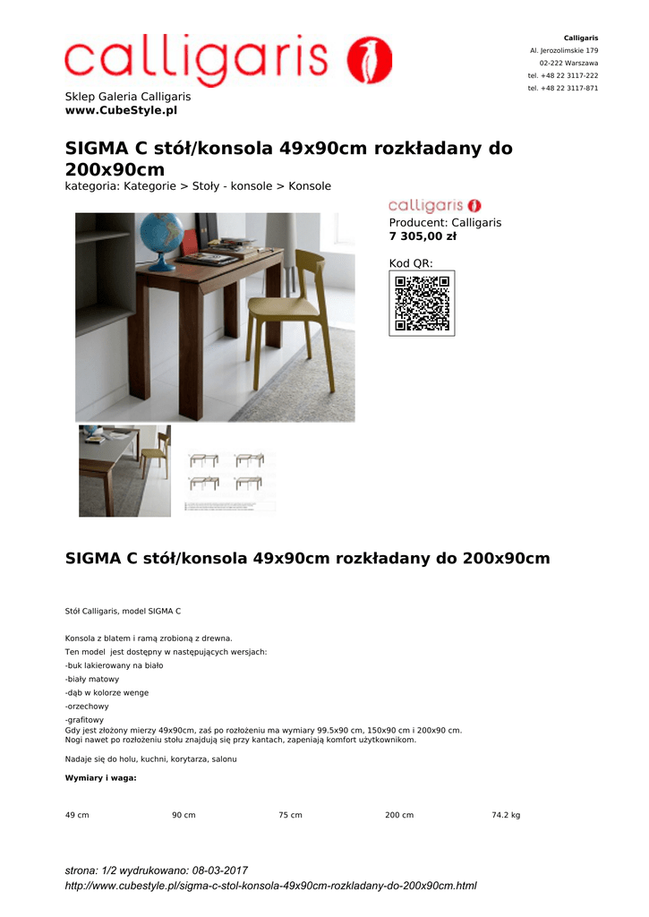 Calligaris Al. Jerozolimskie 179 02-222 Warszawa tel. +48 22 3117-222 tel. +48 22 3117-871 Sklep Galeria Calligaris www.CubeStyle.pl SIGMA C stół/konsola 49x90cm rozkładany do 200x90cm kategoria: Kategorie > Stoły - konsole > Konsole Producent: Calligaris 7 305,00 zł Kod QR: SIGMA C stół/konsola 49x90cm rozkładany do 200x90cm Stół Calligaris, model SIGMA C Konsola z blatem i ramą zrobioną z drewna. Ten model jest dostępny w następujących wersjach: -buk lakierowany na biało -biały matowy -dąb w kolorze wenge -orzechowy -grafitowy Gdy jest złożony mierzy 49x90cm, zaś po rozłożeniu ma wymiary 99.5x90 cm, 150x90 cm i 200x90 cm. Nogi nawet po rozłożeniu stołu znajdują się przy kantach, zapeniają komfort użytkownikom. Nadaje się do holu, kuchni, korytarza, salonu Wymiary i waga: 49 cm 90 cm 75 cm 200 cm strona: 1/2 wydrukowano: 08-03-2017 http://www.cubestyle.pl/sigma-c-stol-konsola-49x90cm-rozkladany-do-200x90cm.html 74.2 kg Czas dostawy: 6-8 tygodni Dostępne wersje: Multi-laminar veneer strona: 2/2 wydrukowano: 08-03-2017 http://www.cubestyle.pl/sigma-c-stol-konsola-49x90cm-rozkladany-do-200x90cm.html