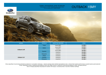 CENNIK | WYPOSAŻENIE | DANE TECHNICZNE Obowiązuje od 01.06.2015. Wszystkie ceny są cenami brutto. Kurs na czerwiec 2015: 4,0606 PLN/EUR. MODEL WERSJA SKRZYNIA BIEGÓW CENA Trend manual (6MT) 34 400 € manual (6MT) 35 900 € Lineartronic 37 900 € manual (6MT) 38 400 € Lineartronic 40 400 € Exclusive Lineartronic 42 400 € Active Outback 2.0D Comfort Outback 2.5i OUTBACK 15MY Active Lineartronic 35 900 € Comfort Lineartronic 38 400 € Exclusive Lineartronic 40 400 € Arkusz specyfikacji nie jest wersją potwierdzoną ostatecznie i ma charakter orientacyjny – importer zastrzega sobie możliwość wprowadzenia zmian, o których klient zostanie poinformowany w sposób wyraźny przed zawarciem umowy. Wyposażenie seryjne i dodatkowe poszczególnych wersji może ulegać zmianom w zależności od potrzeb poszczególnych rynków i wymogów prawnych. Dane w niniejszej specyfikacji mają wyłącznie charakter informacyjny, nie stanowią oferty w rozumieniu Kodeksu Cywilnego. -2- Outback 2.5i Outback 2.0D WYPOSAŻENIE Active Trend Comfort Exclusive Active Comfort Exclusive 6MT 6MT Lineartronic 6MT Lineartronic Lineartronic Lineartronic Lineartronic Lineartronic WYPOSAŻENIE WNĘTRZA demontowalna roleta bagażnika elektrycznie otwierana pokrywa bagażnika elektrycznie sterowane okno dachowe elektrycznie sterowane szyby we wszystkich drzwiach fotel kierowcy regulowany elektrycznie fotel kierowcy z elektryczną regulacją oparcia odcinka lędźwiowego kręgosłupa fotel kierowcy z pamięcią ustawień fotel pasażera z regulacją wysokości gałka dźwigni zmiany biegów obszyta skórą gniazdo AUX-IN dla zewnętrznego odtwarzacza MP3 kamera cofania kierownica obszyta skórą kieszenie w drzwiach z uchwytami na napoje klimatyzacja automatyczna dwustrefowa kolumna kierownicy regulowana w 2 płaszczyznach konsola centralna z gniazdem 12V konsola centralna ze schowkiem konsola dachowa ze schowkiem lampki do czytania z przodu listwy ozdobne kokpitu manetki zmiany biegów przy kierownicy nawigacja z ekranem dotykowym obrotomierz oparcia tylnych foteli dzielone w proporcji 60:40 i składane jednym dotknięciem oparcia tylnych foteli z regulacją kąta nachylenia oświetlenie kabiny z wyłącznikiem czasowym oświetlenie przestrzeni bagażowej podgrzewane fotele przednie podłokietnik w tylnym rzędzie siedzeń podświetlane lusterka w osłonach przeciwsłonecznych radio cyfrowe skórzana tapicerka (częściowo) system audio Harman/Kardon z 12 głośnikami system audio z CD, z obsługą urządzeń USB i 6 głośnikami system audio z przyciskami sterowania w kierownicy system audio z wejściem USB i funkcją Bluetooth system głośnomówiący system informacyjno-rozrywkowy SUBARU STARLINK system montażu fotelików dziecięcych ISOFIX tempomat z przyciskami sterowania w kierownicy termometr zewnętrzny uchwyty na napoje z przodu i z tyłu uruchamianie silnika za naciśnięciem przycisku Start/Stop wycieraczki przedniej szyby z czujnikiem deszczu wylot powietrza w tylnej części kabiny w konsoli środkowej zabezpieczenie tylnych drzwi przed otwarciem przez dzieci zegar cyfrowy zestaw naprawczy do kół z kompresorem wyposażenie seryjne wyposażenie niedostępne Subaru Import Polska sp. z o.o. podjęło wszelkie środki, aby zawarte w niniejszej specyfikacji informacje były dokładne i aktualne w chwili oddania do druku. W ramach polityki stałego ulepszania swoich produktów Subaru zastrzega sobie prawo do zmiany specyfikacji i wyposażenia opisanych i przedstawionych pojazdów bez uprzedzenia. O zmianach tych autoryzowani partnerzy Subaru będą powiadamiani w możliwie najkrótszym terminie. Każda zmiana wyposażenia i specyfikacji zostanie wyraźnie przedstawiona Państwu przed zawarciem umowy ze sprzedawcą. Niniejsza specyfikacja nie stanowią oferty w rozumieniu Kodeksu Cywilnego. -3- Outback 2.5i Outback 2.0D WYPOSAŻENIE Active Trend Comfort Exclusive Active Comfort Exclusive 6MT 6MT Lineartronic 6MT Lineartronic Lineartronic Lineartronic Lineartronic Lineartronic WYPOSAŻENIE ZEWNĘTRZNE antena radiowa w szybie czujnik światła dla automatycznej aktywacji świateł mijania lusterka zewnętrzne podgrzewane, składne i regulowane elektrycznie lusterka zewnętrzne w kolorze nadwozia lusterka zewnętrzne z wbudowanymi kierunkowskazami podgrzewana szyba przednia w miejscu spoczynku piór wycieraczek podgrzewanie tylnej szyby przednie reflektory halogenowe przednie reflektory LED* z automatycznym poziomowaniem przyciemniane szyby tylne reflektory przeciwmgłowe relingi dachowe spryskiwacze reflektorów przednich system klucza elektronicznego Keyless Access światła do jazdy dziennej szyby atermiczne wycieraczka szyby tylnej z regulowaną prędkością (ze spryskiwaczem) zdalnie sterowany centralny zamek zderzaki w kolorze nadwozia TECHNIKA / BEZPIECZEŃSTWO 17-calowe felgi aluminiowe 18-calowe felgi aluminiowe 3-punktowe pasy bezpieczeństwa ABS Active Torque Vectoring ASSISTANCE elektroniczny hamulec postojowy hamulce tarczowe przednie i tylne (wentylowane) Hill Descent Control (kontrola zjazdu ze wzniesienia) immobilizer Inteligentny System Ratunkowy (ISR) Inteligentny System Ratunkowy używając sygnału GPS przekazuje automatycznie w sytuacji awaryjnej informację do stale funkcjonującego centrum monitoringu. Umożliwia to natychmiastowe zweryfikowanie zdarzenia i powiadomienie właściwych służb w celu szybkiej i sprawnej organizacji pomocy. kolanowa poduszka powietrzna po stronie kierowcy kurtyny powietrzne (przód / tył) napinacze pasów bezpieczeństwa przednie i boczne poduszki powietrzne ze zintegrowanymi kurtynami powietrznymi regulacja wysokości przednich pasów bezpieczeństwa SI-DRIVE (2 tryby) skrzynia biegów automatyczna bezstopniowa Lineartronic skrzynia biegów manualna sześciobiegowa stały napęd wszystkich kół Symmetrical AWD system AUTO START/STOP System EyeSight z funkcją adaptacyjnego tempomatu system kontroli trakcji i stabilizacji toru jazdy (VDCS) 