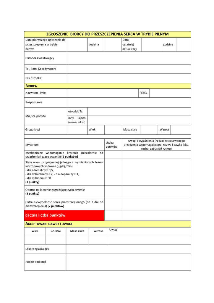 ZGŁOSZENIE BIORCY DO PRZESZCZEPIENIA SERCA W TRYBIE PILNYM Data pierwszego zgłoszenia do przeszczepienia w trybie pilnym godzina Data ostatniej aktualizacji godzina Ośrodek kwalifikujący Tel. kom. Koordynatora Fax ośrodka BIORCA Nazwisko i imię PESEL Rozpoznanie ośrodek Tx Miejsce pobytu inny Szpital (nazwa, adres) Grupa krwi Wiek Wzrost Masa ciała Liczba punktów Uwagi i wyjaśnienia (rodzaj zastosowanego urządzenia wspomagającego, nazwa i dawka leku, rodzaj zaburzeń rytmu) Kryterium Mechaniczne wspomaganie krążenia (niezależnie od urządzenia i czasu trwania) (5 punktów) Stały wlew przynajmniej jednego z wymienionych leków inotropowych w dawce (µg/kg/min): ‐ dla adrenaliny ≥ 0,5, ‐ dla dobutaminy ≥ 7, ‐ dla dopaminy ≥ 4, ‐ dla milrinonu ≥ 50 (3 punkty) Oporne na leczenie zagrażające życiu arytmie (3 punkty) Ostra niewydolność serca przeszczepionego (do 7 dni od przeszczepienia) (7 punktów) Łączna liczba punktów AKCEPTOWANI DAWCY I UWAGI Wiek Gr. krwi Masa ciała Lekarz zgłaszający Podpis i pieczęć Wzrost Uwagi: