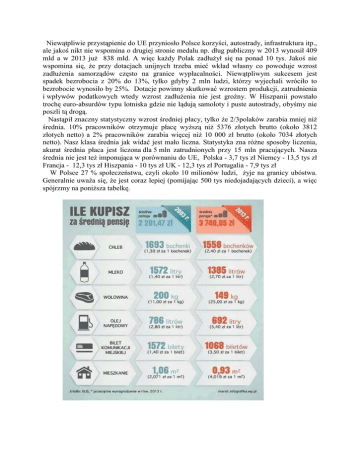 Niewątpliwie przystąpienie do UE przyniosło Polsce korzyści, autostrady, infrastruktura itp., ale jakoś nikt nie wspomina o drugiej stronie medalu np. dług publiczny w 2013 wynosił 409 mld a w 2013 juŜ 838 mld. A więc kaŜdy Polak zadłuŜył się na ponad 10 tys. Jakoś nie wspomina się, Ŝe przy dotacjach unijnych trzeba mieć wkład własny co powoduje wzrost zadłuŜenia samorządów często na granice wypłacalności. Niewątpliwym sukcesem jest spadek bezrobocia z 20% do 13%, tylko gdyby 2 mln ludzi, którzy wyjechali wróciło to bezrobocie wynosiło by 25%. Dotacje powinny skutkować wzrostem produkcji, zatrudnienia i wpływów podatkowych wtedy wzrost zadłuŜenia nie jest groźny. W Hiszpanii powstało trochę euro-absurdów typu lotniska gdzie nie lądują samoloty i puste autostrady, obyśmy nie poszli tą drogą. Nastąpił znaczny statystyczny wzrost średniej płacy, tylko Ŝe 2/3polaków zarabia mniej niŜ średnia. 10% pracowników otrzymuje płacę wyŜszą niŜ 5376 złotych brutto (około 3812 złotych netto) a 2% pracowników zarabia więcej niŜ 10 000 zł brutto (około 7034 złotych netto). Nasz klasa średnia jak widać jest mało liczna. Statystyka zna róŜne sposoby liczenia, akurat średnia płaca jest liczona dla 5 mln zatrudnionych przy 15 mln pracujących. Nasza średnia nie jest teŜ imponująca w porównaniu do UE, Polska - 3,7 tys zł Niemcy - 13,5 tys zł Francja - 12,3 tys zł Hiszpania - 10 tys zł UK - 12,3 tys zł Portugalia - 7,9 tys zł W Polsce 27 % społeczeństwa, czyli około 10 milionów ludzi, Ŝyje na granicy ubóstwa. Generalnie uwaŜa się, Ŝe jest coraz lepiej (pomijając 500 tys niedojadających dzieci), a więc spójrzmy na poniŜsza tabelkę. 70% polaków nie ma Ŝadnych oszczędności W 2004 r. Polacy mieli jakieś 120 mld zł zadłuŜenia. Dziś jesteśmy juŜ zadłuŜeni na 460 mld zł, prawie cztery razy więcej. Kredyty mieszkaniowe wzrosły w tym czasie ośmiokrotnie. O kondycji finansowej moŜe świadczyć fakt, Ŝe 2004 roku egzekucji komorniczych było 1 665 000 a w ubiegłym roku juŜ 6 100 000! W 2013 roku do egzekucji było prawie 73,5 mld zł. Powszechnie zwraca się uwagę na pozytywne skutki przystąpienia do UE. Organizowane są z tej okazji konferencje i podsumowania.. UwaŜamy, Ŝe czas, Ŝeby zastanowić się nad poraŜkami i wyciągnąć z nich wnioski na przyszłość. Polskie rolnictwo jest znaczącym eksporterem i nie ma tu duŜego kapitału obcego, dlatego największą naszą poraŜką jest fakt, Ŝe przez 10 lat nie udało zrównać się dopłat. Nie wykorzystaliśmy do tego reformy Wspólnej Polityki Rolnej, ani polskiej prezydencji. Polscy rolnicy otrzymują duŜo mniejsze dopłaty i mogą konkurować tylko tanią siłą roboczą. Polska przeznacza na naukę 0,5% PKB a Niemcy 2,5% PKB są przy 3-krotnie większym PKB Niemiec daje nam 15- krotnie mniejsze nakłady, Bez nauki Polska nigdy nie dogoni UE. Dla przykładu w ramach Unii płacimy składkę na badania kosmiczne, które później są rozdzielane na poszczególne kraje. Polska otrzymuje 0,3% płaconej składki. Czołowe polskie uczelnie są w 4 setce w światowych rankingach. W latach 2014-2020 mamy dostać z Unii Europejskiej ponad 400 mld złotych Polska musi wpłacić do unijnej kasy 200 mld złotych jako składkę. A więc rocznie mamy ok. 35 mld netto Mamy ok. 200tys. osób zatrudnianych przy podziale tych dotacji, moŜna szacować, Ŝe kosztuje to ok. 20 mld. Czyli to co pozostaje nie jest juŜ taka imponującą liczbą. Mimo dekady nie nauczyliśmy się sprawnie zabezpieczać naszych interesów.. Za często stajemy się rzecznikiem innych, nie zabezpieczając przy tym swoich interesów. Powinna odbyć się dyskusja o słabych stronach funkcjonowania Polski w Unii Europejskiej przez 10 lat członkowstwa co przyczyni się do wyciągnięcia wniosków, które pozwolą w przyszłości popełniać mniej błędów. Trzeba budować silny własny przemysł eksportowy produkujący dobra końcowe zawierające wysoką wartość dodaną. Ta produkcja powinna być realizowana przez własne, krajowe przedsiębiorstwa, gdyŜ wtedy wypracowane zyski pozostaną w kraju i będą słuŜyły jego rozwojowi. Jako biedny kraj na dorobku nie stać nas na popełnianie tych samych błędów przez lata. Środki z EU mają nam zapewnić skok cywilizacyjny. Druga taka szansa się nie powtórzy.