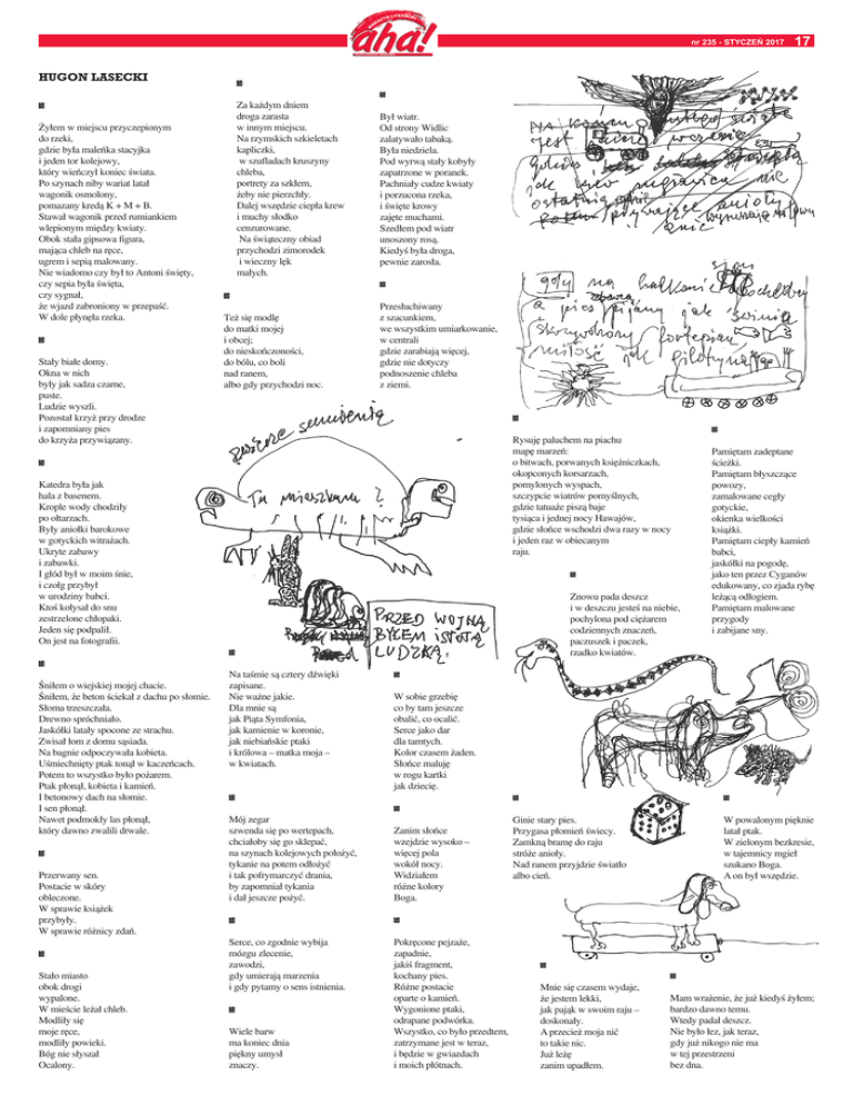 nr 235 - STYCZEŃ 2017 17 HUGON LASECKI Żyłem w miejscu przyczepionym do rzeki, gdzie była maleńka stacyjka i jeden tor kolejowy, który wieńczył koniec świata. Po szynach niby wariat latał wagonik osmolony, pomazany kredą K + M + B. Stawał wagonik przed rumiankiem wlepionym między kwiaty. Obok stała gipsowa figura, mająca chleb na ręce, ugrem i sepią malowany. Nie wiadomo czy był to Antoni święty, czy sepia była święta, czy sygnał, że wjazd zabroniony w przepaść. W dole płynęła rzeka. Stały białe domy. Okna w nich były jak sadza czarne, puste. Ludzie wyszli. Pozostał krzyż przy drodze i zapomniany pies do krzyża przywiązany. Za każdym dniem droga zarasta w innym miejscu. Na rzymskich szkieletach kapliczki, w szufladach kruszyny chleba, portrety za szkłem, żeby nie pierzchły. Dalej wszędzie ciepła krew i muchy słodko cenzurowane. Na świąteczny obiad przychodzi zimorodek i wieczny lęk małych. Też się modlę do matki mojej i obcej; do nieskończoności, do bólu, co boli nad ranem, albo gdy przychodzi noc. Był wiatr. Od strony Widlic zalatywało tabaką. Była niedziela. Pod wyrwą stały kobyły zapatrzone w poranek. Pachniały cudze kwiaty i porzucona rzeka, i święte krowy zajęte muchami. Szedłem pod wiatr unoszony rosą. Kiedyś była droga, pewnie zarosła. Przesłuchiwany z szacunkiem, we wszystkim umiarkowanie, w centrali gdzie zarabiają więcej, gdzie nie dotyczy podnoszenie chleba z ziemi. Rysuję paluchem na piachu mapę marzeń: o bitwach, porwanych księżniczkach, okopconych korsarzach, pomylonych wyspach, szczypcie wiatrów pomyślnych, gdzie tatuaże piszą baje tysiąca i jednej nocy Hawajów, gdzie słońce wschodzi dwa razy w nocy i jeden raz w obiecanym raju. Katedra była jak hala z basenem. Krople wody chodziły po ołtarzach. Były aniołki barokowe w gotyckich witrażach. Ukryte zabawy i zabawki. I głód był w moim śnie, i czołg przybył w urodziny babci. Ktoś kołysał do snu zestrzelone chłopaki. Jeden się podpalił. On jest na fotografii. Śniłem o wiejskiej mojej chacie. Śniłem, że beton ściekał z dachu po słomie. Słoma trzeszczała. Drewno spróchniało. Jaskółki latały spocone ze strachu. Zwisał łom z domu sąsiada. Na bagnie odpoczywała kobieta. Uśmiechnięty ptak tonął w kaczeńcach. Potem to wszystko było pożarem. Ptak płonął, kobieta i kamień. I betonowy dach na słomie. I sen płonął. Nawet podmokły las płonął, który dawno zwalili drwale. Przerwany sen. Postacie w skóry obleczone. W sprawie książek przybyły. W sprawie różnicy zdań. Stało miasto obok drogi wypalone. W mieście leżał chleb. Modliły się moje ręce, modliły powieki. Bóg nie słyszał Ocalony. Znowu pada deszcz i w deszczu jesteś na niebie, pochylona pod ciężarem codziennych znaczeń, paczuszek i paczek, rzadko kwiatów. Na taśmie są cztery dźwięki zapisane. Nie ważne jakie. Dla mnie są jak Piąta Symfonia, jak kamienie w koronie, jak niebiańskie ptaki i królowa – matka moja – w kwiatach. Mój zegar szwenda się po wertepach, chciałoby się go sklepać, na szynach kolejowych położyć, tykanie na potem odłożyć i tak pofrymarczyć drania, by zapomniał tykania i dał jeszcze pożyć. Serce, co zgodnie wybija mózgu zlecenie, zawodzi, gdy umierają marzenia i gdy pytamy o sens istnienia. Wiele barw ma koniec dnia piękny umysł znaczy. Pamiętam zadeptane ścieżki. Pamiętam błyszczące powozy, zamalowane cegły gotyckie, okienka wielkości książki. Pamiętam ciepły kamień babci, jaskółki na pogodę, jako ten przez Cyganów edukowany, co zjada rybę leżącą odłogiem. Pamiętam malowane przygody i zabijane sny. W sobie grzebię co by tam jeszcze obalić, co ocalić. Serce jako dar dla tamtych. Kolor czasem żaden. Słońce maluję w rogu kartki jak dziecię. Zanim słońce wzejdzie wysoko – więcej pola wokół nocy. Widziałem różne kolory Boga. Pokręcone pejzaże, zapadnie, jakiś fragment, kochany pies. Różne postacie oparte o kamień. Wygonione ptaki, odrapane podwórka. Wszystko, co było przedtem, zatrzymane jest w teraz, i będzie w gwiazdach i moich płótnach. Ginie stary pies. Przygasa płomień świecy. Zamkną bramę do raju stróże anioły. Nad ranem przyjdzie światło albo cień. Mnie się czasem wydaje, że jestem lekki, jak pająk w swoim raju – doskonały. A przecież moja nić to takie nic. Już leżę zanim upadłem. W powalonym pięknie latał ptak. W zielonym bezkresie, w tajemnicy mgieł szukano Boga. A on był wszędzie. Mam wrażenie, że już kiedyś żyłem; bardzo dawno temu. Wtedy padał deszcz. Nie było łez, jak teraz, gdy już nikogo nie ma w tej przestrzeni bez dna.