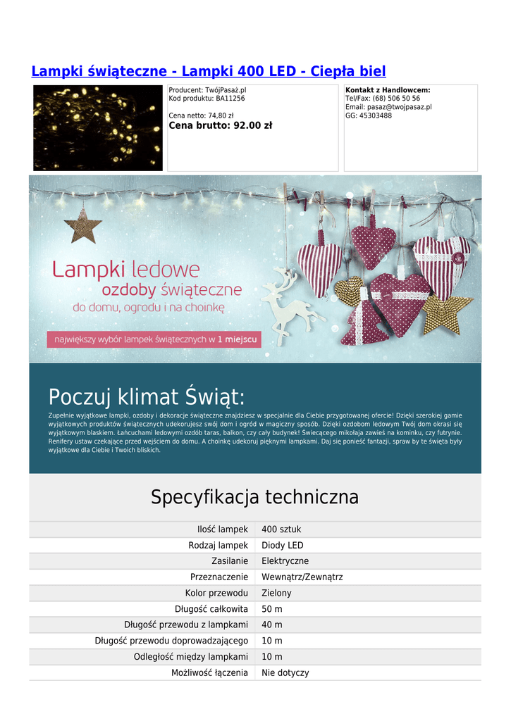 Lampki świąteczne - Lampki 400 LED - Ciepła biel Producent: TwójPasaż.pl Kod produktu: BA11256 Kontakt z Handlowcem: Tel/Fax: (68) 506 50 56 Email: [email protected] GG: 45303488 Cena netto: 74,80 zł Cena brutto: 92.00 zł Poczuj klimat Świąt: Zupełnie wyjątkowe lampki, ozdoby i dekoracje świąteczne znajdziesz w specjalnie dla Ciebie przygotowanej ofercie! Dzięki szerokiej gamie wyjątkowych produktów świątecznych udekorujesz swój dom i ogród w magiczny sposób. Dzięki ozdobom ledowym Twój dom okrasi się wyjątkowym blaskiem. Łańcuchami ledowymi ozdób taras, balkon, czy cały budynek! Świecącego mikołaja zawieś na kominku, czy futrynie. Renifery ustaw czekające przed wejściem do domu. A choinkę udekoruj pięknymi lampkami. Daj się ponieść fantazji, spraw by te święta były wyjątkowe dla Ciebie i Twoich bliskich. Specyfikacja techniczna Ilość lampek 400 sztuk Rodzaj lampek Diody LED Zasilanie Przeznaczenie Kolor przewodu Elektryczne Wewnątrz/Zewnątrz Zielony Długość całkowita 50 m Długość przewodu z lampkami 40 m Długość przewodu doprowadzającego 10 m Odległość między lampkami 10 m Możliwość łączenia Nie dotyczy Kolor lampek biały, ciepły Programator Nie dotyczy Wymienne żarówki Zasilacz Pozostałe informacje Nie Transformator 220V wyłącznikiem czasowym Łączenie równoległe - Uszkodzenie jednej diody nie wygasza zestawu Spełniają normy GS/CE Klasa ochrony IP44 Pobór mocy 5,8W Lampki świąteczne LED wysoka jakość wykonania wodoodporność : IP44 energooszczędne spełniają normy GS/CE długi kabel zasilający wymienny zasilacz Główne cechy prezentowanych lampek Energooszczędne Wysoka jakość Do lampek użyto żarówek LEDowych, które Lampki wykonano z najlepszej jakości materiałów i pobierają znacznie mniej prądu niż tradycyjne użyto odpowiednich żarówek LED tak aby lampki lampki. W przeliczeniu 1Watt to ok. 15 diod mogły służyć przez wiele lat. ledowych. Bezpieczne - Certyfikaty GS i CE Certyfikaty potwierdzają brak substancji szkodliwych. Znak CE potwierdza, że dany produkt spełnia unijne normy bezpieczeństwa i higieny. Możliwości stosowania Lampki z powodzeniem można stosować wewnątrz i na zewnątrz domu. Uniwersalny kształt żarówek pozwala na używanie ich jako ozdoba przez cały rok. Galeria Kod produktu:BA11256 ID produktu:151712 Granos Group sp. z o.o. ul. Sulechowska 4a budynek 45 65-001 Zielona Góra