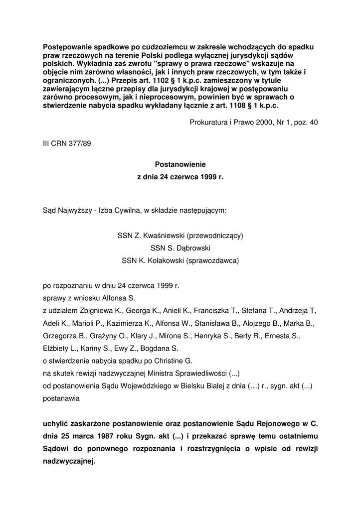 Postępowanie spadkowe po cudzoziemcu w zakresie wchodzących do spadku praw rzeczowych na terenie Polski podlega wyłącznej jurysdykcji sądów polskich. Wykładnia zaś zwrotu "sprawy o prawa rzeczowe" wskazuje na objęcie nim zarówno własności, jak i innych praw rzeczowych, w tym także i ograniczonych. (...) Przepis art. 1102 § 1 k.p.c. zamieszczony w tytule zawierającym łączne przepisy dla jurysdykcji krajowej w postępowaniu zarówno procesowym, jak i nieprocesowym, powinien być w sprawach o stwierdzenie nabycia spadku wykładany łącznie z art. 1108 § 1 k.p.c. Prokuratura i Prawo 2000, Nr 1, poz. 40 III CRN 377/89 Postanowienie z dnia 24 czerwca 1999 r. Sąd Najwyższy - Izba Cywilna, w składzie następującym: SSN Z. Kwaśniewski (przewodniczący) SSN S. Dąbrowski SSN K. Kołakowski (sprawozdawca) po rozpoznaniu w dniu 24 czerwca 1999 r. sprawy z wniosku Alfonsa S. z udziałem Zbigniewa K., Georga K., Anieli K., Franciszka T., Stefana T., Andrzeja T, Adeli K., Marioli P., Kazimierza K., Alfonsa W., Stanisława B., Alojzego B., Marka B., Grzegorza B., Grażyny O., Klary J., Mirona S., Henryka S., Berty R., Ernesta S., Elżbiety L., Kariny S., Ewy Z., Bogdana S. o stwierdzenie nabycia spadku po Christine G. na skutek rewizji nadzwyczajnej Ministra Sprawiedliwości (...) od postanowienia Sądu Wojewódzkiego w Bielsku Białej z dnia (…) r., sygn. akt (...) postanawia uchylić zaskarżone postanowienie oraz postanowienie Sądu Rejonowego w C. dnia 25 marca 1987 roku Sygn. akt (...) i przekazać sprawę temu ostatniemu Sądowi do ponownego rozpoznania i rozstrzygnięcia o wpisie od rewizji nadzwyczajnej. Uzasadnienie W rewizji nadzwyczajnej, wniesionej w 1989 r., od postanowienia b. Sądu Wojewódzkiego, oddalającego zażalenie na odrzucenie wniosku o stwierdzenie nabycia spadku po cudzoziemcu, Minister Sprawiedliwości zarzucił rażące naruszenie art. 387 w związku z art. 397 § 2 oraz art. 1102 KPC i na podstawie art. 417 § 1 KPC (w ówcześnie obowiązującym brzmieniu) wniósł o uchylenie tego postanowienia oraz postanowienia Sądu Rejonowego w części orzekającej odrzucenie wniosku i przekazanie sprawy Sądowi Rejonowemu w C. do ponownego rozpoznania. Rozpoznając sprawę stosownie do art. 11 ust. 5 ustawy z dnia 1 marca 1996 r. o zmianie Kodeksu postępowania cywilnego, rozporządzeń Prezydenta Rzeczypospolitej - Prawo upadłościowe i Prawo o postępowaniu układowym, Kodeksu postępowania administracyjnego, ustawy o kosztach sądowych w sprawach cywilnych oraz niektórych innych ustaw (Dz.U. Nr 43, poz. 189), Sąd Najwyższy uwzględnił tę rewizję i orzekł zgodnie z jej wnioskiem. Trafnie podniesiono w jej uzasadnieniu, że Sąd drugiej instancji ograniczył się do oparcia swojego rozstrzygnięcia na treści art. 1108 § 1 KPC, stwierdzając, że inne przesłanki nie mają znaczenia wobec treści tego przepisu. Tymczasem - istotnie wniosek opierał się na twierdzeniu, że w skład spadku wchodzi nieruchomość położona w Polsce, a następnie że do spadku wchodzi roszczenie spadkobierców związane z ta nieruchomością. Mimo bowiem ujawnienia jej własności na rzecz innych osób, została ona nabyta dla spadkodawczyni na jej zlecenie i jej środki. W uzasadnieniu rewizji nadzwyczajnej powołano pogląd wyrażony przez Sąd Najwyższy w postanowieniu z dnia 22 lutego 1966 r., w sprawie III CRN 395/65 (OSNCP 1966 Nr 11 (a nie Nr 9, jak błędnie tam powołano), poz. 197; PiP 1967 Nr 1, s. 152) na tle art. 1102 KPC, według którego przepis ten może mieć znaczenie dla oceny wyłącznej jurysdykcji krajowej w sprawie o stwierdzenie nabycia spadku po cudzoziemcu, jeżeli postępowanie to dotyczy majątku nieruchomego położonego w Polsce. Należy dodać, że ten sam kierunek wykładni przyjęty został (z pewnym nawet jej rozszerzeniem) w postanowieniu Sądu Najwyższego z dnia 13 października 1986 r. w sprawie I CR 272/86 (OSNC 1987 Nr 12, poz. 213). Wskazując na ścisły związek pomiędzy art. 1102 § 1 i art. 1108 § 1 KPC Sąd Najwyższy uznał wówczas, że postępowanie spadkowe po cudzoziemcu w zakresie wchodzących do spadku praw rzeczowych na terenie Polski podlega wyłącznej jurysdykcji sądów polskich. Wykładnia zaś zwrotu „sprawy o prawa rzeczowe” wskazuje na objęcie nim zarówno własności, jak i innych praw rzeczowych, w tym, także i ograniczonych. Kontynuując tę linie orzecznictwa Sąd Najwyższy w składzie rozpoznającym tę rewizję nadzwyczajną uznał, że przepis art. 1102 § 1 KPC, zamieszczony w tytule zawierającym łączne przepisy dla jurysdykcji krajowej w postępowaniu zarówno procesowym, jak i nieprocesowym, powinien być w sprawach o stwierdzenie nabycia spadku wykładany łącznie z art. 1108 § 1 KPC. Oznacza to, że uzasadnione są zarówno zarzuty, jak i wnioski rewizji nadzwyczajnej.