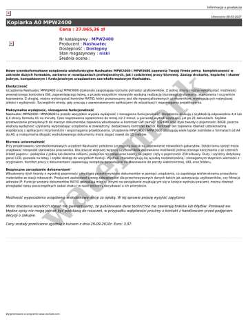 Informacje o produkcie Utworzono 08-03-2017 Kopiarka A0 MPW2400 Cena : 27.965,36 zł Nr katalogowy : MPW2400 Producent : Nashuatec Dostępność : Dostępny Stan magazynowy : niski Średnia ocena : Nowe szerokoformatowe urządzenia wielofunkcyjne Nashuatec MPW2400 i MPW3600 zapewnią Twojej firmie pełną kompleksowość w zakresie dużych formatów, zarówno w rozwiązaniach profesjonalnych, jak i codziennej pracy biurowej. Zastąp drukarkę, kopiarkę i skaner jednym, kompaktowym i funkcjonalnym urządzeniem szerokoformatowym Nashuatec. er m ar k Elastyczność Urządzenia Nashuatec MPW2400 oraz MPW3600 doskonale zaspokajają rozmaite potrzeby użytkowników. Z jednej strony można wykorzystać możliwości wewnętrznego kontrolera GW, zapewniającego łatwą, a przede wszystkim niezwykle wydajną realizację biurowego drukowania, skanowania i oczywiście kopiowania. Z drugiej, można wykorzystać kontroler RATIO, który przeznaczony jest dla wyspecjalizowanych użytkowników, wymagających najwyższej jakości i wydajności. Szczególnie wtedy, gdy pracują z zaawansowanymi aplikacjami do wizualizacji i wspomagania projektowania. Maksymalna wydajność, nienaganna funkcjonalność Nashuatec MPW2400 i MPW3600 to przede wszystkim wysoka wydajność i nienaganna funkcjonalność. Urządzenia drukują z szybkością odpowiednio 4,4 lub 6,4 strony formatu A1 na minutę. Czas nagrzewania ograniczono do mniej niż 2 minut, a pierwszy wydruk uzyskamy już po 21 sekundach. Szybkie przetwarzanie przesyłanych do maszyn dokumentów zapewnia wbudowana w kontroler GW pamięć 1024MB oraz dysk twardy o pojemności 80GB. Jeszcze większą wydajność uzyskamy wyposażając urządzenia w zewnętrzny, dedykowany kontroler RATIO. Kontroler ten zapewnia również udoskonaloną współpracę z aplikacjami inżynierskimi i wspomagania projektowania. Urządzenia MPW2400 i MPW3600 obsługują wiele typów nośników o formatach od A4 do A0, a maksymalna długość wydrukowanego dokumentu może sięgać nawet do 15 metrów. Biurowa uniwersalność Przy projektowaniu szerokoformatowych urządzeń Nashuatec położono szczególny nacisk na zapewnienie niewielkich gabarytów. Dzięki temu sprzęt może znajdować nieopodal stanowiska pracownika. Dla jeszcze większej wygody użytkowników zapewniono możliwość jednoczesnego korzystania z aż czterech źródeł papieru - podajnika z jedną lub dwiema rolkami, podajnika ręcznego oraz kasety na papier cięty o pojemności 250 arkuszy. Duży i czytelny dotykowy panel LCD, pozwala na łatwy i szybki dostęp do wszystkich funkcji. Wydruki charakteryzują się wysoką rozdzielczością i nienagannym stopniem wierności z oryginałem. Komfort pracy z dokumentami zapewniają narzędzia pozwalające na skanowanie do poczty elektronicznej, URL oraz folderu. at Bezpieczne zarządzanie dokumentami Wbudowany dysk twardy o wysokiej pojemności umożliwia przechowywanie dokumentów w pamięci urządzenia, co zapobiega wielokrotnemu przesyłaniu materiałów ze stacji roboczych. Producent zastosował szereg zabezpieczeń dla przechowywanych danych takich jak autoryzacja użytkowników, czy filtracja adresów IP. Funkcje serwera dokumentów RATIO pozwalają między innymi na zarządzanie znajdującym się w kolejce wydruku pracami, można również przeglądać opisy poszczególnych zadań druku i w razie potrzeby decydować o ich priorytecie. Możliwość wyposażenia urządzenia w dodatkowe opcje za opłatą. W tej sprawie proszę wysyłać zapytania w Mimo dołożenia wszelkich starań nie gwarantujemy, że publikowane dane techniczne nie zawierają braków lub błędów. Ponieważ ew. błędne opisy nie mogą jednak być podstawą do roszczeń, w przypadku wątpliwości prosimy o kontakt z handlowcem przed podjęciem decyzji o zakupie. Ceny zostały przeliczone zgodnie z kursem z dnia 29-09-2010r. Euro: 3,97. Wygenerowano w programie www.oscGold.com