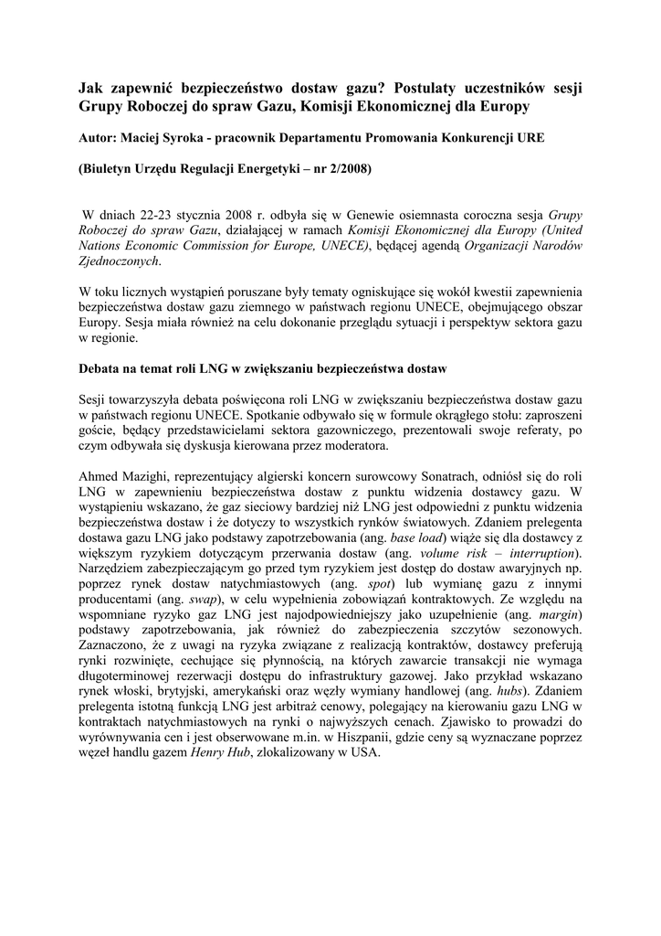 Jak zapewnić bezpieczeństwo dostaw gazu? Postulaty uczestników sesji Grupy Roboczej do spraw Gazu, Komisji Ekonomicznej dla Europy Autor: Maciej Syroka - pracownik Departamentu Promowania Konkurencji URE (Biuletyn Urzędu Regulacji Energetyki – nr 2/2008) W dniach 22-23 stycznia 2008 r. odbyła się w Genewie osiemnasta coroczna sesja Grupy Roboczej do spraw Gazu, działającej w ramach Komisji Ekonomicznej dla Europy (United Nations Economic Commission for Europe, UNECE), będącej agendą Organizacji Narodów Zjednoczonych. W toku licznych wystąpień poruszane były tematy ogniskujące się wokół kwestii zapewnienia bezpieczeństwa dostaw gazu ziemnego w państwach regionu UNECE, obejmującego obszar Europy. Sesja miała równieŜ na celu dokonanie przeglądu sytuacji i perspektyw sektora gazu w regionie. Debata na temat roli LNG w zwiększaniu bezpieczeństwa dostaw Sesji towarzyszyła debata poświęcona roli LNG w zwiększaniu bezpieczeństwa dostaw gazu w państwach regionu UNECE. Spotkanie odbywało się w formule okrągłego stołu: zaproszeni goście, będący przedstawicielami sektora gazowniczego, prezentowali swoje referaty, po czym odbywała się dyskusja kierowana przez moderatora. Ahmed Mazighi, reprezentujący algierski koncern surowcowy Sonatrach, odniósł się do roli LNG w zapewnieniu bezpieczeństwa dostaw z punktu widzenia dostawcy gazu. W wystąpieniu wskazano, Ŝe gaz sieciowy bardziej niŜ LNG jest odpowiedni z punktu widzenia bezpieczeństwa dostaw i Ŝe dotyczy to wszystkich rynków światowych. Zdaniem prelegenta dostawa gazu LNG jako podstawy zapotrzebowania (ang. base load) wiąŜe się dla dostawcy z większym ryzykiem dotyczącym przerwania dostaw (ang. volume risk – interruption). Narzędziem zabezpieczającym go przed tym ryzykiem jest dostęp do dostaw awaryjnych np. poprzez rynek dostaw natychmiastowych (ang. spot) lub wymianę gazu z innymi producentami (ang. swap), w celu wypełnienia zobowiązań kontraktowych. Ze względu na wspomniane ryzyko gaz LNG jest najodpowiedniejszy jako uzupełnienie (ang. margin) podstawy zapotrzebowania, jak równieŜ do zabezpieczenia szczytów sezonowych. Zaznaczono, Ŝe z uwagi na ryzyka związane z realizacją kontraktów, dostawcy preferują rynki rozwinięte, cechujące się płynnością, na których zawarcie transakcji nie wymaga długoterminowej rezerwacji dostępu do infrastruktury gazowej. Jako przykład wskazano rynek włoski, brytyjski, amerykański oraz węzły wymiany handlowej (ang. hubs). Zdaniem prelegenta istotną funkcją LNG jest arbitraŜ cenowy, polegający na kierowaniu gazu LNG w kontraktach natychmiastowych na rynki o najwyŜszych cenach. Zjawisko to prowadzi do wyrównywania cen i jest obserwowane m.in. w Hiszpanii, gdzie ceny są wyznaczane poprzez węzeł handlu gazem Henry Hub, zlokalizowany w USA. Rysunek 1. Zmienność cen gazu ziemnego w węźle Henry Hub Zdaniem prelegenta niezmiernie waŜną kwestią jest przede wszystkim zapewnienie ekonomiki kaŜdego projektu, jako Ŝe niezaleŜnie od moŜliwości jakie daje handel na rynkach dostaw natychmiastowych nie jest moŜliwa ucieczka od kwestii opłacalności. Margot Loudon, reprezentująca stowarzyszenie EUROGAS, zdefiniowała warunki wstępne bezpieczeństwa dostaw. Za najwaŜniejszy uznała istnienie regulacji wewnętrznych na rynku odbiorcy, atrakcyjnych z punktu widzenia dostawców. Podkreślano istnienie zjawiska globalnej konkurencji między poszczególnymi rynkami, która najprawdopodobniej będzie się nasilać po 2010 r., w związku z poszerzaniem się luki podaŜowej. Wielkość luki jest szacowana na 50 mln toe w 2015 r., 127 mln toe w 2020 r. i 241 mln toe w 2030 r. Zdaniem prelegentki niezrównowaŜony popyt będzie wymuszał konkurencję między odbiorcami o dostęp do źródeł zaopatrzenia. W rezultacie na poszczególnych rynkach spodziewane jest przyjmowanie zasad pod kątem oczekiwań dostawców. Jako drugi warunek wskazano odpowiedni poziom inwestycji, w szczególności w sieci przesyłowe (ang. midstream). Niedoinwestowanie sieci przesyłowych zdaniem prelegentki budzi większe obawy niŜ brak inwestycji po stronie wydobycia bądź dystrybucji, co moŜe wynikać z większego prawdopodobieństwa wystąpienia takiego zjawiska. Wytłumaczeniem jest niemoŜność subsydiowania działalności przesyłowej w związku z rozdziałem prawnym działalności przesyłowej. Zdaniem prelegentki wymagane inwestycje moŜna podzielić na dwie kategorie: (1) zwiększające zdolności przesyłowe systemu, (2) zwiększające płynność rynku. Trzecim warunkiem wskazywanym w prezentacji jest wielostronny dialog pomiędzy krajami dostawców i odbiorców gazu, którego celem jest promocja wspólnych interesów. Tezy zawarte w prezentacji podzielili równieŜ inni prelegenci, m.in. przedstawiciel Gaz Natural wskazał, Ŝe Hiszpania konkuruje z innymi rynkami o gaz i tak kształtuje swoje zasady rynkowe, aby były korzystne z punktu widzenia dostawców, w wyniku czego nastąpiła pełna liberalizacja rynku. RównieŜ zgodzono się z tezami dotyczącymi wzrostu popytu i pojawienia się luki podaŜowej po 2010 r. Prezentacja przedstawiciela przedsiębiorstwa ENA GAS wskazywała na rosnącą rolę LNG w zapewnieniu bezpieczeństwa dostaw i w rozwoju konkurencji w Hiszpanii. Wskazano, Ŝe obecnie w tym kraju ponad 2/3 dostaw LNG jest realizowanych przez nowych uczestników rynku. W roku 2006 wielkość ta stanowiła 285 TWh. Dostawy LNG w Hiszpanii są realizowane przez 8 terminali, naleŜących do wielu podmiotów. Wśród współwłaścicieli jednego z terminali LNG znajdują się dostawcy zagraniczni (Sonatrach z Algierii), przedsiębiorstwa energetyczne (m.in. ENDESA), podmioty spoza sektora, władze regionalne oraz banki. Wskazano, Ŝe Hiszpania ma pierwsze miejsce w Europie pod względem wykorzystania LNG, dostawy LNG do Hiszpanii w 2006 r. stanowiły 47% dostaw LNG do UE. Zdaniem prelegenta wykorzystanie LNG ma pozytywny wpływ na z