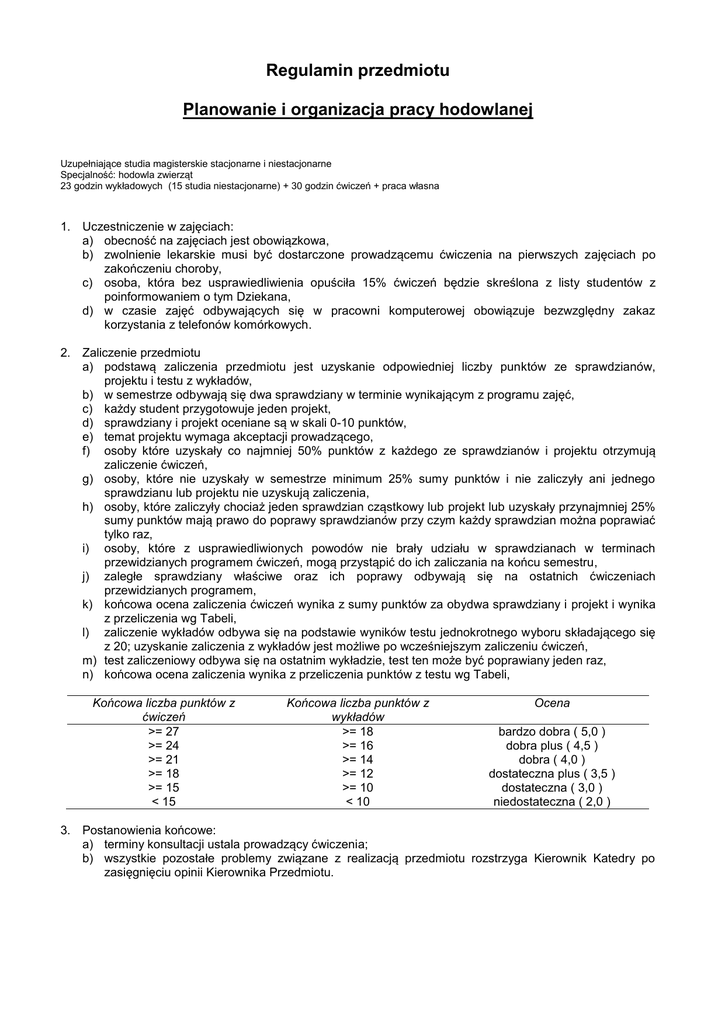 Regulamin przedmiotu Planowanie i organizacja pracy hodowlanej Uzupełniające studia magisterskie stacjonarne i niestacjonarne Specjalność: hodowla zwierząt 23 godzin wykładowych (15 studia niestacjonarne) + 30 godzin ćwiczeń + praca własna 1. Uczestniczenie w zajęciach: a) obecność na zajęciach jest obowiązkowa, b) zwolnienie lekarskie musi być dostarczone prowadzącemu ćwiczenia na pierwszych zajęciach po zakończeniu choroby, c) osoba, która bez usprawiedliwienia opuściła 15% ćwiczeń będzie skreślona z listy studentów z poinformowaniem o tym Dziekana, d) w czasie zajęć odbywających się w pracowni komputerowej obowiązuje bezwzględny zakaz korzystania z telefonów komórkowych. 2. Zaliczenie przedmiotu a) podstawą zaliczenia przedmiotu jest uzyskanie odpowiedniej liczby punktów ze sprawdzianów, projektu i testu z wykładów, b) w semestrze odbywają się dwa sprawdziany w terminie wynikającym z programu zajęć, c) każdy student przygotowuje jeden projekt, d) sprawdziany i projekt oceniane są w skali 0-10 punktów, e) temat projektu wymaga akceptacji prowadzącego, f) osoby które uzyskały co najmniej 50% punktów z każdego ze sprawdzianów i projektu otrzymują zaliczenie ćwiczeń, g) osoby, które nie uzyskały w semestrze minimum 25% sumy punktów i nie zaliczyły ani jednego sprawdzianu lub projektu nie uzyskują zaliczenia, h) osoby, które zaliczyły chociaż jeden sprawdzian cząstkowy lub projekt lub uzyskały przynajmniej 25% sumy punktów mają prawo do poprawy sprawdzianów przy czym każdy sprawdzian można poprawiać tylko raz, i) osoby, które z usprawiedliwionych powodów nie brały udziału w sprawdzianach w terminach przewidzianych programem ćwiczeń, mogą przystąpić do ich zaliczania na końcu semestru, j) zaległe sprawdziany właściwe oraz ich poprawy odbywają się na ostatnich ćwiczeniach przewidzianych programem, k) końcowa ocena zaliczenia ćwiczeń wynika z sumy punktów za obydwa sprawdziany i projekt i wynika z przeliczenia wg Tabeli, l) zaliczenie wykładów odbywa się na podstawie wyników testu jednokrotnego wyboru składającego się z 20; uzyskanie zaliczenia z wykładów jest możliwe po wcześniejszym zaliczeniu ćwiczeń, m) test zaliczeniowy odbywa się na ostatnim wykładzie, test ten może być poprawiany jeden raz, n) końcowa ocena zaliczenia wynika z przeliczenia punktów z testu wg Tabeli, Końcowa liczba punktów z ćwiczeń >= 27 >= 24 >= 21 >= 18 >= 15 < 15 Końcowa liczba punktów z wykładów >= 18 >= 16 >= 14 >= 12 >= 10 < 10 Ocena bardzo dobra ( 5,0 ) dobra plus ( 4,5 ) dobra ( 4,0 ) dostateczna plus ( 3,5 ) dostateczna ( 3,0 ) niedostateczna ( 2,0 ) 3. Postanowienia końcowe: a) terminy konsultacji ustala prowadzący ćwiczenia; b) wszystkie pozostałe problemy związane z realizacją przedmiotu rozstrzyga Kierownik Katedry po zasięgnięciu opinii Kierownika Przedmiotu.