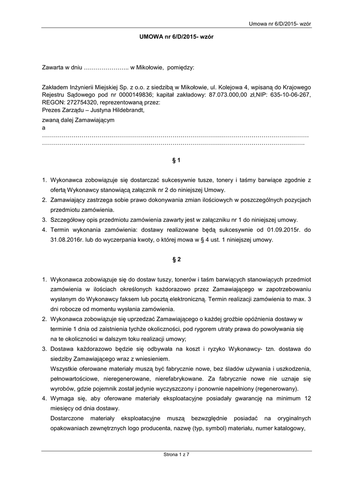 Wzór umowy - Zakład Inżynierii Miejskiej Sp. z oo w Mikołowie