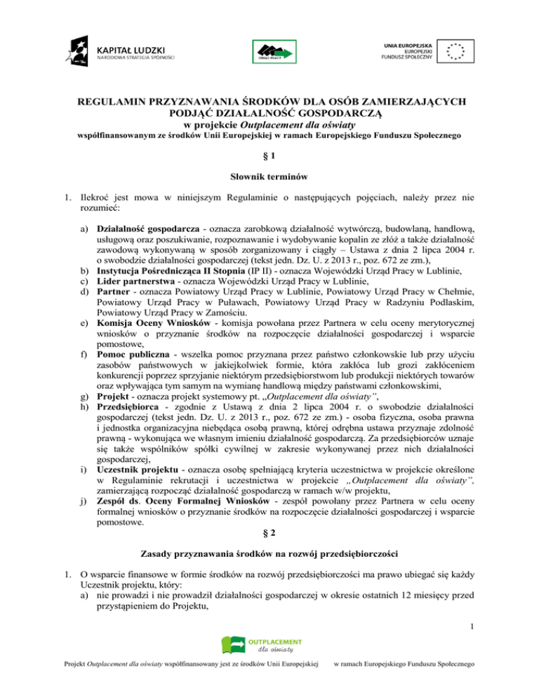 REGULAMIN PRZYZNAWANIA ŚRODKÓW DLA OSÓB ZAMIERZAJĄCYCH PODJĄĆ DZIAŁALNOŚĆ GOSPODARCZĄ w projekcie Outplacement dla oświaty współfinansowanym ze środków Unii Europejskiej w ramach Europejskiego Funduszu Społecznego §1 Słownik terminów 1. Ilekroć jest mowa w niniejszym Regulaminie o następujących pojęciach, należy przez nie rozumieć: a) Działalność gospodarcza - oznacza zarobkową działalność wytwórczą, budowlaną, handlową, usługową oraz poszukiwanie, rozpoznawanie i wydobywanie kopalin ze złóż a także działalność zawodową wykonywaną w sposób zorganizowany i ciągły – Ustawa z dnia 2 lipca 2004 r. o swobodzie działalności gospodarczej (tekst jedn. Dz. U. z 2013 r., poz. 672 ze zm.), b) Instytucja Pośrednicząca II Stopnia (IP II) - oznacza Wojewódzki Urząd Pracy w Lublinie, c) Lider partnerstwa - oznacza Wojewódzki Urząd Pracy w Lublinie, d) Partner - oznacza Powiatowy Urząd Pracy w Lublinie, Powiatowy Urząd Pracy w Chełmie, Powiatowy Urząd Pracy w Puławach, Powiatowy Urząd Pracy w Radzyniu Podlaskim, Powiatowy Urząd Pracy w Zamościu. e) Komisja Oceny Wniosków - komisja powołana przez Partnera w celu oceny merytorycznej wniosków o przyznanie środków na rozpoczęcie działalności gospodarczej i wsparcie pomostowe, f) Pomoc publiczna - wszelka pomoc przyznana przez państwo członkowskie lub przy użyciu zasobów państwowych w jakiejkolwiek formie, która zakłóca lub grozi zakłóceniem konkurencji poprzez sprzyjanie niektórym przedsiębiorstwom lub produkcji niektórych towarów oraz wpływająca tym samym na wymianę handlową między państwami członkowskimi, g) Projekt - oznacza projekt systemowy pt. „Outplacement dla oświaty”, h) Przedsiębiorca - zgodnie z Ustawą z dnia 2 lipca 2004 r. o swobodzie działalności gospodarczej (tekst jedn. Dz. U. z 2013 r., poz. 672 ze zm.) - osoba fizyczna, osoba prawna i jednostka organizacyjna niebędąca osobą prawną, której odrębna ustawa przyznaje zdolność prawną - wykonująca we własnym imieniu działalność gospodarczą. Za przedsiębiorców uznaje się także wspólników spółki cywilnej w zakresie wykonywanej przez nich działalności gospodarczej, i) Uczestnik projektu - oznacza osobę spełniającą kryteria uczestnictwa w projekcie określone w Regulaminie rekrutacji i uczestnictwa w projekcie „Outplacement dla oświaty”, zamierzającą rozpocząć działalność gospodarczą w ramach w/w projektu, j) Zespół ds. Oceny Formalnej Wniosków - zespół powołany przez Partnera w celu oceny formalnej wniosków o przyznanie środków na rozpoczęcie działalności gospodarczej i wsparcie pomostowe. §2 Zasady przyznawania środków na rozwój przedsiębiorczości 1. O wsparcie finansowe w formie środków na rozwój przedsiębiorczości ma prawo ubiegać się każdy Uczestnik projektu, który: a) nie prowadzi i nie prowadził działalności gospodarczej w okresie ostatnich 12 miesięcy przed przystąpieniem do Projektu, 1 Projekt Outplacement dla oświaty współfinansowany jest ze środków Unii Europejskiej w ramach Europejskiego Funduszu Społecznego b) nie zamierza w ramach Projektu „przejąć” działalności gospodarczej po członku rodziny (rodzicach, współmałżonku, dzieciach), c) nie pozostaje w stosunku pracy lub innym (umowa zlecenie, umowa o dzieło lub inne) z Liderem partnerstwa ani z żadnym z Partnerów wspólnie realizującymi Projekt, a także nie łączy lub nie łączył jej z Liderem partnerstwa/Partnerem lub pracownikiem Lidera partnerstwa/Partnera uczestniczącym w procesie rekrutacji i oceny biznesplanów: - związek małżeński, stosunek pokrewieństwa i powinowactwa i/lub - związek z tytułu przysposobienia, opieki, kurateli, d) nie jest osobą będącą wspólnikiem lub komplementariuszem w spółkach osobowych lub członkiem spółdzielni, utworzonych na podstawie prawa spółdzielczego, z wyłączeniem osób będących członkami spółdzielni oszczędnościowo - pożyczkowych /banków spółdzielczych/ oraz spółdzielni budownictwa mieszkaniowego, którzy nie osiągają przychodu z tytułu członkowstwa w spółdzielni, e) nie uczestniczy w innym projekcie współfinansowanym ze środków Europejskiego Funduszu Społecznego w ramach Programu Operacyjnego Kapitał Ludzki, Priorytet VIII, Poddziałanie 8.1.2, ani nie korzysta ze środków publicznych na podjęcie działalności gospodarczej z Funduszu Pracy oraz w ramach Programu Operacyjnego Kapitał Ludzki, Priorytet VI, Działanie 6.1 Poddziałanie 6.1.3 oraz Działanie 6.2, f) korzysta z pełni praw publicznych i posiada pełną zdolność do czynności prawnych, g) nie był karany za przestępstwa skarbowe w rozumieniu ustawy z dnia 10 września 1999 r. Kodeks Karny Skarbowy (tekst jedn. Dz. U. z 2013 r. poz. 186 ze zm.) oraz za przestępstwa przeciwko mieniu, przestępstwa przeciwko obrotowi gospodarczemu oraz przestępstwa przeciwko obrotowi pieniędzmi i papierami wartościowymi w rozumieniu ustawy z dnia 6 czerwca 1997 Kodeks Karny (Dz. U. z 1997 nr 88 poz. 553 ze zm.). 2. O przyznanie środków na rozwój przedsiębiorczości może ubiegać się Uczestnik projektu, który zakończył udział we wsparciu szkoleniowo - doradczym (w zakresie pisania biznes planu) realizowanym w ramach projektu na podstawie Umowy o świadczenie usług szkoleniowo doradczych, stanowiącej załącznik nr 1 do niniejszego Regulaminu. 3. Maksymalna wysokość środków na rozwój przedsiębiorczości przyznana Uczestnikowi projektu może wynosić 40 tys. zł, a jej wysokość uzależniona jest od wykazanych i uzasadnionych potrzeb związanych z planowaną inwestycją w ramach podejmowanej działalności gospodarczej. 4. Uczestnik projektu nie ma obowiązku wniesienia wkładu własnego. 5. Środki na rozwój przedsiębiorczości przyznane zostaną min. 60 Uczestnikom projektu spośród min. 70 zainteresowanych rozpoczęciem działalności gospodarczej, którzy zakończą udział 