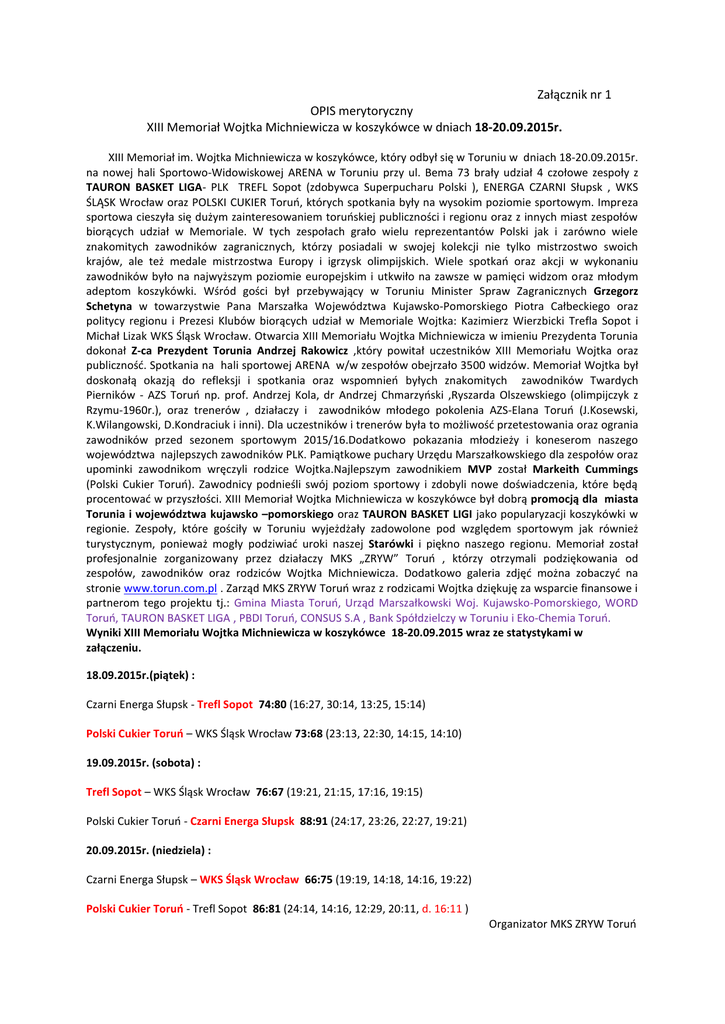 Załącznik nr 1 OPIS merytoryczny XIII Memoriał Wojtka Michniewicza w koszykówce w dniach 18-20.09.2015r. XIII Memoriał im. Wojtka Michniewicza w koszykówce, który odbył się w Toruniu w dniach 18-20.09.2015r. na nowej hali Sportowo-Widowiskowej ARENA w Toruniu przy ul. Bema 73 brały udział 4 czołowe zespoły z TAURON BASKET LIGA- PLK TREFL Sopot (zdobywca Superpucharu Polski ), ENERGA CZARNI Słupsk , WKS ŚLĄSK Wrocław oraz POLSKI CUKIER Toruń, których spotkania były na wysokim poziomie sportowym. Impreza sportowa cieszyła się dużym zainteresowaniem toruńskiej publiczności i regionu oraz z innych miast zespołów biorących udział w Memoriale. W tych zespołach grało wielu reprezentantów Polski jak i zarówno wiele znakomitych zawodników zagranicznych, którzy posiadali w swojej kolekcji nie tylko mistrzostwo swoich krajów, ale też medale mistrzostwa Europy i igrzysk olimpijskich. Wiele spotkań oraz akcji w wykonaniu zawodników było na najwyższym poziomie europejskim i utkwiło na zawsze w pamięci widzom oraz młodym adeptom koszykówki. Wśród gości był przebywający w Toruniu Minister Spraw Zagranicznych Grzegorz Schetyna w towarzystwie Pana Marszałka Województwa Kujawsko-Pomorskiego Piotra Całbeckiego oraz politycy regionu i Prezesi Klubów biorących udział w Memoriale Wojtka: Kazimierz Wierzbicki Trefla Sopot i Michał Lizak WKS Śląsk Wrocław. Otwarcia XIII Memoriału Wojtka Michniewicza w imieniu Prezydenta Torunia dokonał Z-ca Prezydent Torunia Andrzej Rakowicz ,który powitał uczestników XIII Memoriału Wojtka oraz publiczność. Spotkania na hali sportowej ARENA w/w zespołów obejrzało 3500 widzów. Memoriał Wojtka był doskonałą okazją do refleksji i spotkania oraz wspomnień byłych znakomitych zawodników Twardych Pierników - AZS Toruń np. prof. Andrzej Kola, dr Andrzej Chmarzyński ,Ryszarda Olszewskiego (olimpijczyk z Rzymu-1960r.), oraz trenerów , działaczy i zawodników młodego pokolenia AZS-Elana Toruń (J.Kosewski, K.Wilangowski, D.Kondraciuk i inni). Dla uczestników i trenerów była to możliwość przetestowania oraz ogrania zawodników przed sezonem sportowym 2015/16.Dodatkowo pokazania młodzieży i koneserom naszego województwa najlepszych zawodników PLK. Pamiątkowe puchary Urzędu Marszałkowskiego dla zespołów oraz upominki zawodnikom wręczyli rodzice Wojtka.Najlepszym zawodnikiem MVP został Markeith Cummings (Polski Cukier Toruń). Zawodnicy podnieśli swój poziom sportowy i zdobyli nowe doświadczenia, które będą procentować w przyszłości. XIII Memoriał Wojtka Michniewicza w koszykówce był dobrą promocją dla miasta Torunia i województwa kujawsko –pomorskiego oraz TAURON BASKET LIGI jako popularyzacji koszykówki w regionie. Zespoły, które gościły w Toruniu wyjeżdżały zadowolone pod względem sportowym jak również turystycznym, ponieważ mogły podziwiać uroki naszej Starówki i piękno naszego regionu. Memoriał został profesjonalnie zorganizowany przez działaczy MKS „ZRYW” Toruń , którzy otrzymali podziękowania od zespołów, zawodników oraz rodziców Wojtka Michniewicza. Dodatkowo galeria zdjęć można zobaczyć na stronie www.torun.com.pl . Zarząd MKS ZRYW Toruń wraz z rodzicami Wojtka dziękuję za wsparcie finansowe i partnerom tego projektu tj.: Gmina Miasta Toruń, Urząd Marszałkowski Woj. Kujawsko-Pomorskiego, WORD Toruń, TAURON BASKET LIGA , PBDI Toruń, CONSUS S.A , Bank Spółdzielczy w Toruniu i Eko-Chemia Toruń. Wyniki XIII Memoriału Wojtka Michniewicza w koszykówce 18-20.09.2015 wraz ze statystykami w załączeniu. wyniki X II Memoriału Wojtka Michniewicza 18.09.2015r.(piątek) : Czarni Energa Słupsk - Trefl Sopot 74:80 (16:27, 30:14, 13:25, 15:14) Polski Cukier Toruń – WKS Śląsk Wrocław 73:68 (23:13, 22:30, 14:15, 14:10) 19.09.2015r. (sobota) : Trefl Sopot – WKS Śląsk Wrocław 76:67 (19:21, 21:15, 17:16, 19:15) Polski Cukier Toruń - Czarni Energa Słupsk 88:91 (24:17, 23:26, 22:27, 19:21) 20.09.2015r. (niedziela) : Czarni Energa Słupsk – WKS Śląsk Wrocław 66:75 (19:19, 14:18, 14:16, 19:22) Polski Cukier Toruń - Trefl Sopot 86:81 (24:14, 14:16, 12:29, 20:11, d. 16:11 ) Organizator MKS ZRYW Toruń