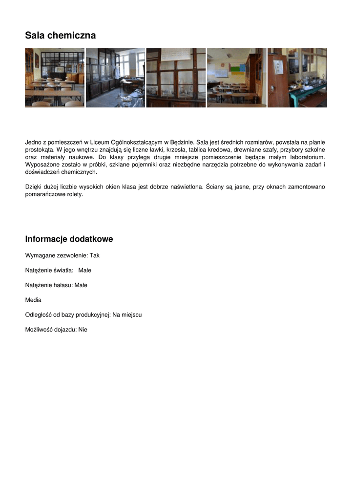Sala chemiczna Jedno z pomieszczeń w Liceum Ogólnokształcącym w Będzinie. Sala jest średnich rozmiarów, powstała na planie prostokąta. W jego wnętrzu znajdują się liczne ławki, krzesła, tablica kredowa, drewniane szafy, przybory szkolne oraz materiały naukowe. Do klasy przylega drugie mniejsze pomieszczenie będące małym laboratorium. Wyposażone zostało w próbki, szklane pojemniki oraz niezbędne narzędzia potrzebne do wykonywania zadań i doświadczeń chemicznych. Dzięki dużej liczbie wysokich okien klasa jest dobrze naświetlona. Ściany są jasne, przy oknach zamontowano pomarańczowe rolety. Informacje dodatkowe Wymagane zezwolenie: Tak Natężenie światła: Małe Natężenie hałasu: Małe Media Odległość od bazy produkcyjnej: Na miejscu Możliwość dojazdu: Nie Powered by TCPDF (www.tcpdf.org)