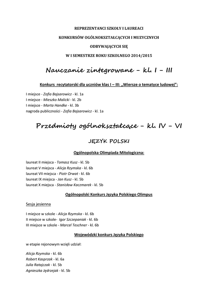 REPREZENTANCI SZKOŁY I LAUREACI KONKURSÓW OGÓLNOKSZTAŁCĄCYCH I MUZYCZNYCH ODBYWAJĄCYCH SIĘ W I SEMESTRZE ROKU SZKOLNEGO 2014/2015 Nauczanie zintegrowane - kl. I - III Konkurs recytatorski dla uczniów klas I – III: „Wiersze o tematyce ludowej”: I miejsce - Zofia Bajsarowicz - kl. 1a I miejsce - Mieszko Malicki - kl. 2b I miejsce - Marta Handke - kl. 3b nagroda publiczności - Zofia Bajsarowicz - kl. 1a Przedmioty ogólnokształcące - kl. IV - VI JĘZYK POLSKI Ogólnopolska Olimpiada Mitologiczna: laureat II miejsca - Tomasz Kusz - kl. 5b laureat V miejsca - Alicja Rzymska - kl. 6b laureat VII miejsca - Piotr Orwat - kl. 6b laureat IX miejsca - Jan Kusz - kl. 5b laureat X miejsca - Stanisław Kaczmarek - kl. 5b Ogólnopolski Konkurs Języka Polskiego Olimpus Sesja jesienna I miejsce w szkole - Alicja Rzymska - kl. 6b II miejsce w szkole- Igor Szczepaniak - kl. 6b III miejsce w szkole - Marcel Teschner - kl. 6b Wojewódzki konkurs Języka Polskiego w etapie rejonowym wzięli udział: Alicja Rzymska - kl. 6b Robert Kasprzak - kl. 6a Julia Ratajczak - kl. 5b Agnieszka Jędrzejak - kl. 5b JĘZYK ANGIELSKI Ogólnopolski Konkurs Języka Angielskiego w słuchaniu ze zrozumieniem The Bat Kid Izabela Stevenson - laureat III miejsca Igor Szczepaniak - laureat III miejsca Inez Grzelska - laureat III miejsca MATEMATYKA Wojewódzki Konkurs Matematyczny dla uczniów szkół podstawowych. Etap szkolny: I miejsce - Ignacy Drozdowicz II miejsce - Michał Chojnacki III miejsce -Amelia Nowak IV miejsce - Tymoteusz Tomczak V miejsce - Anna Maj VI miejsce - Jagienka Klecha VII miejsce - Pola Sarnowska (kl.5). W/w uczniowie wzięli udział w etapie rejonowym w Szkole Podstawowej nr 17 . Michał Chojnacki znakomicie przebrnął przez gąszcz trudnych zadań, zdobywając prawo do udziału w etapie wojewódzkim, czyli finałowym i tam 6 lutego 2015 r. zdobył TYTUŁ LAUREATA. Ogólnopolski Konkurs Matematyczny OLIMPUS Sesja jesienna: kl. 4: I miejsce w szkole – Tymoteusz Bączkowski (laureat) II miejsce w szkole – Piotr Twardowski (laureat) III miejsce w szkole – Maria Opiela kl. 5: I miejsce w szkole – Tymon Zieliński (laureat I miejsca) II miejsce w szkole – Lidia Wiśniewska (laureatka) III miejsce w szkole – Tomasz Kusz (laureat) kl. 6 I miejsce w szkole – Tymoteusz Tomczak (laureat) II miejsce w szkole – Michał Chojnacki III miejsce w szkole – Amelia Nowak Wyniki sesji zimowej jeszcze nie są znane. Konkurs Matematyczny ZŁOTA ŻABKA dla kl. 5 i 6 Oto wyniki etapu szkolnego: I miejsce – Ignacy Drozdowicz, Tymoteusz Zieliński II miejsce – Amelia Nowak III miejsce – Michał Chojnacki I. Drozdowicz i T. Zieliński będą reprezentować szkołę w etapie finałowym w Swarzędzu. Międzyszkolny Konkurs Matematyczny Wyniki etapu szkolnego dla klas 4: I miejsce - Stefan Grala II miejsce – Maria Opiela i Tymoteusz Bączkowski Wyniki etapu szkolnego dla klas 6: I miejsce – Tymoteusz Tomczak i Michał Chojnacki II miejsce – Anna Maj W/w trójka uczniów z kl.4 i obaj chłopcy z kl.6 zakwalifikowali się do etapów pozaszkolnych, które odbyły się pod koniec stycznia 2015. 30 stycznia 2015 – w finale dla klas 4: Tymoteusz Bączkowski zdobył WYRÓŻNIENIE. 31 stycznia 2015 – w finale dla klas 6: Michał Chojnacki zdobył WYRÓŻNIENIE Tymoteusz Tomczak zdobył TYTUŁ FINALISTY. PRZYRODA Wojewódzki Konkurs Przyrodniczy – etap szkolny I miejsce - Anna Maj - kl. 6a II miejsce - Iga Cielacka - kl. 6a, Alicja Rzymska - kl. 6b III miejsce - Amelia Nowak - kl. 6a Konkursy Ekologiczne I miejsce - Michał Sieńko - kl. 5a, Hanna Sacha - kl. 4b, Oliwia Eder - kl. 4a II miejsce - Weronika Madej - kl. 4a III miejsce - Stefan Grala - kl. 4b Osiągnięcia muzyczne SEKCJA INSTRUMENTÓW DĘTYCH I PERKUSJI II Polsko – Niemiecki Konkurs Smyczkowych i Fletowych Zespołów Kameralnych w ramach XIII Festiwalu Telemannowskiego wyróżnienie - duet fletowy: Justyna Janiak - kl. 2, Krzysztof Dzilne - kl. 3 Makroregionalne Przesłuchania Uczniów Klas Instrumentów Dętych Blaszanych CEA - Żary Stanisław Kaczmarek - kl. 5, trąbka - zakwalifikował się do Ogólnopolskich Przesłuchań CEA SEKCJA INSTRUMENTÓW SMYCZKOWYCH I SZARPANYCH Festiwal kameralistyki Smyczki plus... - Ostrów Wielkopolski I miejsce „Złota Triola” w kategorii zespołów Amelia Nowak - kl. 6 – skrzypce, Iga Cielecka - kl. 6 – skrzypce, Anna Maj - kl. 6 – fortepian II miejsce „Srebrna Triola” w kategorii zespołów Anna Kühnert - kl. 2 – skrzypce, Maria Kramer - kl. 2 – skrzypce, Kornelia Jurasz - kl. 1 – skrzypce, Zuzanna Jagielska - kl. 1 – skrzypce oraz Pola Sarnowska - kl. 5 – fortepian II miejsce „Srebrna Triola” w kategorii duetów Amelia Melosik - kl. 3 – skrzypce i Pola Sarnowska kl. 5 – fortepian wyróżnienie Trio MMA w składzie: Alicja Rzymska - kl. 6 – skrzypce, Martyna Socha - kl. 6 – skrzypce, Michał Chojnacki - kl. 6 – fortepian XX Słupeckie Spotkania Muzyczne grupa I: laureat - Filip Furmańczyk - kl. 1 wyróżnienie - Marcel Zieliński - kl. 2 grupa II: laureat - Jan Szymoszyn - kl. 3 laureat - Piotr Łabenda - kl. 4 wyróżnienie - Antoni Rachuta - kl. 4 grupa III: laureat - Tymon Zieliński - kl. 5 II Polsko-Niemiecki Konkurs Smyczkowych i Fletowych Zespołów Kameralnych - Żary wyróżnienie - Trio MMA w składzie: Alicja Rzymska – skrzypce, Martyna Socha – skrzypce, Michał Chojnacki – fortepian X Ogólnopolski Festiwal i Konkurs im. Łukasza Pietrzaka „Gitaromania” - Jelenia Góra grupa młodsza: I miejsce oraz dyplom za najlepsze wykonanie utworu obowiązkowego - Tymon Zieliński - kl. 5 Przesłuchania CEA uczniów publicznych i niepublicznych szkół muzycznych I stopnia – soliści awans do etapu ogólnopolskiego w kategorii "gitara": Piotr Łabenda - kl. 4 Tymoteusz Zieliński - kl. 5 awans do etapu ogólnopolskiego w kategorii "skrzypce": Wiktoria Maćkowiak - kl. 5 SEKCJA INSTRUMENTÓW KLAWISZOWYCH XI Spotkania Najmłodszych Pianist