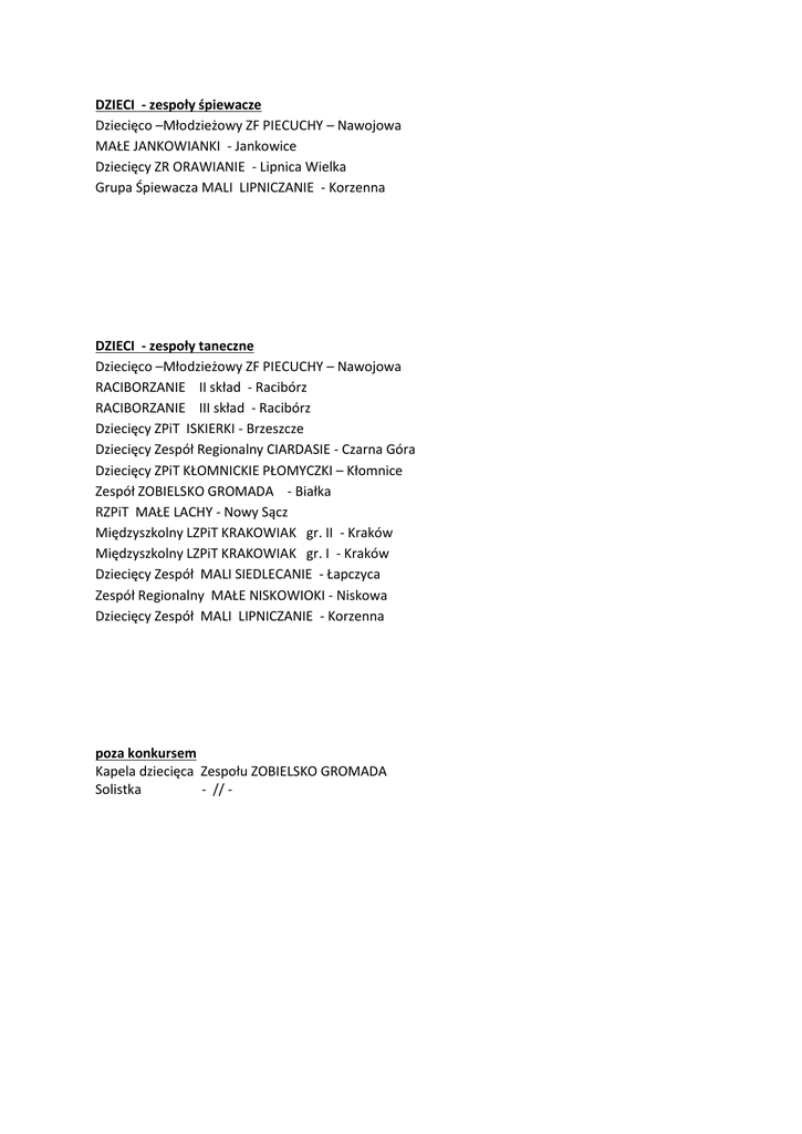 DZIECI - zespoły śpiewacze Dziecięco –Młodzieżowy ZF PIECUCHY – Nawojowa MAŁE JANKOWIANKI - Jankowice Dziecięcy ZR ORAWIANIE - Lipnica Wielka Grupa Śpiewacza MALI LIPNICZANIE - Korzenna DZIECI - zespoły taneczne Dziecięco –Młodzieżowy ZF PIECUCHY – Nawojowa RACIBORZANIE II skład - Racibórz RACIBORZANIE III skład - Racibórz Dziecięcy ZPiT ISKIERKI - Brzeszcze Dziecięcy Zespół Regionalny CIARDASIE - Czarna Góra Dziecięcy ZPiT KŁOMNICKIE PŁOMYCZKI – Kłomnice Zespół ZOBIELSKO GROMADA - Białka RZPiT MAŁE LACHY - Nowy Sącz Międzyszkolny LZPiT KRAKOWIAK gr. II - Kraków Międzyszkolny LZPiT KRAKOWIAK gr. I - Kraków Dziecięcy Zespół MALI SIEDLECANIE - Łapczyca Zespół Regionalny MAŁE NISKOWIOKI - Niskowa Dziecięcy Zespół MALI LIPNICZANIE - Korzenna poza konkursem Kapela dziecięca Zespołu ZOBIELSKO GROMADA Solistka - // -