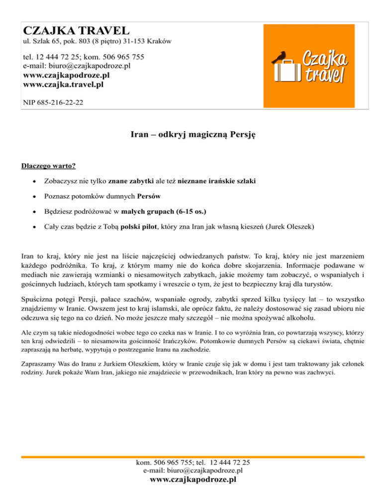 CZAJKA TRAVEL ul. Szlak 65, pok. 803 (8 piętro) 31-153 Kraków tel. 12 444 72 25; kom. 506 965 755 e-mail: [email protected] www.czajkapodroze.pl www.czajka.travel.pl NIP 685-216-22-22 Iran – odkryj magiczną Persję Dlaczego warto? Zobaczysz nie tylko znane zabytki ale też nieznane irańskie szlaki Poznasz potomków dumnych Persów Będziesz podróżować w małych grupach (6-15 os.) Cały czas będzie z Tobą polski pilot, który zna Iran jak własną kieszeń (Jurek Oleszek) Iran to kraj, który nie jest na liście najczęściej odwiedzanych państw. To kraj, który nie jest marzeniem każdego podróżnika. To kraj, z którym mamy nie do końca dobre skojarzenia. Informacje podawane w mediach nie zawierają wzmianki o niesamowitych zabytkach, jakie możemy tam zobaczyć, o wspaniałych i gościnnych ludziach, których tam spotkamy i wreszcie o tym, że jest to bezpieczny kraj dla turystów. Spuścizna potęgi Persji, pałace szachów, wspaniałe ogrody, zabytki sprzed kilku tysięcy lat – to wszystko znajdziemy w Iranie. Owszem jest to kraj islamski, ale oprócz faktu, że należy dostosować się zasad ubioru nie odczuwa się tego na co dzień. No może jeszcze mały szczegół – nie można spożywać alkoholu. Ale czym są takie niedogodności wobec tego co czeka nas w Iranie. I to co wyróżnia Iran, co powtarzają wszyscy, którzy ten kraj odwiedzili – to niesamowita gościnność Irańczyków. Potomkowie dumnych Persów są ciekawi świata, chętnie zapraszają na herbatę, wypytują o postrzeganie Iranu na zachodzie. Zapraszamy Was do Iranu z Jurkiem Oleszkiem, który w Iranie czuje się jak w domu i jest tam traktowany jak członek rodziny. Jurek pokaże Wam Iran, jakiego nie znajdziecie w przewodnikach, Iran który na pewno was zachwyci. kom. 506 965 755; tel. 12 444 72 25 e-mail: [email protected] www.czajkapodroze.pl PROGRAM 1 dzień: Wylot z Polski do Teheranu (z przesiadką w jednym z europejskich lub azjatyckich portów lotniczych) 2 dzień: TEHERAN – KOM - KASZAN Po przylocie do Teheranu nad ranem, przejazd do Kaszanu przez Kom, jedno z najświętszych miast Iranu z mauzoleum Fatimy Masuleh, najważniejszej świętej szyickiej. W Kaszan zobaczymy stare miasto z krętymi uliczkami, domami bogatych kupców, pięknym bazarem i tradycyjnym ogrodem Fin. 3 dzień: KASZAN - ISFAHAN Przejazd do Isfahanu, po drodze odwiedzimy Abianeh, malowniczą wioskę w górach z uroczymi zaułkami, słynąca z tego że panie noszą się tam bardzo kolorowo. 4 dzień: ISFAHAN Isfahan, dawna stolica z jednym z największych placów świata Naqsz-e Dżahan (czyli wzór świata). Piękne, pokryte mozaikami meczety, pałace, średniowieczne mosty, ormiańska dzielnica Dżolfa z malowanymi kościołami a przede wszystkim jeden z najwspanialszych w Iranie bazarów. To wszystko i o wiele więcej zobaczymy podczas naszego pobytu w tym niesamowitym mieście. 5 dzień: ISFAHAN – NAIN - GARMEH Przez Nain gdzie zobaczymy jeden z najstarszych meczetów w Iranie a być może i podziemny młyn, jedziemy do Garmeh, oazy na pustyni Daszt e Kawir, gdzie zamieszkamy w czarującym tradycyjnym domu. 6 dzień: GARMEH Spacer po oazie i okolicach, wycieczka jeepem na piaszczyste wydmy pustyni. 7 dzień: GARMEH - JAZD Dziś wyruszymy do Jazd. Po drodzę odwiedzimy Czak Czak, najważniejszą w Iranie świątynię zaratusztriańską, oraz niesamowitą opuszczoną wioskę Charanak. 8 dzień: JAZD Jazd, najpiękniejsze z miast na pustyni z krętymi zaułkami, badgirami czyli wieżami wiatrowymi zapewniającymi od setek lat dopływ chłodnego powietrza do domów oraz kanatami czyli podziemnymi kanałami sprowadzającymi wodę do miasta z odległych o kilkadziesiąt kilometrów gór. Odwiedzimy też zurchane, czyli tradycyjną perską siłownię. kom. 506 965 755; tel. 12 444 72 25 e-mail: [email protected] www.czajkapodroze.pl 9 dzień: JAZD - MEJMAND Po drodze do Mejmand odwiedzimy stary XVII-wieczny karawaseraj zamieniony na hotel. Mejmand wioska troglodytów, gdzie do dziś wielu ludzi ciągle mieszka w jaskiniach. Zamieszkamy w oryginalnym hotelu w mieszkalnych jaskiniach. 10 dzień: MEJMAND - BAWANAT Przejazd do Bawanat gdzie zamieszkamy u tradycyjnej rodziny i, jeśli akurat będą w okolicy, odwiedzimy nomadów zamieszkujących pobliskie góry. 11 dzień: BAWANAT – PERSEPOLIS - SZIRAZ Po drodze do Szirazu zwiedzimy najważniejsze starożytne ruiny w Iranie: Persepolis, Pasargady i Naqsz-e Rostam, zwane perską doliną królów. Wśród starożytnych ruin będziemy się starali wyobrazić sobie stolicę pierwszego w historii świata imperium z którego władali Cyrrus, Dariusz i Kserkses. 12 dzień: SZIRAZ Sziraz, miasto poetów z pięknymi ogrodami gdzie pochowani są najwięksi z nich Hafez i Saadi. Olśniewające mauzoleum Szach Czarach, jedno z najświętszych miejsc pielgrzymkowych. A ponadto oczywiście piękny stary bazar i meczet Nasir al Molk z przepięknymi mozaikami i witrażami z zaczarowaną grą światła. Przejazd do Teheranu nocnym pociągiem. 13 dzień: TEHERAN Teheran, 15-sto milionowa stolica Iranu przytłacza rozległością ale też nie jest to miasto zachwycające, zwłaszcza w porównaniu z innymi. Zobaczymy olśniewający pałac szachów Golestan, Muzeum Klejnotów, bazar a przede wszystkim po raz pierwszy zapoznamy się na teherańskich ulicach z irańską rzeczywistością. 14 dzień: TEHERAN Za pomocą kolejki linowej zdobędziemy wysoką na ponad 3900m górę Toczal w królujących nad Teheranem górach Alborz. Zwiedzimy piękny park i pałac szachów Saadabad oraz odwiedzimy polski cmentarz. 15 dzień: TEHERAN Czas wolny w Teheranie, ostatnie zakupy i pożegnanie z Iranem. 16 dzień: POŻEGNANIE Wylot z Teheranu do Polski. (Większość lotów z Teheranu jest w godzinach wczesnoporannych.) Kolejność zwiedzania może ulec zmianie. kom. 506 965 755; tel. 12 444 72 25 e-mail: [email protected] www.czajkapodroze.pl CENA OBEJMUJE: Bilet lotniczy na trasie Warszawa-Teheran-War