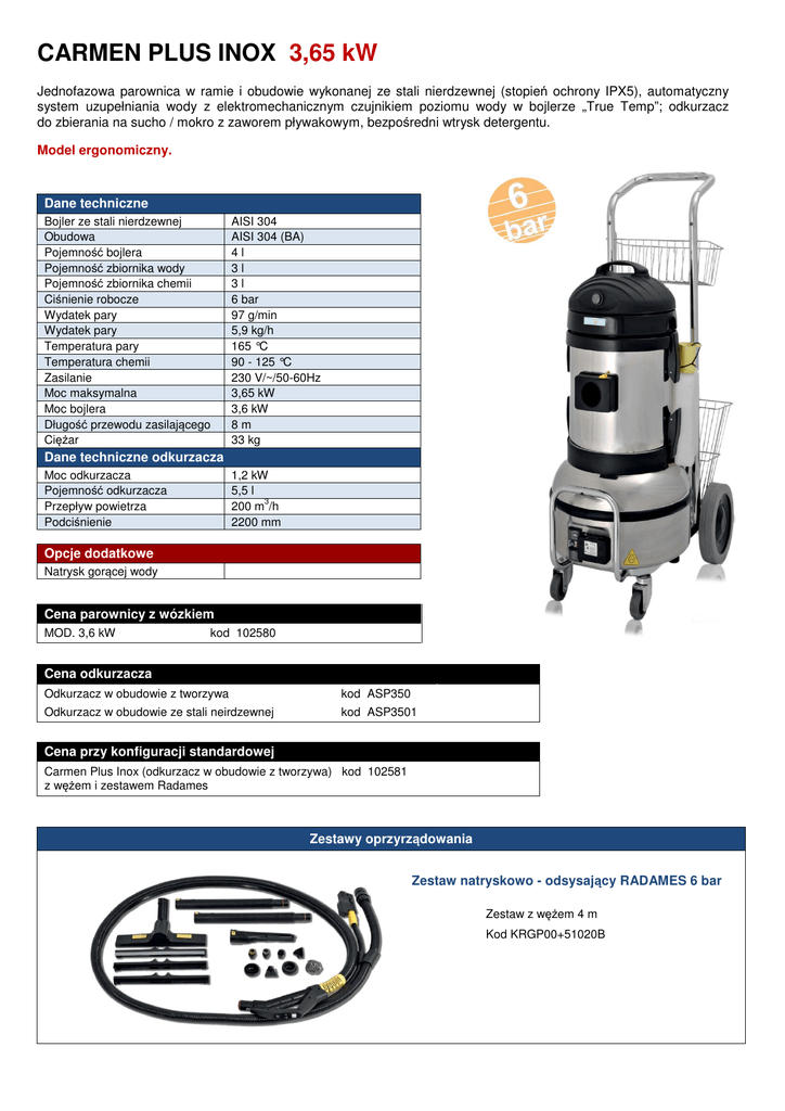 CARMEN PLUS INOX 3,65 kW Jednofazowa parownica w ramie i obudowie wykonanej ze stali nierdzewnej (stopień ochrony IPX5), automatyczny system uzupełniania wody z elektromechanicznym czujnikiem poziomu wody w bojlerze „True Temp”; odkurzacz do zbierania na sucho / mokro z zaworem pływakowym, bezpośredni wtrysk detergentu. Model ergonomiczny. Dane techniczne Bojler ze stali nierdzewnej Obudowa Pojemność bojlera Pojemność zbiornika wody Pojemność zbiornika chemii Ciśnienie robocze Wydatek pary Wydatek pary Temperatura pary Temperatura chemii Zasilanie Moc maksymalna Moc bojlera Długość przewodu zasilającego Ciężar AISI 304 AISI 304 (BA) 4l 3l 3l 6 bar 97 g/min 5,9 kg/h 165 °C 90 - 125 °C 230 V/~/50-60Hz 3,65 kW 3,6 kW 8m 33 kg Dane techniczne odkurzacza Moc odkurzacza Pojemność odkurzacza Przepływ powietrza Podciśnienie 1,2 kW 5,5 l 3 200 m /h 2200 mm Opcje dodatkowe Natrysk gorącej wody Cena parownicy z wózkiem MOD. 3,6 kW kod 102580 Cena odkurzacza Odkurzacz w obudowie z tworzywa kod ASP350 344,00 € Odkurzacz w obudowie ze stali neirdzewnej kod ASP3501 450,00 € Cena przy konfiguracji standardowej Carmen Plus Inox (odkurzacz w obudowie z tworzywa) kod 102581 z wężem i zestawem Radames Zestawy oprzyrządowania Zestaw natryskowo - odsysający RADAMES 6 bar Zestaw z wężem 4 m Kod KRGP00+51020B Zestawy oprzyrządowania Zestaw natryskowy - odsysający STAR 6 bar Zestaw z wężem 4 m Kod KSGD00V2+601020B Zestaw natryskowy JULY 6 bar Zestaw z wężem 3 m (kod KJG000 + 1302I Zestaw z wężem 5 m (kod KJG000 + 1502I3) Zestaw z wężem 10 m (kod KJG000 + 1102I3) Zestaw z wężem 15 m (kod KJG000 + 1152I3) Zestaw do usuwania gum 5 3 1 1. Elimi Gumm – detergent 10l (kod LQ80064) 2. Ssawka do gum (kod 5107608) 3. Ssawka dywanowa (kod PG5501) 4. Szczotka ze stali nierdzewnej T50 (kod 1207003) 4 6 5. Szczotka nylonowa okrągła (kod LQ80064) 6. Szczotka trójkątna (kod 1207133) 2 Zestaw – Mop parowy Mop 5 m Mop 10 m (kod 700D150) (kod 700D005) Nakładki z mikrofibry (5 szt.) Nakładki z bawełny/poliester (5 szt.) (kod 7000055) (kod 7000065) ___ Detergenty TECNOVAP Vapo Food 5l Vapo Clean 5l kod LQ80065 kod LQ80075