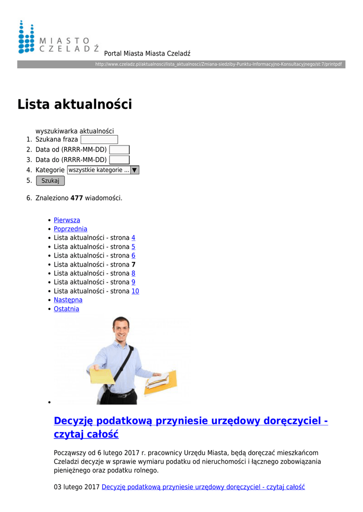 Portal Miasta Miasta Czeladź http://www.czeladz.pl/aktualnosci/lista_aktualnosci/Zmiana-siedziby-Punktu-Informacyjno-Konsultacyjnego/st:7/printpdf Lista aktualności wyszukiwarka aktualności 1. Szukana fraza 2. Data od (RRRR-MM-DD) 3. Data do (RRRR-MM-DD) 4. Kategorie wszystkie kategorie ... ▼ 5. Szukaj 6. Znaleziono 477 wiadomości. Pierwsza Poprzednia Lista aktualności - strona 4 Lista aktualności - strona 5 Lista aktualności - strona 6 Lista aktualności - strona 7 Lista aktualności - strona 8 Lista aktualności - strona 9 Lista aktualności - strona 10 Następna Ostatnia Decyzję podatkową przyniesie urzędowy doręczyciel czytaj całość Począwszy od 6 lutego 2017 r. pracownicy Urzędu Miasta, będą doręczać mieszkańcom Czeladzi decyzje w sprawie wymiaru podatku od nieruchomości i łącznego zobowiązania pieniężnego oraz podatku rolnego. 03 lutego 2017 Decyzję podatkową przyniesie urzędowy doręczyciel - czytaj całość Silna mgła, marznące opady - Ostrzeżenie meteorologiczne Nr 25 - czytaj całość IMiGW: Centralne Biuro Prognoz Meteorologicznych prognozuje wystąpienie słabych opadów marznącej mżawki, powodujących gołoledź oraz mgłę. 03 lutego 2017 Silna mgła, marznące opady - Ostrzeżenie meteorologiczne Nr 25 - czytaj całość Inwentaryzacja azbestu w Czeladzi - czytaj całość Burmistrz Miasta Czeladź informuje o przystąpieniu do opracowywania „Aktualizacji Programu usuwania wyrobów zawierających azbest z terenu Miasta Czeladź”. 03 lutego 2017 Inwentaryzacja azbestu w Czeladzi - czytaj całość Zapraszamy do lektury Oficyny Saturnowskiej - czytaj całość Najnowszy numer informatora muzealnego otwiera podsumowanie minionego roku, obfitującego w wiele niebagatelnych wydarzeń kulturalnych, a także wartościowych programów naukowo-badawczych. 03 lutego 2017 Zapraszamy do lektury Oficyny Saturnowskiej - czytaj całość Turniej Halowy w piłce nożnej im. Walka Lubnaua czytaj całość Wszystkich chętnych do uczczenia pamięci Waldka zapraszamy na turniej halowy, który odbędzie się 18.02.2017 r. w Hali MOSiR Czeladź. 03 lutego 2017 Turniej Halowy w piłce nożnej im. Walka Lubnaua - czytaj całość XI Mistrzostwa Czeladzi w Narciarstwie Alpejskim i Snowboardzie - czytaj całość 5 marca 2017 r. w Istebnej odbędą się XI Mistrzostwa Czeladzi w Narciarstwie Alpejskim i Snowboardzie o Puchar Burmistrza Miasta Czeladź. 03 lutego 2017 XI Mistrzostwa Czeladzi w Narciarstwie Alpejskim i Snowboardzie - czytaj całość Prognoza wskaźnika jakości powietrza - czytaj całość Prognoza wskaźnika jakości powietrza województwa śląskiego. 02 lutego 2017 Prognoza wskaźnika jakości powietrza - czytaj całość Marznące opady - Ostrzeżenie meteorologiczne Nr 24 czytaj całość IMiGW: Prognozuje się wystąpienie słabych opadów marznącego deszczu lub mżawki, powodujących gołoledź. 02 lutego 2017 Marznące opady - Ostrzeżenie meteorologiczne Nr 24 - czytaj całość Reforma edukacji w Czeladzi - projekt sieci szkół - czytaj całość 1 września 2017 roku w całym kraju rozpocznie się wdrażanie reformy edukacji. 02 lutego 2017 Reforma edukacji w Czeladzi - projekt sieci szkół - czytaj całość Apel do hodowców drobiu! - czytaj całość Powiatowy Lekarz Weterynarii w Będzinie informuje, że Minister Rolnictwa i Rozwoju Wsi wystosował apel do hodowców drobiu, dotyczący zarządzenia środków związanych z wystąpieniem wysoce zjadliwej grupy ptaków. 02 lutego 2017 Apel do hodowców drobiu! - czytaj całość Pierwsza Poprzednia Lista aktualności - strona 4 Lista aktualności - strona 5 Lista aktualności - strona 6 Lista aktualności - strona 7 Lista aktualności - strona 8 Lista aktualności - strona 9 Lista aktualności - strona 10 Następna Ostatnia