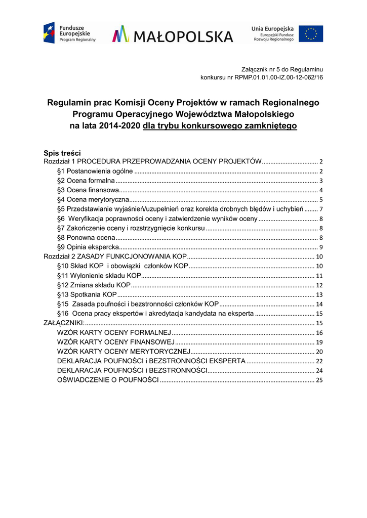 Załącznik nr 5 do Regulaminu konkursu nr RPMP.01.01.00-IZ.00-12-062/16 Regulamin prac Komisji Oceny Projektów w ramach Regionalnego Programu Operacyjnego Województwa Małopolskiego na lata 2014-2020 dla trybu konkursowego zamkniętego Spis treści Rozdział 1 PROCEDURA PRZEPROWADZANIA OCENY PROJEKTÓW ................................. 2 §1 Postanowienia ogólne ............................................................................................................ 2 §2 Ocena formalna ....................................................................................................................... 3 §3 Ocena finansowa..................................................................................................................... 4 §4 Ocena merytoryczna............................................................................................................... 5 §5 Przedstawianie wyjaśnień/uzupełnień oraz korekta drobnych błędów i uchybień ........ 7 §6 Weryfikacja poprawności oceny i zatwierdzenie wyników oceny ................................... 8 §7 Zakończenie oceny i rozstrzygnięcie konkursu .................................................................. 8 §8 Ponowna ocena ....................................................................................................................... 8 §9 Opinia ekspercka..................................................................................................................... 9 Rozdział 2 ZASADY FUNKCJONOWANIA KOP ........................................................................... 10 §10 Skład KOP i obowiązki członków KOP .......................................................................... 10 §11 Wyłonienie składu KOP...................................................................................................... 11 §12 Zmiana składu KOP ............................................................................................................ 12 §13 Spotkania KOP .................................................................................................................... 13 §15 Zasada poufności i bezstronności członków KOP ........................................................ 14 §16 Ocena pracy ekspertów i akredytacja kandydata na eksperta ................................... 15 ZAŁĄCZNIKI: ....................................................................................................................................... 15 WZÓR KARTY OCENY FORMALNEJ .................................................................................... 16 WZÓR KARTY OCENY FINANSOWEJ .................................................................................. 19 WZÓR KARTY OCENY MERYTORYCZNEJ......................................................................... 20 DEKLARACJA POUFNOŚCI i BEZSTRONNOŚCI EKSPERTA ........................................ 22 DEKLARACJA POUFNOŚCI i BEZSTRONNOŚCI............................................................... 24 OŚWIADCZENIE O POUFNOŚCI ........................................................................................... 25 Rozdział 1 PROCEDURA PRZEPROWADZANIA OCENY PROJEKTÓW §1 Postanowienia ogólne 1. Działając w oparciu o art. 44 Ustawy, oceny spełnienia kryteriów wyboru projektów przez projekty uczestniczące w konkursie dokonuje KOP. Niniejszy Regulamin określa organizację, tryb oraz zasady pracy KOP. 2. KOP dla oceny spełnienia kryteriów wyboru projektów w ramach RPO WM powołuje Dyrektor Departamentu Funduszy Europejskich (FE), na podstawie udzielonego przez IZ upoważnienia. Dokumentem powołującym KOP jest Polecenie służbowe Dyrektora Departamentu FE. 3. Funkcję Przewodniczącego KOP pełni Dyrektor Departamentu FE lub Zastępca Dyrektora Departamentu FE. 4. Rozpoczęcie prac KOP następuje w pierwszym dniu po zamknięciu naboru wniosków o dofinansowanie projektów, natomiast zakończenie prac KOP następuje w momencie zatwierdzenia przez Przewodniczącego KOP listy zawierającej wyniki oceny wszystkich wniosków o dofinansowanie projektów w ramach konkursu. 5. Ocena projektów aplikujących o dofinansowanie w ramach RPO WM składa się z dwóch etapów: 1) oceny formalnej (60 dni kalendarzowych); 2) oceny merytorycznej (60 dni kalendarzowych). Elementem oceny merytorycznej jest ocena finansowa (30 dni kalendarzowych).1 6. Ocena projektów przeprowadzana jest w systemie informatycznym, co oznacza, iż w odniesieniu do dokonywanej oceny nie jest wymagana osobista obecność osób oceniających w siedzibie IZ, z zastrzeżeniem zapisów § 13. 7. W celu dochowania terminowości oceny, Przewodniczący KOP dopuszcza możliwość sukcesywnego przekazywania wniosków o dofinansowanie projektów ocenionych pozytywnie do kolejnych etapów oceny, mimo braku zakończenia oceny wszystkich projektów w ramach danego etapu oceny. 8. IZ na wniosek Przewodniczącego KOP może przedłużyć regulaminowy termin oceny w ramach poszczególnych etapów. Wydłużenie to nie powinno przekroczyć 14 dni kalendarzowych w odniesieniu do każdego z etapów. 9. Dalsze przedłużenie terminu oceny możliwe jest po wyrażeniu zgody przez ZWM. Informacje w zakresie przedłużeń zostaną opublikowane na stronie internetowej www.rpo.malopolska.pl. 10. Ocena projektów ubiegających się o dofinansowanie w ramach konkursu odbywa się na podstawie kryteriów oceny projektów zatwierdzonych przez KM RPO. 1 Ocena finansowa jest dokonywana jeżeli tak zostało zapisane w kryteriach przyjętych przez KM RPO WM 11. W celu dokonania oceny merytorycznej do KOP mogą zostać powołani eksperci znajdujący się w Wykazie kandydatów na ekspertów RPO WM. 12. Eksperci dokonują oceny projektów w oparciu o złożone wnioski o dofinansowanie projektów na podstawie umowy zawartej pomiędzy Województwem Małopolskim a ekspertem. Umowa określa podstawowe zasady współpracy, w tym określa wynagrodzenie eksper
