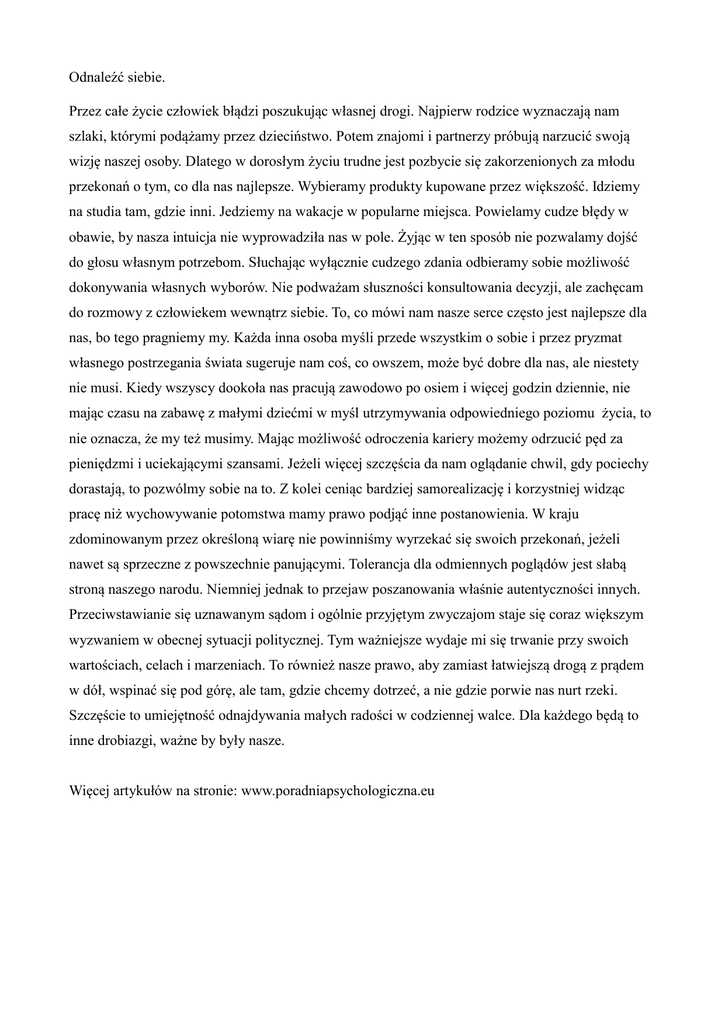 Odnaleźć siebie. Przez całe życie człowiek błądzi poszukując własnej drogi. Najpierw rodzice wyznaczają nam szlaki, którymi podążamy przez dzieciństwo. Potem znajomi i partnerzy próbują narzucić swoją wizję naszej osoby. Dlatego w dorosłym życiu trudne jest pozbycie się zakorzenionych za młodu przekonań o tym, co dla nas najlepsze. Wybieramy produkty kupowane przez większość. Idziemy na studia tam, gdzie inni. Jedziemy na wakacje w popularne miejsca. Powielamy cudze błędy w obawie, by nasza intuicja nie wyprowadziła nas w pole. Żyjąc w ten sposób nie pozwalamy dojść do głosu własnym potrzebom. Słuchając wyłącznie cudzego zdania odbieramy sobie możliwość dokonywania własnych wyborów. Nie podważam słuszności konsultowania decyzji, ale zachęcam do rozmowy z człowiekem wewnątrz siebie. To, co mówi nam nasze serce często jest najlepsze dla nas, bo tego pragniemy my. Każda inna osoba myśli przede wszystkim o sobie i przez pryzmat własnego postrzegania świata sugeruje nam coś, co owszem, może być dobre dla nas, ale niestety nie musi. Kiedy wszyscy dookoła nas pracują zawodowo po osiem i więcej godzin dziennie, nie mając czasu na zabawę z małymi dziećmi w myśl utrzymywania odpowiedniego poziomu życia, to nie oznacza, że my też musimy. Mając możliwość odroczenia kariery możemy odrzucić pęd za pieniędzmi i uciekającymi szansami. Jeżeli więcej szczęścia da nam oglądanie chwil, gdy pociechy dorastają, to pozwólmy sobie na to. Z kolei ceniąc bardziej samorealizację i korzystniej widząc pracę niż wychowywanie potomstwa mamy prawo podjąć inne postanowienia. W kraju zdominowanym przez określoną wiarę nie powinniśmy wyrzekać się swoich przekonań, jeżeli nawet są sprzeczne z powszechnie panującymi. Tolerancja dla odmiennych poglądów jest słabą stroną naszego narodu. Niemniej jednak to przejaw poszanowania właśnie autentyczności innych. Przeciwstawianie się uznawanym sądom i ogólnie przyjętym zwyczajom staje się coraz większym wyzwaniem w obecnej sytuacji politycznej. Tym ważniejsze wydaje mi się trwanie przy swoich wartościach, celach i marzeniach. To również nasze prawo, aby zamiast łatwiejszą drogą z prądem w dół, wspinać się pod górę, ale tam, gdzie chcemy dotrzeć, a nie gdzie porwie nas nurt rzeki. Szczęście to umiejętność odnajdywania małych radości w codziennej walce. Dla każdego będą to inne drobiazgi, ważne by były nasze. Więcej artykułów na stronie: www.poradniapsychologiczna.eu