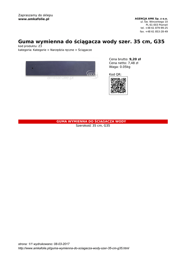 Zapraszamy do sklepu www.amkafolie.pl AGENCJA AMK Sp. z o.o. ul. Św. Wincentego 10 PL 61-003 Poznań tel. +48 61 879-99-25 fax. +48 61 853-28-49 Guma wymienna do ściągacza wody szer. 35 cm, G35 kod produktu: Z3 kategoria: Kategorie > Narzędzia ręczne > Ściągacze Cena brutto: 9,20 zł Cena netto: 7,48 zł Waga: 0.05kg Kod QR: GUMA WYMIENNA DO ŚCIĄGACZA WODY Szerokość 35 cm, G35 strona: 1/1 wydrukowano: 08-03-2017 http://www.amkafolie.pl/guma-wymienna-do-sciagacza-wody-szer-35-cm-g35.html