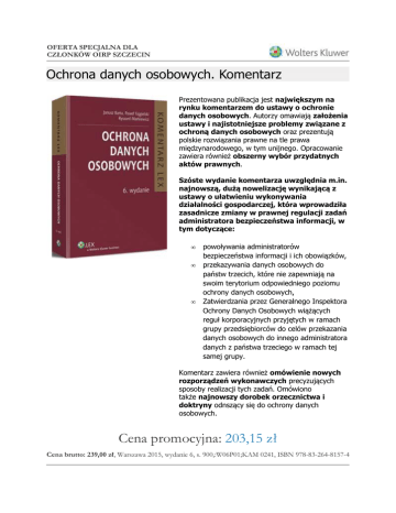 OFERTA SPECJALNA DLA CZŁONKÓW OIRP SZCZECIN Ochrona danych osobowych. Komentarz Prezentowana publikacja jest największym na rynku komentarzem do ustawy o ochronie danych osobowych. Autorzy omawiają założenia ustawy i najistotniejsze problemy związane z ochroną danych osobowych oraz prezentują polskie rozwiązania prawne na tle prawa międzynarodowego, w tym unijnego. Opracowanie zawiera również obszerny wybór przydatnych aktów prawnych. Szóste wydanie komentarza uwzględnia m.in. najnowszą, dużą nowelizację wynikającą z ustawy o ułatwieniu wykonywania działalności gospodarczej, która wprowadziła zasadnicze zmiany w prawnej regulacji zadań administratora bezpieczeństwa informacji, w tym dotyczące: • • • powoływania administratorów bezpieczeństwa informacji i ich obowiązków, przekazywania danych osobowych do państw trzecich, które nie zapewniają na swoim terytorium odpowiedniego poziomu ochrony danych osobowych, Zatwierdzania przez Generalnego Inspektora Ochrony Danych Osobowych wiążących reguł korporacyjnych przyjętych w ramach grupy przedsiębiorców do celów przekazania danych osobowych do innego administratora danych z państwa trzeciego w ramach tej samej grupy. Komentarz zawiera również omówienie nowych rozporządzeń wykonawczych precyzujących sposoby realizacji tych zadań. Omówiono także najnowszy dorobek orzecznictwa i doktryny odnszący się do ochrony danych osobowych. Cena promocyjna: 203,15 zł Cena brutto: 239,00 zł, Warszawa 2015, wydanie 6, s. 900,:W06P01;KAM 0241, ISBN 978-83-264-8157-4 FORMULARZ ZAMÓWIENIA L.p. Tytuł KOD Cena brutto Cena po rabacie 1 KAM0241:W06P01 239,00 203,15 Ochrona danych osobowych. Komentarz Ilość egz. Razem zł Imię i nazwisko Firma NIP Ulica Kod Miasto Tel.: Faks: E-mail: ADRES WYSYŁKOWY (jeśli inny od podanego obok): Odbiorca: Ulica Kod Miasto WYSYŁKA: PŁATNOŚĆ: Pocztą na koszt wydawnictwa Wysyłka priorytetowa - Poczta Polska (12,00 zł brutto) Kurierem na koszt klienta (15,90 zł brutto) Pobranie (Płatność przy odbiorze) Przelew (Termin płatności: 14 dni od daty wystawienia faktury) Kurierem na koszt klienta (15,90 zł brutto) Paweł Gulbinowicz 728 323 630 22 326 24 22 [email protected] www.profinfo.pl Zamówienie prosimy składać faksem 22 326 24 22 lub pocztą elektroniczną [email protected]