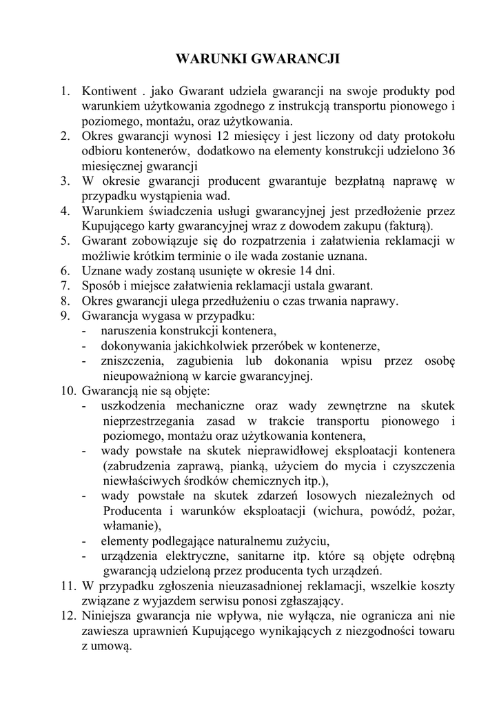 WARUNKI GWARANCJI 1. Kontiwent . jako Gwarant udziela gwarancji na swoje produkty pod warunkiem użytkowania zgodnego z instrukcją transportu pionowego i poziomego, montażu, oraz użytkowania. 2. Okres gwarancji wynosi 12 miesięcy i jest liczony od daty protokołu odbioru kontenerów, dodatkowo na elementy konstrukcji udzielono 36 miesięcznej gwarancji 3. W okresie gwarancji producent gwarantuje bezpłatną naprawę w przypadku wystąpienia wad. 4. Warunkiem świadczenia usługi gwarancyjnej jest przedłożenie przez Kupującego karty gwarancyjnej wraz z dowodem zakupu (fakturą). 5. Gwarant zobowiązuje się do rozpatrzenia i załatwienia reklamacji w możliwie krótkim terminie o ile wada zostanie uznana. 6. Uznane wady zostaną usunięte w okresie 14 dni. 7. Sposób i miejsce załatwienia reklamacji ustala gwarant. 8. Okres gwarancji ulega przedłużeniu o czas trwania naprawy. 9. Gwarancja wygasa w przypadku: - naruszenia konstrukcji kontenera, - dokonywania jakichkolwiek przeróbek w kontenerze, - zniszczenia, zagubienia lub dokonania wpisu przez osobę nieupoważnioną w karcie gwarancyjnej. 10. Gwarancją nie są objęte: - uszkodzenia mechaniczne oraz wady zewnętrzne na skutek nieprzestrzegania zasad w trakcie transportu pionowego i poziomego, montażu oraz użytkowania kontenera, - wady powstałe na skutek nieprawidłowej eksploatacji kontenera (zabrudzenia zaprawą, pianką, użyciem do mycia i czyszczenia niewłaściwych środków chemicznych itp.), - wady powstałe na skutek zdarzeń losowych niezależnych od Producenta i warunków eksploatacji (wichura, powódź, pożar, włamanie), - elementy podlegające naturalnemu zużyciu, - urządzenia elektryczne, sanitarne itp. które są objęte odrębną gwarancją udzieloną przez producenta tych urządzeń. 11. W przypadku zgłoszenia nieuzasadnionej reklamacji, wszelkie koszty związane z wyjazdem serwisu ponosi zgłaszający. 12. Niniejsza gwarancja nie wpływa, nie wyłącza, nie ogranicza ani nie zawiesza uprawnień Kupującego wynikających z niezgodności towaru z umową. INSTRUKCJA TRANSPORTU PIONOWEGO I POZIOMEGO ORAZ MONTAŻU I UŻYTKOWANIA KONTENERA 1. Transport pionowy (załadunek) - załadunek kontenera może odbywać się za pomocą żurawia o udźwigu nie mniejszym niż 6 ton, - do transportu pionowego należy stosować zawiesie linowe lub łańcuchowe cztero cięgnowe oraz odpowiadające wymaganiom haki, - haki zawiesi zakłada hakowy, na 4 ogniwa lub otwory wykonane w konstrukcji stropodachu. UWAGA: jeżeli pokrycie dachu wykonane jest z membrany z PVC, podczas zakładania haków należy zwrócić uwagę, by jej nie uszkodzić. 2. Transport poziomy może odbywać się dowolnym środkiem transportu drogowego lub kolejowego pod warunkiem, że ładowność środka oraz powierzchnia załadunku dostosowana jest do masy i wymiarów przewożonego kontenera. Kontener należy zabezpieczyć przed przesuwaniem się i uszkodzeniami mechanicznymi. UWAGA: Przy planowaniu trasy transportu poziomego należy wziąć pod uwagę sumę wysokości platformy środka transportu i wysokości kontenera w celu uniknięcia kolizji na trasie przejazdu (wiadukty, linie energetyczne, tramwajowe i telefoniczne itp.) 3. Transport pionowy (rozładunek) i montaż. Montaż kontenera obejmuje - wytyczenie, ustawienie, wypoziomowanie bloczków fundamentowych lub fundamentów na uprzednio wyrównanym i stabilnym gruncie. Bloczków fundamentowych dla pojedynczego kontenera powinno być 6 szt. (po 3 szt. na długim boku kontenera, 2szt. w narożach i 1szt. w środku), - sprawdzenie i ewentualne skorygowanie ustawionego kontenera, - po zdjęciu haków, otwory transportowe należy zabezpieczyć przed wodą (założyć obróbki blacharskie uszczelniając uszczelniaczem – dostarczonymi przez Producenta kontenerów), - podłączenie instalacji zewnętrznej (elektrycznej, wodno – kanalizacyjnej, telefonicznej itp.). 4. Użytkowanie. - kontenery przeznaczone są na stały lub czasowy pobyt ludzi i pełni funkcje szatni, umywalni, łaźni, jadalni lub mieszkalne. W związku z użytkowaniem zachodzi potrzeba okresowego mycia podłogi, okien i ścian. Do mycia należy używać ogólnodostępnych płynnych środków czystości oraz miękkich ścierek., - zabrania się używania substancji żrących, rozpuszczalników organicznych, kwasów, - w podłodze i ścianach nie należy wiercić otworów w celu mocowania jakichkolwiek przedmiotów, - okresowo należy sprawdzać drożność rynien oraz rur spustowych (szczególnie w przypadku gdy kontenery stoją na obszarze zadrzewionym). 5. Wszystkie urządzenia będące na wyposażeniu kontenera, należy użytkować, konserwować i serwisować zgodnie z zaleceniami producenta (dotyczy: klimatyzatorów, bloków kuchennych, podgrzewaczy elektrycznych wody, grzejników elektrycznych, armatury, ceramiki itp.). KARTA GWARANCYJNA Nr fabryczny: Nr faktury: Data sprzedaży: Pieczęć i podpis Sprzedawcy: ........................................................................ Opis zgłoszonej wady: ......................................................................................................................... ......................................................................................................................... ......................................................................................................................... ......................................................................................................................... ......................................................................................................................... ......................................................................................................................... ........................................................ (pieczątka, podpis, data)