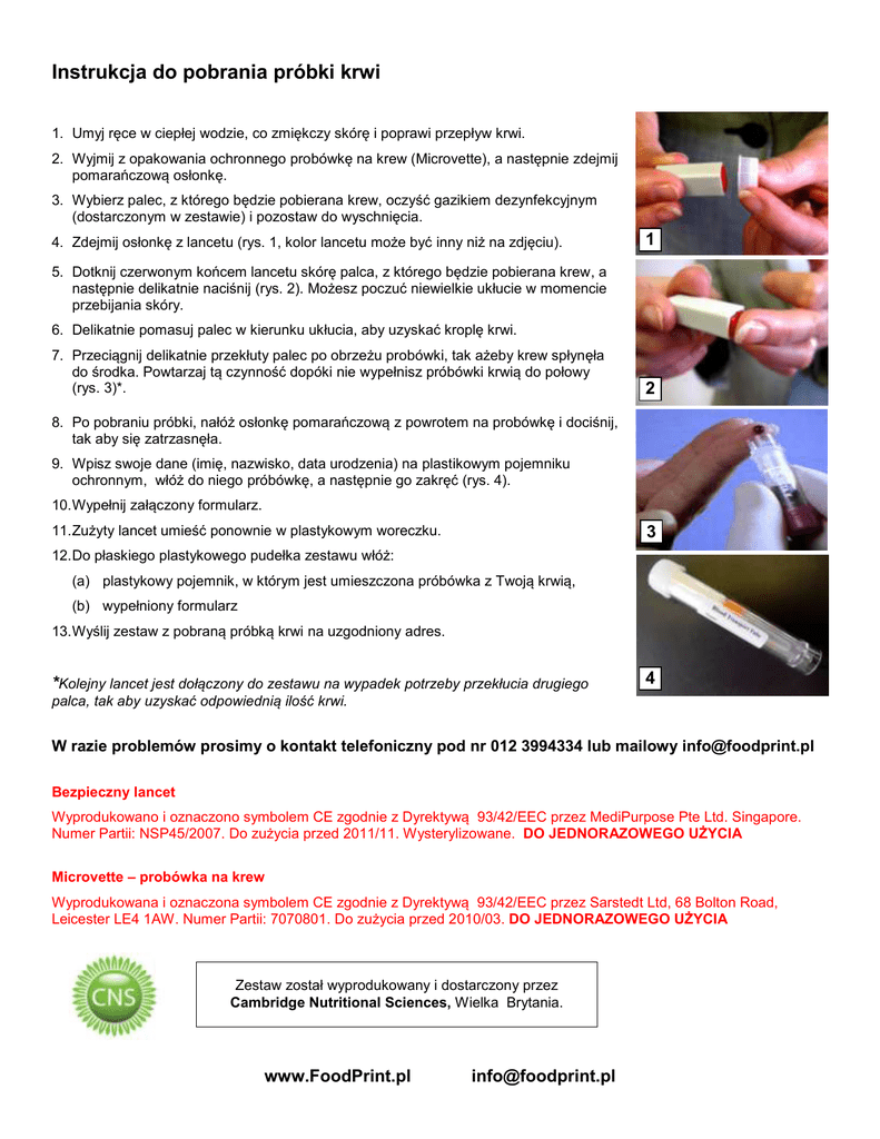 Instrukcja do pobrania próbki krwi 1. Umyj ręce w ciepłej wodzie, co zmiękczy skórę i poprawi przepływ krwi. 2. Wyjmij z opakowania ochronnego probówkę na krew (Microvette), a następnie zdejmij pomarańczową osłonkę. 3. Wybierz palec, z którego będzie pobierana krew, oczyść gazikiem dezynfekcyjnym (dostarczonym w zestawie) i pozostaw do wyschnięcia. 4. Zdejmij osłonkę z lancetu (rys. 1, kolor lancetu może być inny niż na zdjęciu). 1 5. Dotknij czerwonym końcem lancetu skórę palca, z którego będzie pobierana krew, a następnie delikatnie naciśnij (rys. 2). Możesz poczuć niewielkie ukłucie w momencie przebijania skóry. 6. Delikatnie pomasuj palec w kierunku ukłucia, aby uzyskać kroplę krwi. 7. Przeciągnij delikatnie przekłuty palec po obrzeżu probówki, tak ażeby krew spłynęła do środka. Powtarzaj tą czynność dopóki nie wypełnisz próbówki krwią do połowy (rys. 3)*. 2 8. Po pobraniu próbki, nałóż osłonkę pomarańczową z powrotem na probówkę i dociśnij, tak aby się zatrzasnęła. 9. Wpisz swoje dane (imię, nazwisko, data urodzenia) na plastikowym pojemniku ochronnym, włóż do niego próbówkę, a następnie go zakręć (rys. 4). 10. Wypełnij załączony formularz. 11. Zużyty lancet umieść ponownie w plastykowym woreczku. 3 12. Do płaskiego plastykowego pudełka zestawu włóż: (a) plastykowy pojemnik, w którym jest umieszczona próbówka z Twoją krwią, (b) wypełniony formularz 13. Wyślij zestaw z pobraną próbką krwi na uzgodniony adres. *Kolejny lancet jest dołączony do zestawu na wypadek potrzeby przekłucia drugiego 4 palca, tak aby uzyskać odpowiednią ilość krwi. W razie problemów prosimy o kontakt telefoniczny pod nr 012 3994334 lub mailowy [email protected] Bezpieczny lancet Wyprodukowano i oznaczono symbolem CE zgodnie z Dyrektywą 93/42/EEC przez MediPurpose Pte Ltd. Singapore. Numer Partii: NSP45/2007. Do zużycia przed 2011/11. Wysterylizowane. DO JEDNORAZOWEGO UŻYCIA Microvette – probówka na krew Wyprodukowana i oznaczona symbolem CE zgodnie z Dyrektywą 93/42/EEC przez Sarstedt Ltd, 68 Bolton Road, Leicester LE4 1AW. Numer Partii: 7070801. Do zużycia przed 2010/03. DO JEDNORAZOWEGO UŻYCIA Zestaw został wyprodukowany i dostarczony przez Cambridge Nutritional Sciences, Wielka Brytania. www.FoodPrint.pl [email protected] ZESTAW DO POBRANIA PRÓBKI KRWI Przed rozpoczęciem zapoznaj się dokładnie z Instrukcją pobrania próbki krwi. Przechowuj w miejscu niedostępnym dla dzieci. Zawartość opakowania: 1. Microvette: Probówka do pobrania krwi, wyłącznie do jednorazowego użycia (wyprodukowana i oznaczona symbolem CE zgodnie z Dyrektywą 93/42/EEC przez Sarstedt Ltd, 68 Bolton Road, Leicester LE4 1AW). 2. Bezpieczny lancet: Lancet do przekłucia palca, wyłącznie do jednorazowego użycia. Drugi lancet jest dołączony na wypadek potrzeby pobrania krwi z innego palca (wyprodukowana i oznaczona symbolem CE [CE 0197] zgodnie z Dyrektywą 93/42/EEC przez MediPurpose Pte Ltd. Singapore). 3. Gazik dezynfekcyjny 4. Plastykowy woreczek na zużyte materiały. 5. Plastykowy pojemnik ochronny dla probówkę. 6. Formularz zlecenia 7. Instrukcja pobrania próbki krwi Pojemnik ochronny na probówkę Gazik dezynfekcyjny Microvette – – probówka do pobierania krwi Woreczek na zużyte materiały Sterylny lancet zabezpieczony www.FoodPrint.pl [email protected]