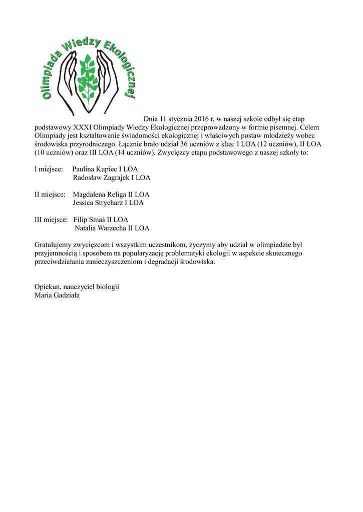 Dnia 11 stycznia 2016 r. w naszej szkole odbył się etap podstawowy XXXI Olimpiady Wiedzy Ekologicznej przeprowadzony w formie pisemnej. Celem Olimpiady jest kształtowanie świadomości ekologicznej i właściwych postaw młodzieży wobec środowiska przyrodniczego. Łącznie brało udział 36 uczniów z klas: I LOA (12 uczniów), II LOA (10 uczniów) oraz III LOA (14 uczniów). Zwycięzcy etapu podstawowego z naszej szkoły to: I miejsce: Paulina Kupiec I LOA Radosław Zagrajek I LOA II miejsce: Magdalena Religa II LOA Jessica Strycharz I LOA III miejsce: Filip Smaś II LOA Natalia Warzecha II LOA Gratulujemy zwycięzcom i wszystkim uczestnikom, życzymy aby udział w olimpiadzie był przyjemnością i sposobem na popularyzację problematyki ekologii w aspekcie skutecznego przeciwdziałania zanieczyszczeniom i degradacji środowiska. Opiekun, nauczyciel biologii Maria Gadziała