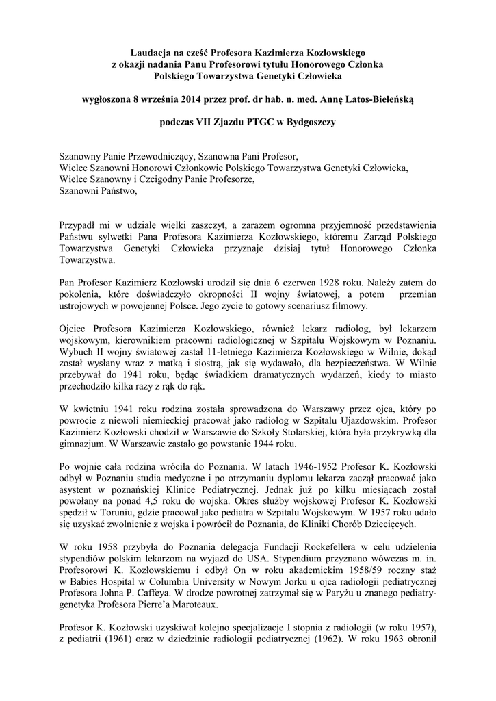 Laudacja na cześć Profesora Kazimierza Kozłowskiego z okazji nadania Panu Profesorowi tytułu Honorowego Członka Polskiego Towarzystwa Genetyki Człowieka wygłoszona 8 września 2014 przez prof. dr hab. n. med. Annę Latos-Bieleńską podczas VII Zjazdu PTGC w Bydgoszczy Szanowny Panie Przewodniczący, Szanowna Pani Profesor, Wielce Szanowni Honorowi Członkowie Polskiego Towarzystwa Genetyki Człowieka, Wielce Szanowny i Czcigodny Panie Profesorze, Szanowni Państwo, Przypadł mi w udziale wielki zaszczyt, a zarazem ogromna przyjemność przedstawienia Państwu sylwetki Pana Profesora Kazimierza Kozłowskiego, któremu Zarząd Polskiego Towarzystwa Genetyki Człowieka przyznaje dzisiaj tytuł Honorowego Członka Towarzystwa. Pan Profesor Kazimierz Kozłowski urodził się dnia 6 czerwca 1928 roku. Należy zatem do pokolenia, które doświadczyło okropności II wojny światowej, a potem przemian ustrojowych w powojennej Polsce. Jego życie to gotowy scenariusz filmowy. Ojciec Profesora Kazimierza Kozłowskiego, również lekarz radiolog, był lekarzem wojskowym, kierownikiem pracowni radiologicznej w Szpitalu Wojskowym w Poznaniu. Wybuch II wojny światowej zastał 11-letniego Kazimierza Kozłowskiego w Wilnie, dokąd został wysłany wraz z matką i siostrą, jak się wydawało, dla bezpieczeństwa. W Wilnie przebywał do 1941 roku, będąc świadkiem dramatycznych wydarzeń, kiedy to miasto przechodziło kilka razy z rąk do rąk. W kwietniu 1941 roku rodzina została sprowadzona do Warszawy przez ojca, który po powrocie z niewoli niemieckiej pracował jako radiolog w Szpitalu Ujazdowskim. Profesor Kazimierz Kozłowski chodził w Warszawie do Szkoły Stolarskiej, która była przykrywką dla gimnazjum. W Warszawie zastało go powstanie 1944 roku. Po wojnie cała rodzina wróciła do Poznania. W latach 1946-1952 Profesor K. Kozłowski odbył w Poznaniu studia medyczne i po otrzymaniu dyplomu lekarza zaczął pracować jako asystent w poznańskiej Klinice Pediatrycznej. Jednak już po kilku miesiącach został powołany na ponad 4,5 roku do wojska. Okres służby wojskowej Profesor K. Kozłowski spędził w Toruniu, gdzie pracował jako pediatra w Szpitalu Wojskowym. W 1957 roku udało się uzyskać zwolnienie z wojska i powrócił do Poznania, do Kliniki Chorób Dziecięcych. W roku 1958 przybyła do Poznania delegacja Fundacji Rockefellera w celu udzielenia stypendiów polskim lekarzom na wyjazd do USA. Stypendium przyznano wówczas m. in. Profesorowi K. Kozłowskiemu i odbył On w roku akademickim 1958/59 roczny staż w Babies Hospital w Columbia University w Nowym Jorku u ojca radiologii pediatrycznej Profesora Johna P. Caffeya. W drodze powrotnej zatrzymał się w Paryżu u znanego pediatrygenetyka Profesora Pierre’a Maroteaux. Profesor K. Kozłowski uzyskiwał kolejno specjalizacje I stopnia z radiologii (w roku 1957), z pediatrii (1961) oraz w dziedzinie radiologii pediatrycznej (1962). W roku 1963 obronił pracę dokorską, a w roku 1966 uzyskał w Warszawie tytuł doktora habilitowanego na podstawie pracy habilitacyjnej „Dysplazje przynasadowe”. W latach 1968-1970 Prof. Kazimierz Kozłowski pracował w Krakowie, w PolskoAmerykańskim Instytucie Pediatrii, gdzie był kierownikiem Pracowni Radiologicznej. W 1970 wrócił do Poznania. W 1971 roku, za sprawą Dr D. Bowdlera, kierownika Pracowni Radiologicznej Royal Alexandra Hospital for Children w Sydney, Prof. K. Kozłowski wyjechał z rodziną do Sydney w Australii, gdzie pracował jako radiolog i rozwijał swoje pasje naukowe. Pan Profesor Kazimierz Kozłowski to lekarz i naukowiec światowej sławy, światowy autorytet w dziedzinie wad kostnych, zwłaszcza dysplazji kostnych. W bazie PubMed znajdziemy ponad 400 publikacji autorstwa Pana Profesora. W bazie OMIM Profesor K. Kozłowski jest cytowany w 155 miejscach. Aż 12 zespołów ma w nazwie „Kozłowski” ! W przypadku Profesora K. Kozłowskiego nie ma potrzeby mówić o setkach prac, cytowaniach, IF i HI. Prof. Kozłowskiego znają wszyscy genetycy kliniczni i wszyscy radiolodzy świata. Znakomity ambasador Polski. Cały czas czynny naukowo, publikuje z naukowcami z całego świata. Posiada liczne publikacje z Polakami, wielu obecnych tutaj jest współautorami prac Pana Profesora K. Kozłowskiego. Od lat korzystamy także z konsultacji klinicznych Pana Profesora, za co my i pacjenci jesteśmy szczególnie wdzięczni. Katedrę i Zakład Genetyki Medycznej UM w Poznaniu spotkał niezwykły zaszczyt – Pan Profesor podarował nam znaczną część swojej biblioteki medycznej. Od kilku miesięcy Katedra jest w nowej pięknej siedzibie, gdzie podarowane zbiory znajdą godną oprawę. Dziękując za wkład Pana Profesora w genetykę polską i światową, składamy najserdeczniejsze życzenia długich lat życia w dobrym zdrowiu, kolejnych publikacji i jeszcze wielu takich serdecznych spotkań w Polsce.