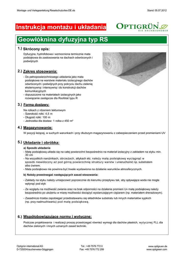 Montage- und Verlegeanleitung Rieselschutzvlies-DE.xls Stand: 05.07.2012 Instrukcja montażu i układania Geowłóknina dyfuzyjna typ RS 1.) Skrócony opis: Dyfuzyjna, hydrofobowa i wzmocniona termicznie mata podsiąkowa do zastosowania na dachach odwróconych i podwójnych 2.) Zakres stosowania: - Do pełnopowierzchniowego układania jako mata podsiąkowa na warstwie materiału izolacyjnego dachów odwróconych i podwójnych przy pokryciu dachu zielenią ekstensywną i intensywną i do konstrukcji dachów komunikacyjnych - dopuszczone na materiałach izolacyjnych jako rozwiązanie zastępcze dla Roofstat typu R 3.) Forma dostawy: Na rolkach z rdzeniem tekturowym - Szerokość rolki: 4,5 m - Długość rolki: 100 m - Jednostka dla dostaw: 1 rolka z 450 m² 4.) Magazynowanie: W pozycji leżącej, w suchych warunkach i przy dłuższym magazynowaniu z zabezpieczeniem przed promieniami UV 5.) Układanie i obróbka: a) Sposób układania - Matę podsiąkową układa się na całej powierzchni bezpośrednio na materiał izolacyjny z zakładem na styku min. 30 cm - Na wszystkich narożnikach, obrzeżach, attykach etc. należy matę podsiąkową wyciągnąć w sposób niewidoczny aż pod górną powierzchnię struktury warstw i unieruchomić np. substratem albo żwirem. - Mata podsiąkowa nie powinna być trwale wystawiona na działanie warunków atmosferycznych. b) Należy przestrzegać następujących zasad stosowania: - Zakłady na styku należy umiejscowić poprzecznie do kierunku przepływu tak, aby spływająca woda nie mogła wpłynąć pod styk - Ze względu na możliwość zwiania oraz na brak odporności na działanie promieni Uv matę podsiąkową należy bezpośrednio po ułożeniu w miarę możliwości dociążyć wystarczającym ciężarem (np. materiałem drenażowym). - Zasadniczo trzeba zapobiegać przedostawaniu się składników substratu lub innych materiałów sypkich (np. przy nadmuchiwaniu) pod matę podsiąkową. 6.) Współobowiązujące normy i wytyczne: Podczas projektowania i realizacji proszę przestrzegać również wymogi dla dachów płaskich, wytycznej FLL dla dachów zielonych i innych uznanych zasad techniki. Optigrün international AG D-72505 Krauchenwies-Göggingen Tel.: +49 7576 772 0 Fax: +49 7576 772 299 www.optigruen.de www.optigreen.com