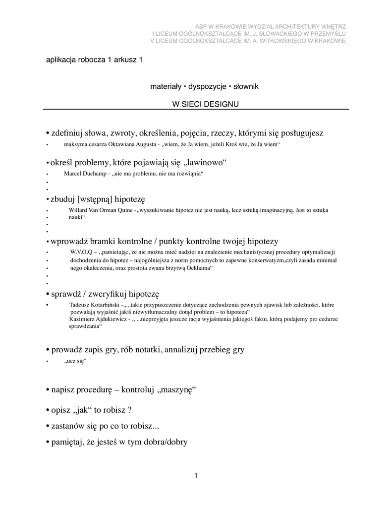 ASP W KRAKOWIE WYDZIAŁ ARCHITEKTURY WNĘTRZ I LICEUM OGÓLNOKSZTAŁCĄCE IM. J. SŁOWACKIEGO W PRZEMYŚLU V LICEUM OGÓLNOKSZTAŁCĄCE IM. A. WITKOWSKIEGO W KRAKOWIE aplikacja robocza 1 arkusz 1 materiały • dyspozycje • słownik W SIECI DESIGNU • zdefiniuj słowa, zwroty, określenia, pojęcia, rzeczy, którymi się posługujesz • maksyma cesarza Oktawiana Augusta - ,,wiem, że Ja wiem, jeżeli Ktoś wie, że Ja wiem“ • określ problemy, które pojawiają się ,,lawinowo“ • • • Marcel Duchamp - ,,nie ma problemu, nie ma rozwiąnia“ • zbuduj [wstępną] hipotezę • • • • Willard Van Orman Quine -,,wyszukiwanie hipotez nie jest nauką, lecz sztuką imaginacyjną. Jest to sztuka nauki“ • wprowadż bramki kontrolne / punkty kontrolne twojej hipotezy • • • • • W.V.O.Q – ‚,pamietając, że nie można mieć nadziei na znalezienie mechanistycznej procedury optymalizacji dochodzenia do hipotez – najogólniejsza z norm pomocnych to zapewne konserwatyzm,czyli zasada minimal nego okaleczenia, oraz prostota zwana brzytwą Ockhama“ • sprawdż / zweryfikuj hipotezę • Tadeusz Kotarbiński -,,...takie przypuszczenie dotyczące zachodzenia pewnych zjawisk lub zależności, które pozwalają wyjaśnić jakiś niewytłumaczalny dotąd problem – to hipoteza“ Kazimierz Ajdukiewicz - ,, ...nieprzyjęta jeszcze racja wyjaśnienia jakiegoś faktu, którą podajemy pro cedurze sprawdzania“ • prowadż zapis gry, rób notatki, annalizuj przebieg gry • ,,ucz się“ • napisz procedurę – kontroluj ,,maszynę“ • opisz ,,jak“ to robisz ? • zastanów się po co to robisz... • pamiętaj, że jesteś w tym dobra/dobry 1 ASP W KRAKOWIE WYDZIAŁ ARCHITEKTURY WNĘTRZ I LICEUM OGÓLNOKSZTAŁCĄCE IM. J. SŁOWACKIEGO W PRZEMYŚLU V LICEUM OGÓLNOKSZTAŁCĄCE IM. A. WITKOWSKIEGO W KRAKOWIE • słownik hipoteza ( gr. hypóthesis = przypuszcenie ) 1.założenie oparte na prawdopodobieństwie, wymagające sprawdzenia; jakie kolwiek orzecenie niezupełnie pewne, przypuszczenie. 2. zdanie nie wpełni uzaszdnione, rozważanie jako racja, dla pewnych uznanych zdań. imaginacja ( łac. imaginatio = wyobrażenie ) 1. zdolność wyobra żania sobie rzeczy nie istniejących lub nie widzianych, tworzenie obrazów lub sytuacji urojonych; wybujała fan tazja, wyobrażnia. 2. Wytwór wyobrażni, rzecz wymyślo – na, urojenie. 2