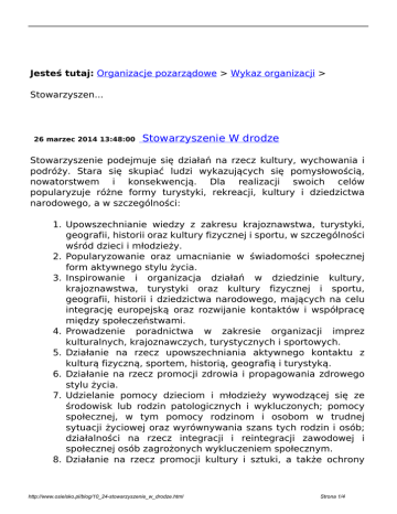Jesteś tutaj: Organizacje pozarządowe > Wykaz organizacji > Stowarzyszen... 26 marzec 2014 13:48:00 Stowarzyszenie W drodze Stowarzyszenie podejmuje się działań na rzecz kultury, wychowania i podróży. Stara się skupiać ludzi wykazujących się pomysłowością, nowatorstwem i konsekwencją. Dla realizacji swoich celów popularyzuje różne formy turystyki, rekreacji, kultury i dziedzictwa narodowego, a w szczególności: 1. Upowszechnianie wiedzy z zakresu krajoznawstwa, turystyki, geografii, historii oraz kultury fizycznej i sportu, w szczególności wśród dzieci i młodzieży. 2. Popularyzowanie oraz umacnianie w świadomości społecznej form aktywnego stylu życia. 3. Inspirowanie i organizacja działań w dziedzinie kultury, krajoznawstwa, turystyki oraz kultury fizycznej i sportu, geografii, historii i dziedzictwa narodowego, mających na celu integrację europejską oraz rozwijanie kontaktów i współpracę między społeczeństwami. 4. Prowadzenie poradnictwa w zakresie organizacji imprez kulturalnych, krajoznawczych, turystycznych i sportowych. 5. Działanie na rzecz upowszechniania aktywnego kontaktu z kulturą fizyczną, sportem, historią, geografią i turystyką. 6. Działanie na rzecz promocji zdrowia i propagowania zdrowego stylu życia. 7. Udzielanie pomocy dzieciom i młodzieży wywodzącej się ze środowisk lub rodzin patologicznych i wykluczonych; pomocy społecznej, w tym pomocy rodzinom i osobom w trudnej sytuacji życiowej oraz wyrównywania szans tych rodzin i osób; działalności na rzecz integracji i reintegracji zawodowej i społecznej osób zagrożonych wykluczeniem społecznym. 8. Działanie na rzecz promocji kultury i sztuki, a także ochrony http://www.osielsko.pl/blog/10_24-stowarzyszenie_w_drodze.html Strona 1/4 9. 10. 11. 12. 13. 14. 15. 16. 17. dóbr kultury i tradycji oraz dziedzictwa narodowego. Upowszechnianie wiedzy ekologicznej oraz działanie mające na celu ochronę dziedzictwa przyrodniczego. Promocja i organizacja wolontariatu. Podtrzymywania i upowszechniania tradycji narodowej, pielęgnowania polskości oraz rozwoju świadomości narodowej, obywatelskiej i kulturowej. Działalności na rzecz mniejszości narodowych i etnicznych oraz języka regionalnego. Działalności na rzecz osób niepełnosprawnych. Wypoczynku dzieci i młodzieży. Turystyki i krajoznawstwa. Pomocy ofiarom katastrof, klęsk żywiołowych, konfliktów zbrojnych i wojen w kraju i za granicą. Pomocy Polonii i Polakom za granicą; promocji Rzeczypospolitej Polskiej za granicą. Stowarzyszenie “W drodze” prowadzi wiele imprez dla dzieci, młodzieży i osób, zgodnie z celami statutowymi: Bydgoski Klub Podróżnika – spotkania odbywają się w każdy, co drugi czwartek, w sezonie akademickim, w Sali K, Wyższa Szkoła Gospodarki, ul. Naruszewicza w Bydgoszczy. www.dookolaswiata24.pl Bydgoski Festiwal „Podróżnicy” – 11-12 kwietnia 2014 roku odbyła się IV edycja festiwalu, dwudniowego święta. Podczas festiwalu przyjeżdżają do Bydgoszczy podróżnicy, dziennikarze, artyści i pisarze. Coroczne edycje w Akademickiej Przestrzeni Kulturalnej, przy Wyższej Szkole Gospodarki w Bydgoszczy, ul. Królowej Jadwigi 14. www.podroznicy.byd.pl Spływy kajakowe i inne warsztaty rekreacyjne – 13 kwietnia stowarzyszenie zorganizowało spływ kajakowy Kanałem Bydgoskim w 240-tą rocznicę budowy Kanału Bydgoskiego i urodziny miasta. W spływie wzięło udział ponad 200 uczestników. Całoroczne spotkania z podróżnikami – mają na celu dotarcie do dzieci i młodzieży, dzielenia się pasją poznawania świata i edukację poprzez odnalezienie własnych http://www.osielsko.pl/blog/10_24-stowarzyszenie_w_drodze.html Strona 2/4 zainteresowań, podążanie za nowymi zainteresowaniami, szczególnie dla młodzieży z problemami społecznościowymi. Spotkania przygotowywane są w szkołach, klubach, ośrodkach kultury. Pobudzanie świadomości i odnajdowania we współczesnym świecie jest przedmiotem uaktywnienia młodego pokolenia, zgodnie z kulturą, tradycją i rozwojem zrównoważonym. Wyjazdy edukacyjne – związane z poznawaniem życia zgodnego z przekonaniami, przyrodą, tradycją i kulturą wybranego regionu. Celem wyjazdów jest zapewnienie uczestnikom równego poziomu rozwoju, na każdym poziomie wiekowym. Młodzież, szczególnie zagrożona wykluczeniem społecznym może odnaleźć własną osobowość i rozpocząć życie, kształtując swoją przyszłość według własnego postrzegania świata. Wyjazdy turystyczno – poznawcze dla członków Stowarzyszenia – mają na celu wsparcie dla osób, którzy chcą poznać inne kultury i tradycje, przy małych możliwościach ekonomicznych. Wyjazdy organizowane są zarówno w Polsce, jak i za granicę. Pełna nazwa: Adres siedziby: Nr KRS: Data rejestracji: Status prawny: Osoby uprawnione do reprezentowania organizacji: Sposób reprezentacji: http://www.osielsko.pl/blog/10_24-stowarzyszenie_w_drodze.html Stowarzyszenie „W drodze” 86-031 Osielsko Myślęcinek, ul. Bielska 1 www.podroznicy.byd.pl e-mail: [email protected] & [email protected] 0000455634 21 marzec 2013 r. stowarzyszenie Agata Kosmalska – Prezes Malwina Sypniewska – Pietch – Członek Zarządu Karolina Sypniewska – Członek Zarządu Do składania oświadczeń woli za Strona 3/4 Stowarzyszenie, w tym oświadczeń dotyczących zobowiązań majątkowych, wymagane jest łączne działanie dwóch członków Zarządu. Wsparcie finansowe z budżetu gminy Osielsko: Stowarzyszenie dotychczas nigdy nie korzystało ze wsparcia finansowego gminy Osielsko (dotacji) ani z innej formy pomocy (nie złożono żadnej oferty). Data ostatniej aktualizacji: 16 marca 2016 r. Informacje uzyskano ze Stowarzyszenia "W drodze" oraz ze stanowiska ds. współpracy z organizacjami pozarządowymi. drukuj Wróć http://www.osielsko.pl/blog/10_24-stowarzyszenie_w_drodze.html Powered by TCPDF (www.tcpdf.org) Strona 4/4