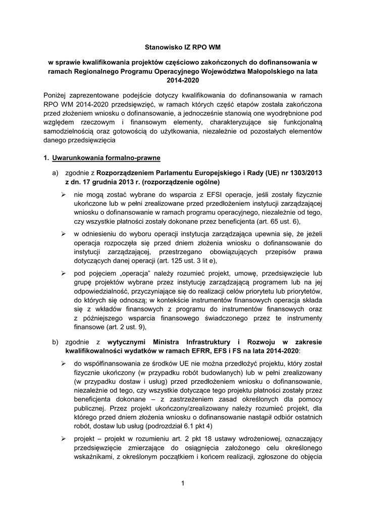 Stanowisko IZ RPO WM w sprawie kwalifikowania projektów częściowo zakończonych do dofinansowania w ramach Regionalnego Programu Operacyjnego Województwa Małopolskiego na lata 2014-2020 Poniżej zaprezentowane podejście dotyczy kwalifikowania do dofinansowania w ramach RPO WM 2014-2020 przedsięwzięć, w ramach których część etapów została zakończona przed złożeniem wniosku o dofinansowanie, a jednocześnie stanowią one wyodrębnione pod względem rzeczowym i finansowym elementy, charakteryzujące się funkcjonalną samodzielnością oraz gotowością do użytkowania, niezależnie od pozostałych elementów danego przedsięwzięcia 1. Uwarunkowania formalno-prawne a) b) zgodnie z Rozporządzeniem Parlamentu Europejskiego i Rady (UE) nr 1303/2013 z dn. 17 grudnia 2013 r. (rozporządzenie ogólne) nie mogą zostać wybrane do wsparcia z EFSI operacje, jeśli zostały fizycznie ukończone lub w pełni zrealizowane przed przedłożeniem instytucji zarządzającej wniosku o dofinansowanie w ramach programu operacyjnego, niezależnie od tego, czy wszystkie płatności zostały dokonane przez beneficjenta (art. 65 ust. 6), w odniesieniu do wyboru operacji instytucja zarządzająca upewnia się, że jeżeli operacja rozpoczęła się przed dniem złożenia wniosku o dofinansowanie do instytucji zarządzającej, przestrzegano obowiązujących przepisów prawa dotyczących danej operacji (art. 125 ust. 3 lit e), pod pojęciem „operacja” należy rozumieć projekt, umowę, przedsięwzięcie lub grupę projektów wybrane przez instytucję zarządzającą programem lub na jej odpowiedzialność, przyczyniające się do realizacji celów priorytetu lub priorytetów, do których się odnoszą; w kontekście instrumentów finansowych operacja składa się z wkładów finansowych z programu do instrumentów finansowych oraz z późniejszego wsparcia finansowego świadczonego przez te instrumenty finansowe (art. 2 ust. 9), zgodnie z wytycznymi Ministra Infrastruktury i Rozwoju w zakresie kwalifikowalności wydatków w ramach EFRR, EFS i FS na lata 2014-2020: do współfinansowania ze środków UE nie można przedłożyć projektu, który został fizycznie ukończony (w przypadku robót budowlanych) lub w pełni zrealizowany (w przypadku dostaw i usług) przed przedłożeniem wniosku o dofinansowanie, niezależnie od tego, czy wszystkie dotyczące tego projektu płatności zostały przez beneficjenta dokonane – z zastrzeżeniem zasad określonych dla pomocy publicznej. Przez projekt ukończony/zrealizowany należy rozumieć projekt, dla którego przed dniem złożenia wniosku o dofinansowanie nastąpił odbiór ostatnich robót, dostaw lub usług (podrozdział 6.1 pkt 4) projekt – projekt w rozumieniu art. 2 pkt 18 ustawy wdrożeniowej, oznaczający przedsięwzięcie zmierzające do osiągnięcia założonego celu określonego wskaźnikami, z określonym początkiem i końcem realizacji, zgłoszone do objęcia 1 albo objęte współfinansowaniem UE jednego z funduszy strukturalnych albo Funduszu Spójności w ramach programu operacyjnego (rozdz.3 pkt 1 lit. w) c) właściwa instytucja będąca stroną umowy może ograniczyć kwalifikowania wydatków przed podpisaniem umowy o dofinansowanie ma obowiązek poinformowania o tym beneficjenta odpowiednio (w przypadku projektów konkursowych – co najmniej w regulaminie (podrozdział 6.1 pkt 8) możliwość przy czym wcześniej konkursu) wydatki poniesione przed podpisaniem umowy mogą zostać uznane za kwalifikowane wyłącznie w przypadku spełnienia warunków kwalifikowalności określonych w wytycznych i umowie (podrozdział 6.1 pkt 12) zgodnie z wytycznymi Ministra Infrastruktury i Rozwoju w zakresie trybów wyboru projektów na lata 2014-2020 (rozdz. 3 pkt 6): właściwa instytucja upewnia się, że jeśli realizacja projektu zgłoszonego do objęcia dofinansowaniem rozpoczęła się przed dniem złożenia wniosku o dofinansowanie, w okresie tym przy jego realizacji przestrzegano przepisów prawa, sposób realizacji tego obowiązku zależy od właściwej instytucji i może polegać w szczególności na przeprowadzeniu kontroli uprzedniej, zgodnie z ustawą wdrożeniową, do oceny właściwej instytucji należy stwierdzenie, czy biorąc pod uwagę charakter oraz skalę ewentualnej nieprawidłowości projekt powinien być dofinansowany. 2. Analiza wybranych typów projektów w kontekście ustalenia zasad postępowania w zakresie możliwości kwalifikowania etapów / elementów zakończonych przykład 1. przedsięwzięcia dotyczące informatyzacji / cyfryzacji zasobów Wnioskodawca zgłosił do dofinansowania projekt polegający na rozwoju systemu informatycznego / digitalizacji zasobów cyfrowych. Przed złożeniem wniosku o dofinansowanie: system został już zbudowany i występuje gotowość do wymiany danych oraz udostępniania dla użytkowników, natomiast do wykonania pozostaje rozszerzenie systemu o nowe funkcjonalności i/lub rozbudowa o nowe komponenty zapewniające np. wyższy poziom dojrzałości świadczonych e-usług; część zasobów przeznaczonych do udostępnienia w postaci cyfrowej (zakres możliwy do wyodrębnienia pod względem rzeczowym i finansowym) została już zdigitalizowana i jest gotowa do udostępnienia lub została już udostępniona użytkownikom końcowym. przykład 2. przedsięwzięcia obejmujące inwestycje w grupę obiektów np. projekty z zakresu modernizacji energetycznej budynków użyteczności publicznej Wnioskodawca zgłosił do dofinansowania projekt polegający na kompleksowej modernizacji energetycznej wielu obiektów. Przed złożeniem wniosku o dofinansowanie w 2 jednym lub kilku obiektach, stanowiących element projektu, wszystkie zaplanowane dla tego zakresu prace zostały zakończone, a prace wykonane w odniesieniu do tego obiektu można zaliczyć do realizacji celów i/lub wskaźników zakładanych w projekcie. przykład 3. przedsięwzięcia dotyczące rozwoju sieci tras rowerowych Wnio
