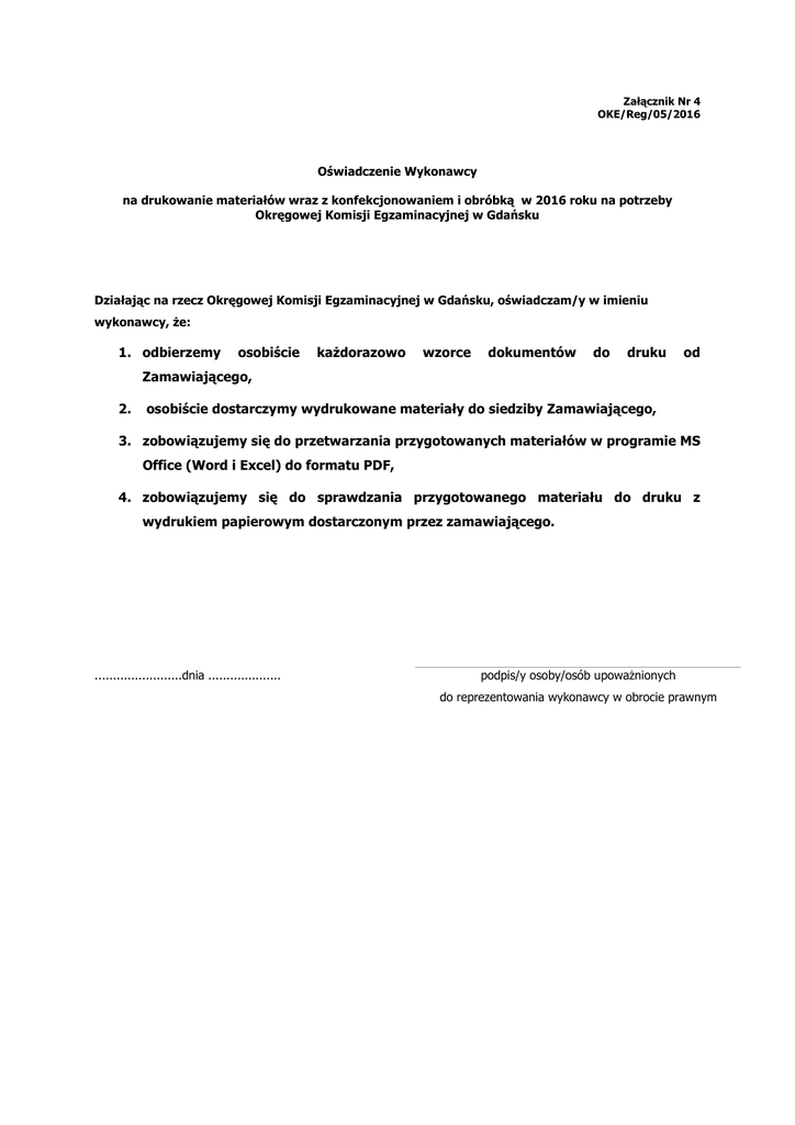 Załącznik Nr 4 OKE/Reg/05/2016 Oświadczenie Wykonawcy na drukowanie materiałów wraz z konfekcjonowaniem i obróbką w 2016 roku na potrzeby Okręgowej Komisji Egzaminacyjnej w Gdańsku Działając na rzecz Okręgowej Komisji Egzaminacyjnej w Gdańsku, oświadczam/y w imieniu wykonawcy, Ŝe: 1. odbierzemy osobiście kaŜdorazowo wzorce dokumentów do druku od Zamawiającego, 2. osobiście dostarczymy wydrukowane materiały do siedziby Zamawiającego, 3. zobowiązujemy się do przetwarzania przygotowanych materiałów w programie MS Office (Word i Excel) do formatu PDF, 4. zobowiązujemy się do sprawdzania przygotowanego materiału do druku z wydrukiem papierowym dostarczonym przez zamawiającego. ........................dnia .................... podpis/y osoby/osób upowaŜnionych do reprezentowania wykonawcy w obrocie prawnym