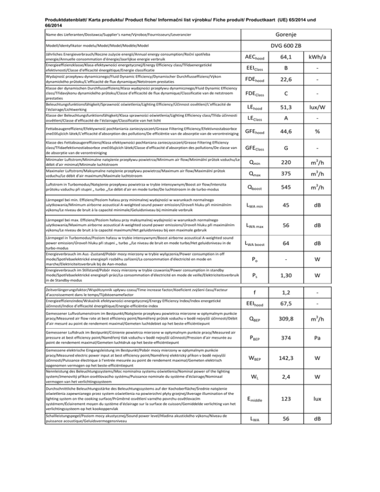 Produktdatenblatt/ Karta produktu/ Product fiche/ Informační list výrobku/ Fiche produit/ Productkaart (UE) 65/2014 und 66/2014 Gorenje Name des Lieferanten/Dostawca/Supplier's name/Výrobce/Fournisseurs/Leverancier DVG 600 ZB Modell/Identyfikator modelu/Model/Model/Modèle/Model Jährliches Energieverbrauch/Roczne zużycie energii/Annual energy consumption/Roční spotřeba energie/Annuelle consommation d'énergie/Jaarlijkse energie verbruik AEChood 64,1 kWh/a Energieeffizienzklasse/Klasa efektywności energetycznej/Energy Efficiency class/Třídaenergetické efektivnosti/Classe d'efficacité énergétique/Energie classificatie EEIClass B - Wydajność przepływu dynamicznego/Fluid Dynamic Efficiency/Dynamischer Durchflusseffizienz/Výkon dynamického průtoku/L’efficacité de flux dynamique/Netstroom prestaties FDEhood 22,6 - Klasse der dynamischen Durchflusseffizienz/Klasa wydajności przepływu dynamicznego/Fluid Dynamic Efficiency class/Třídavýkonu dynamického průtoku/Classe d'efficacité de flux dynamique/Classificatie van de netstroom prestaties FDEClass C - Beleuchtungsfunktionsfähigkeit/Sprawność oświetlenia/Lighting Efficiency/Účinnost osvětlení/L'efficacité de l'éclairage/Lichtwerking LEhood 51,3 lux/W Klasse der Beleuchtungsfunktionsfähigkeit/Klasa sprawności oświetlenia/Lighting Efficiency class/Třída účinnosti osvětlení/Classe d’efficacité de l’éclairage/Classificatie van het licht LEClass A - Fettabsaugereffizienz/Efektywność pochłaniania zanieczyszczeń/Grease Filtering Efficiency/Efektivnostabsorbce znečišťujících látek/L'efficacité d'absorption des pollutions/De efficiëntie van de absorptie van de verontreiniging GFEhood 44,6 % Klasse des Fettabsaugereffizienz/Klasa efektywności pochłaniana zanieczyszczeń/Grease Filtering Efficiency class/Třídaefektivnostiabsorbce znečišťujících látek/Classe d'efficacité d'absorption des pollutions/De classe van de absorptie van de verontreiniging GFEClass G - Minimaler Luftstrom/Minimalne natężenie przepływu powietrza/Minimum air flow/Minimální průtok vzduchu/Le débit d'air minimal/Minimale luchtstroom Qmin 220 m3/h Maximaler Luftstrom/Maksymalne natężenie przepływu powietrza/Maximum air flow/Maximální průtok vzduchu/Le débit d'air maximum/Maximale luchtstroom Qmax 375 m3/h Luftstrom in Turbomodus/Natężenie przepływu powietrza w trybie intensywnym/Boost air flow/Intenzita průtoku vzduchu při stupni „ turbo „/Le débit d'air en mode turbo/De luchtstroom in de turbo-modus Qboost 545 m3/h Lärmpegel bei min. Effizienz/Poziom hałasu przy minimalnej wydajności w warunkach normalnego użytkowania/Minimum airborne acoustical A-weighted sound power emission/Úroveň hluku při minimálním výkonu/Le niveau de bruit à la capacité minimale/Geluidsniveau bij minimale verbruik LWA min 45 dB Lärmpegel bei max. Effizienz/Poziom hałasu przy maksymalnej wydajności w warunkach normalnego użytkowania/Maximum airborne acoustical A-weighted sound power emissions/Úroveň hluku při maximálním výkonu/Le niveau de bruit à la capacité maximum/Het geluidsniveau bij een maximale gebruik LWA max 56 dB Lärmpegel in Turbomodus/Poziom hałasu w trybie intensywnym/Boost airborne acoustical A-weighted sound power emission/Úroveň hluku při stupni „ turbo „/Le niveau de bruit en mode turbo/Het geluidsniveau in de turbo-modus LWA boost 64 dB Energieverbrauch im Aus -Zustand/Pobór mocy mierzony w trybie wyłączenia/Power consumption in off mode/Spotřebaelektrické energiepři rozběhu zařízení/La consommation d'électricité en mode en marche/Elektriciteitsverbruik bij de Aan-modus Po - W Energieverbrauch im Stillstand/Pobór mocy mierzony w trybie czuwania/Power consumption in standby mode/Spotřebaelektrické energiepři práci/La consommation d'électricité en mode de veille/Elektriciteitsverbruik in de Standby-modus Ps 1,30 W f 1,2 - EEIhood 67,5 - Gemessener Luftvolumenstrom im Bestpunkt/Natężenie przepływu powietrza mierzone w optymalnym punkcie pracy/Measured air flow rate at best efficiency point/Naměřený průtok vzduchu v bodě nejvyšší účinnosti/Débit d’air mesuré au point de rendement maximal/Gemeten luchtdebiet op het beste-efficiëntiepunt QBEP 309,8 m3/h Gemessener Luftdruck im Bestpunkt/Ciśnienie powietrza mierzone w optymalnym punkcie pracy/Measured air pressure at best efficiency point/Naměřený tlak vzduchu v bodě nejvyšší účinnosti/Pression d’air mesurée au point de rendement maximal/Gemeten luchtdruk op het beste-efficiëntiepunt PBEP 374 Pa Gemessene elektrische Eingangsleistung im Bestpunkt/Pobór mocy mierzony w optymalnym punkcie pracy/Measured electric power input at best efficiency point/Naměřený elektrický příkon v bodě nejvyšší účinnosti/Puissance électrique à l’entrée mesurée au point de rendement maximal/Gemeten elektrisch opgenomen vermogen op het beste-efficiëntiepunt WBEP 142,3 W WL 2,4 W Emiddle 123 lux LWA 56 dB Zeitverlängerungsfaktor/Współczynnik upływu czasu/Time increase factor/Koeficient zvýšení času/Facteur d’accroissement dans le temps/Tijdstoenamefactor Energieeffizienzindex/Wskaźnik efektywności energetycznej/Energy Efficiency Index/Index energetické účinnosti/Indice d’efficacité énergétique/Energie-efficiëntie-index Nennleistung des Beleuchtungssystems/Moc nominalna systemu oświetlenia/Nominal power of the lighting system/Jmenovitý příkon osvětlovacího systému/Puissance nominale du système d’éclairage/Nominaal vermogen van het verlichtingssysteem Durchschnittliche Beleuchtungsstärke des Beleuchtungssystems auf der Kochoberfläche/Średnie natężenie oświetlenia zapewnianego przez system oświetlenia na powierzchni płyty grzejnej/Average illumination of the lighting system on the cooking surface/Průměrné osvětlení varného povrchu osvětlovacím systémem/Éclairement moyen du système d’éclairage sur la surface de cuisson/Gemidde