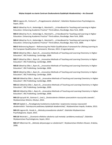 Wykaz książek na stanie Centrum Doskonalenia Dydaktyki Akademickiej – Ars Docendi 969.1 Łaguna M., Fortuna P., „Przygotowanie szkolenia”, Gdańskie Wydawnictwo Psychologiczne, Sopot, 2015. 969.2 Edited by Fry H., Ketteridge S., Marshall S., „A Handbook for Teaching and Learning in Higher Education. Enhancing Academic Practice” Third edition, Routledge, New York, 2009. 969.3 Edited by Fry H., Ketteridge S., Marshall S., „A Handbook for Teaching and Learning in Higher Education. Enhancing Academic Practice” Third edition, Routledge, New York, 2009. 969.4 Edited by Fry H., Ketteridge S., Marshall S., „A Handbook for Teaching and Learning in Higher Education. Enhancing Academic Practice” Third edition, Routledge, New York, 2009. 969.5 Referencing Report – Referencing the Polish Qualifications Framework for Lifelong Learning to the European Qualifications Framework, Warsaw, 2013. (3 egzemplarze) 969.6 Edited by Eilks I., Byers B., „Innovative Methods of Teaching and Learning Chemistry in Higher Education”, RSC Publishing, Cambridge, 2009. 969.7 Edited by Eilks I., Byers B., „Innovative Methods of Teaching and Learning Chemistry in Higher Education”, RSC Publishing, Cambridge, 2009. 969.8 Edited by Eilks I., Byers B., „Innovative Methods of Teaching and Learning Chemistry in Higher Education”, RSC Publishing, Cambridge, 2009. 969.9 Edited by Eilks I., Byers B., „Innovative Methods of Teaching and Learning Chemistry in Higher Education”, RSC Publishing, Cambridge, 2009. 969.10 Edited by Eilks I., Byers B., „Innovative Methods of Teaching and Learning Chemistry in Higher Education”, RSC Publishing, Cambridge, 2009. 969.11 Edited by Eilks I., Byers B., „Innovative Methods of Teaching and Learning Chemistry in Higher Education”, RSC Publishing, Cambridge, 2009. 969.12 Edited by Eilks I., Byers B., „Innovative Methods of Teaching and Learning Chemistry in Higher Education”, RSC Publishing, Cambridge, 2009. 969.13 Łęczycki M., Gotman E., (red.), „Doskonalenie chlebem powszednim nauczyciela zawodu”, Wydawnictwo Wolvin, Olsztyn, 2014. 969.14 Sajdak A., „Paradygmaty kształcenia studentów i wspierania rozwoju nauczycieli akademickich. Teoretyczne podstawy dydaktyki akademickiej”, Wydawnictwo Impuls, Kraków, 2013. 969.15 Łaguna M., Kozak A., „Metody prowadzenia szkoleń”, Gdańskie Wydawnictwo Psychologiczne, Sopot, 2015. 969.16 Woźniak J., „Ocenianie efektów szkolenia czyli metody i problemy ewaluacji”, Gdańskie Wydawnictwo Psychologiczne, Sopot, 2012. 969.17 Silberman M., „Metody aktywizujące w szkoleniach”, Wydawnictwo Wolters Kluwer, Kraków, 2006. 969.18 Petty G., „Nowoczesne nauczanie. Praktyczne wskazówki i techniki dla nauczycieli, wykładowców i szkoleniowców”, Gdańskie Wydawnictwo Psychologiczne, Sopot, 2015. 969.19 Covey S.R., „Ósmy nawyk”, Dom Wydawniczy REBIS, Poznań, 2015. 969.20 Covey S.R., „Trzeci- rozwiązanie”, Dom Wydawniczy REBIS, Poznań, 2012. 969.21 Bańko M. (red.), „Polszczyzna na co dzień”, Wydawnictwo Naukowe PWN, Warszawa, 2006. 969.22 Wolański A., „Edycja tekstów. Praktyczny poradnik”, Wydawnictwo Naukowe PWN, Warszawa, 2008. 969.23 Sajdak A., „Paradygmaty kształcenia studentów i wspierania rozwoju nauczycieli akademickich. Teoretyczne podstawy dydaktyki akademickiej”, Wydawnictwo Impuls, Kraków, 2013. 969.24 Sajdak A., „Paradygmaty kształcenia studentów i wspierania rozwoju nauczycieli akademickich. Teoretyczne podstawy dydaktyki akademickiej”, Wydawnictwo Impuls, Kraków, 2013. 969.25 Od kompetencji do kwalifikacji – diagnoza rozwiązań i praktyk w zakresie walidowania efektów uczenia się, Warszawa, 2013. (2 egzemplarze) 969.26 „System pracy z uczniami zdolnymi w województwie małopolskim jako produkt finalny projektu DiAMEnT – dostrzec i aktywizować możliwości, energię, talenty”. 969.27 „System pracy z uczniami zdolnymi w województwie małopolskim jako produkt finalny projektu DiAMEnT – dostrzec i aktywizować możliwości, energię, talenty”. 969.28 „Polityka zarządzania kompetencjami pracowników”, Warszawa, 2013. 969.29 „W drodze do Polskiej Ramy Kwalifikacji. Dobre praktyki w systemie kwalifikacji”, Warszawa, 2015. 969.30 „Raport samopotwierdzenia krajowych ram kwalifikacji dla szkolnictwa wyższego”, Warszawa. 969.31 „Zapewnianie jakości kwalifikacji w zintegrowanym systemie kwalifikacji”, Warszawa, 2014.