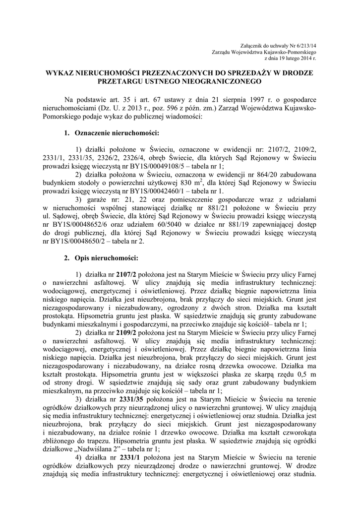 Załącznik do uchwały Nr 6/213/14 Zarządu Województwa Kujawsko-Pomorskiego z dnia 19 lutego 2014 r. WYKAZ NIERUCHOMOŚCI PRZEZNACZONYCH DO SPRZEDAŻY W DRODZE PRZETARGU USTNEGO NIEOGRANICZONEGO Na podstawie art. 35 i art. 67 ustawy z dnia 21 sierpnia 1997 r. o gospodarce nieruchomościami (Dz. U. z 2013 r., poz. 596 z późn. zm.) Zarząd Województwa KujawskoPomorskiego podaje wykaz do publicznej wiadomości: 1. Oznaczenie nieruchomości: 1) działki położone w Świeciu, oznaczone w ewidencji nr: 2107/2, 2109/2, 2331/1, 2331/35, 2326/2, 2326/4, obręb Świecie, dla których Sąd Rejonowy w Świeciu prowadzi księgę wieczystą nr BY1S/00049108/5 – tabela nr 1; 2) działka położona w Świeciu, oznaczona w ewidencji nr 864/20 zabudowana budynkiem stodoły o powierzchni użytkowej 830 m2, dla której Sąd Rejonowy w Świeciu prowadzi księgę wieczystą nr BY1S/00042460/1 – tabela nr 1. 3) garaże nr: 21, 22 oraz pomieszczenie gospodarcze wraz z udziałami w nieruchomości wspólnej stanowiącej działkę nr 881/21 położone w Świeciu przy ul. Sądowej, obręb Świecie, dla której Sąd Rejonowy w Świeciu prowadzi księgę wieczystą nr BY1S/00048652/6 oraz udziałem 60/5040 w działce nr 881/19 zapewniającej dostęp do drogi publicznej, dla której Sąd Rejonowy w Świeciu prowadzi księgę wieczystą nr BY1S/00048650/2 – tabela nr 2. 2. Opis nieruchomości: 1) działka nr 2107/2 położona jest na Starym Mieście w Świeciu przy ulicy Farnej o nawierzchni asfaltowej. W ulicy znajdują się media infrastruktury technicznej: wodociągowej, energetycznej i oświetleniowej. Przez działkę biegnie napowietrzna linia niskiego napięcia. Działka jest nieuzbrojona, brak przyłączy do sieci miejskich. Grunt jest niezagospodarowany i niezabudowany, ogrodzony z dwóch stron. Działka ma kształt prostokąta. Hipsometria gruntu jest płaska. W sąsiedztwie znajdują się grunty zabudowane budynkami mieszkalnymi i gospodarczymi, na przeciwko znajduje się kościół– tabela nr 1; 2) działka nr 2109/2 położona jest na Starym Mieście w Świeciu przy ulicy Farnej o nawierzchni asfaltowej. W ulicy znajdują się media infrastruktury technicznej: wodociągowej, energetycznej i oświetleniowej. Przez działkę biegnie napowietrzna linia niskiego napięcia. Działka jest nieuzbrojona, brak przyłączy do sieci miejskich. Grunt jest niezagospodarowany i niezabudowany, na działce rosną drzewka owocowe. Działka ma kształt prostokąta. Hipsometria gruntu jest w większości płaska ze skarpą rzędu 0,5 m od strony drogi. W sąsiedztwie znajdują się sady oraz grunt zabudowany budynkiem mieszkalnym, na przeciwko znajduje się kościół – tabela nr 1; 3) działka nr 2331/35 położona jest na Starym Mieście w Świeciu na terenie ogródków działkowych przy nieurządzonej ulicy o nawierzchni gruntowej. W ulicy znajdują się media infrastruktury technicznej: energetycznej i oświetleniowej oraz studnia. Działka jest nieuzbrojona, brak przyłączy do sieci miejskich. Grunt jest niezagospodarowany i niezabudowany, na działce rośnie 1 drzewko owocowe. Działka ma kształt czworokąta zbliżonego do trapezu. Hipsometria gruntu jest płaska. W sąsiedztwie znajdują się ogródki działkowe „Nadwiślana 2” – tabela nr 1; 4) działka nr 2331/1 położona jest na Starym Mieście w Świeciu na terenie ogródków działkowych przy nieurządzonej drodze o nawierzchni gruntowej. W drodze znajdują się media infrastruktury technicznej: energetycznej i oświetleniowej oraz studnia. Działka jest nieuzbrojona, brak przyłączy do sieci miejskich. Grunt jest częściowo zagospodarowany, rosną drzewka owocowe, z trzech stron ogrodzona. Działka ma kształt trapezu. Hipsometria gruntu jest płaska. Na działce znajduje się murowana altana ogrodowa o powierzchni zabudowy 24 m2. W sąsiedztwie znajdują się ogródki działkowe „Nadwiślana 2” oraz rozlewisko Rzeki Wdy – tabela nr 1; 5) działka nr 2326/2 położona jest na Starym Mieście w Świeciu przy ulicy Zamkowej o nawierzchni częściowo utwardzonej, częściowo gruntowej. Działka jest nieuzbrojona, brak przyłączy do sieci miejskich. Grunt nie jest zagospodarowany. Działka ma kształt zbliżony do trójkąta. Hipsometria gruntu ze znacznym spadkiem. W sąsiedztwie od strony północnej graniczy z wałem przeciwpowodziowym, od strony wschodniej znajdują się grunty podobne, od strony zachodniej graniczy z murami zamkowymi – tabela nr 1; 6) działka nr 2326/4 położona jest na Starym Mieście w Świeciu przy ulicy Zamkowej o nawierzchni częściowo utwardzonej, częściowo gruntowej z utrudnionym dojazdem przez skarpę. Wjazd nieurządzony. Teren jest nieuzbrojony w media infrastruktury technicznej. Grunt jest niezagospodarowany. Działka ma kształt wielokąta nieforemnego. Hipsometria gruntu jest lekko pofałdowana. Na działce znajdują się fragmenty fundamentu po budynku. W sąsiedztwie od strony północnej graniczy z wałem przeciwpowodziowym, od strony wschodniej znajdują się grunty podobne, od strony zachodniej graniczy z drogą na wał, od strony południowej jest nieruchomość, na której znajduje się wiata nieczynnej strzelnicy – tabela nr 1; 7) działka nr 864/20 zlokalizowana w części południowo – wschodniej strefy peryferyjnej miasta Świecia, w odległości 1.0 – 1.5 km od centrum, w pobliżu rzeki Wdy. Brak urządzonej drogi. Teren równinny, zabudowany budynkiem 40-letniej stodoły o konstrukcji żelbetowej. Ściany – słupy żelbetowe na stopach fundamentowych, wypełnione płytami prefabrykowanymi, stropodach z kształtowników stalowych kryty eternitem, posadzka betonowa, wrota drewniane o powierzchni użytkowej 830 m2. Instalacja – odgromowa. Stan techniczny obiektu – dobry – tabela nr 1. 8) działka nr 881/21 zlokalizowana jest w kompleksie zabudowań szpitalnych. Działka ma kształt czworokątny, zbliżony do trapezu. Grunt położony jest na skarpie, ze znacznym spadk