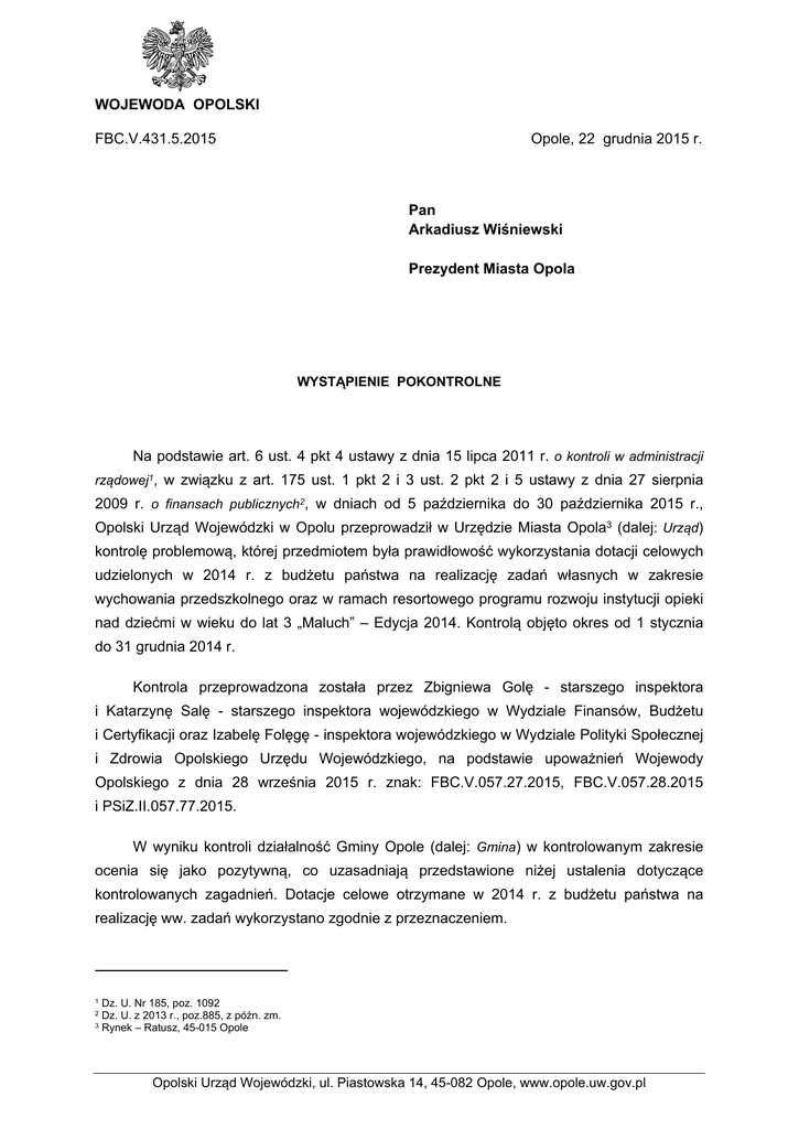WOJEWODA OPOLSKI FBC.V.431.5.2015 Opole, 22 grudnia 2015 r. Pan Arkadiusz Wiśniewski Prezydent Miasta Opola WYSTĄPIENIE POKONTROLNE Na podstawie art. 6 ust. 4 pkt 4 ustawy z dnia 15 lipca 2011 r. o kontroli w administracji rządowej1, w związku z art. 175 ust. 1 pkt 2 i 3 ust. 2 pkt 2 i 5 ustawy z dnia 27 sierpnia 2009 r. o finansach publicznych2, w dniach od 5 października do 30 października 2015 r., Opolski Urząd Wojewódzki w Opolu przeprowadził w Urzędzie Miasta Opola3 (dalej: Urząd) kontrolę problemową, której przedmiotem była prawidłowość wykorzystania dotacji celowych udzielonych w 2014 r. z budżetu państwa na realizację zadań własnych w zakresie wychowania przedszkolnego oraz w ramach resortowego programu rozwoju instytucji opieki nad dziećmi w wieku do lat 3 „Maluch” – Edycja 2014. Kontrolą objęto okres od 1 stycznia do 31 grudnia 2014 r. Kontrola przeprowadzona została przez Zbigniewa Golę - starszego inspektora i Katarzynę Salę - starszego inspektora wojewódzkiego w Wydziale Finansów, Budżetu i Certyfikacji oraz Izabelę Folęgę - inspektora wojewódzkiego w Wydziale Polityki Społecznej i Zdrowia Opolskiego Urzędu Wojewódzkiego, na podstawie upoważnień Wojewody Opolskiego z dnia 28 września 2015 r. znak: FBC.V.057.27.2015, FBC.V.057.28.2015 i PSiZ.II.057.77.2015. W wyniku kontroli działalność Gminy Opole (dalej: Gmina) w kontrolowanym zakresie ocenia się jako pozytywną, co uzasadniają przedstawione niżej ustalenia dotyczące kontrolowanych zagadnień. Dotacje celowe otrzymane w 2014 r. z budżetu państwa na realizację ww. zadań wykorzystano zgodnie z przeznaczeniem. Dz. U. Nr 185, poz. 1092 Dz. U. z 2013 r., poz.885, z późn. zm. 3 Rynek – Ratusz, 45-015 Opole 1 2 Opolski Urząd Wojewódzki, ul. Piastowska 14, 45-082 Opole, www.opole.uw.gov.pl 1. Wykorzystanie dotacji na zadania własne w zakresie wychowania przedszkolnego. 1.1. W 2014 r. na terenie Miasta Opola (dalej: Miasta) działały 32 przedszkola publiczne oraz 16 przedszkoli niepublicznych. Zgodnie z danymi odnotowanymi w systemie informacji oświatowej, według stanu na dzień 30 września 2013 r., na obszarze Miasta z wychowania przedszkolnego korzystało 4 018 dzieci, z czego dzieci poniżej 5 roku życia 2 187 oraz objętych obowiązkiem przedszkolnym 1 831. Wysokość planowanej dotacji na 2014 r. wyniosła 4 853 623,46 zł. Kwota ta została określona jako iloczyn kwoty rocznej 1 207,97 zł, ustalonej na podstawie art. 16 ust. 3 ustawy z dnia 13 czerwca 2013 r. o zmianie ustawy o systemie oświaty oraz niektórych innych ustaw4, oraz liczby dzieci korzystających z wychowania przedszkolnego na obszarze Miasta. Zgodnie z ostatecznym podziałem dotacji na poszczególne rozdziały klasyfikacji budżetowej dokonanym przez Gminę, decyzją Wojewody Opolskiego z dnia 5 marca 2014 r. udzielona została dotacja celowa na 2014 r. dla Gminy w dziale 801 Oświata i wychowanie w kwocie 4 853 623 zł, w tym w rozdziale 80104 Przedszkola, § 2030 Dotacje celowe przekazane z budżetu państwa na realizację własnych zadań bieżących gmin (związków gmin) w kwocie 4 833 751 zł oraz w rozdziale 80105 Przedszkola specjalne, § 2030 w kwocie 19 872 zł. W związku z przyznaniem powyższej dotacji, uchwałami Rady Miasta Opola zwiększono dochody i wydatki budżetu Gminy w wymienionych rozdziałach klasyfikacji budżetowej o kwotę 4 853 623 zł. Środki dotacji otrzymane z budżetu Wojewody Opolskiego w wymienionej kwocie przeznaczono wyłącznie na dofinansowanie wydatków bieżących przedszkoli publicznych, realizujących zadania w zakresie wychowania przedszkolnego. W roku 2014 przedszkola publiczne wykorzystały w rozdziale 80104 środki budżetowe w wysokości 36 965 903,71 zł (udział środków dotacji w tych wydatkach wynosił 13,08%, tj. 4 833 751 zł), a niepubliczne w wysokości 4 830 680,68 zł (§ 2540 Dotacja podmiotowa z budżetu dla niepublicznej jednostki systemu oświaty – 4 822 723,92 zł oraz § 2590 Dotacja podmiotowa z budżetu dla publicznej jednostki systemu oświaty prowadzonej przez osobę prawną inną niż jednostka samorządu terytorialnego lub przez osobę fizyczną – 7 956,76 zł), co stanowi łącznie kwotę 41 796 584,39 zł. Wykonane wydatki w rozdziale 80105 wynosiły 1 145 851,86 zł (udział środków dotacji w tych wydatkach wynosił 1,73%, tj.19 872 zł). Z ustaleń kontroli wynika, że na realizację własnych zadań bieżących w zakresie wychowania przedszkolnego w 2014 r. Gmina poniosła wydatki ogółem w wysokości 42 942 436,25 zł, w tym środki z dotacji w łącznej kwocie 4 853 623 zł (tj. 11,30%) oraz środki własne w łącznej kwocie 38 088 813,25 zł (tj. 88,70%). Gmina zapewniła udział środków 4 Dz. U. z 2013 r., poz. 827, z późn. zm. Strona 2 z 5 własnych w kosztach realizacji zadania, wymagany zapisami art. 128 ust. 2 ustawy z dnia 27 sierpnia 2009 r. o finansach publicznych. 1.2. Roczne rozliczenie dotacji celowej z budżetu państwa na dofinansowanie tych zadań sporządzono przy użyciu elektronicznej aplikacji, zamieszczonej na stronie internetowej Ministerstwa Edukacji Narodowej, zgodnie z § 4 ust. 6 rozporządzenia Ministra Edukacji Narodowej z dnia 13 sierpnia 2013 r. w sprawie udzielania gminom dotacji celowej z budżetu państwa na dofinansowanie zadań w zakresie wychowania przedszkolnego5. Z rozliczenia wynika, że Gmina nie pobrała za 2014 r. dotacji z budżetu państwa w nadmiernej wysokości, a otrzymane środki wydatkowała w całości. Średnioroczna liczba dzieci korzystających z wychowania przedszkolnego na obszarze Miasta w roku budżetowym (3 200) była wyższa od liczby dzieci w wieku 2,5 do 5 lat, uwzględnionej do naliczenia dotacji (3 161). W dniu 22 stycznia 2015 r. Urząd przekazał Wojewodzie Opolskiemu rozliczenie wykorzystania dotacji celowej z budżetu państwa na dofinansowanie zadań w zakresie wychowania przedszkolnego za rok 2014, zachowując termin określony w § 