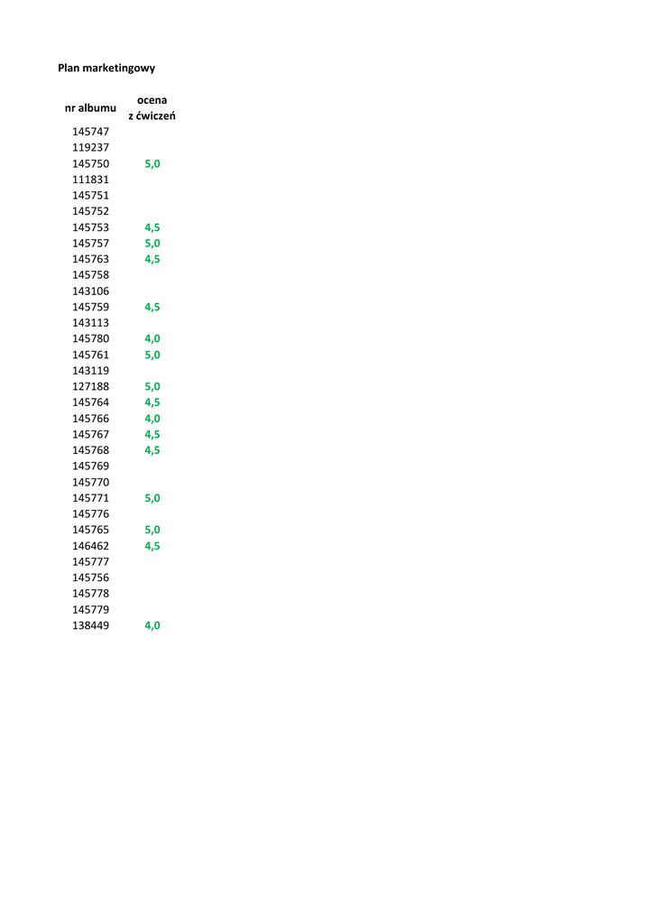 Plan marketingowy nr albumu 145747 119237 145750 111831 145751 145752 145753 145757 145763 145758 143106 145759 143113 145780 145761 143119 127188 145764 145766 145767 145768 145769 145770 145771 145776 145765 146462 145777 145756 145778 145779 138449 ocena z ćwiczeń 5,0 4,5 5,0 4,5 4,5 4,0 5,0 5,0 4,5 4,0 4,5 4,5 5,0 5,0 4,5 4,0