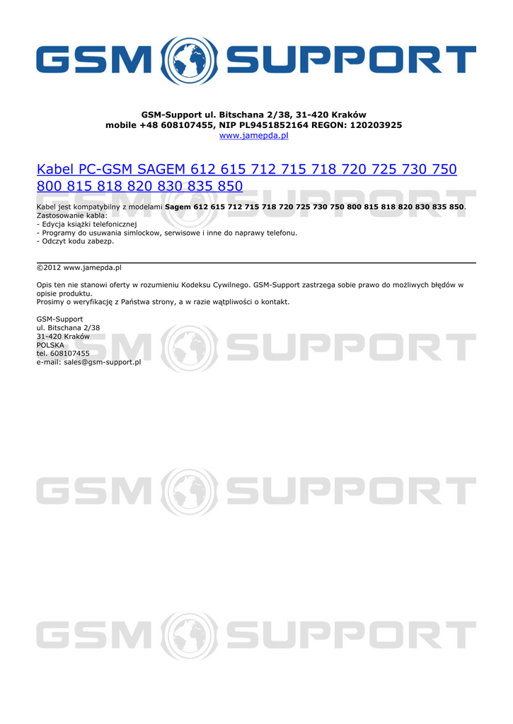 GSM-Support ul. Bitschana 2/38, 31-420 Kraków mobile +48 608107455, NIP PL9451852164 REGON: 120203925 www.jamepda.pl Kabel PC-GSM SAGEM 612 615 712 715 718 720 725 730 750 800 815 818 820 830 835 850 Kabel jest kompatybilny z modelami Sagem 612 615 712 715 718 720 725 730 750 800 815 818 820 830 835 850. Zastosowanie kabla: - Edycja książki telefonicznej - Programy do usuwania simlockow, serwisowe i inne do naprawy telefonu. - Odczyt kodu zabezp. ©2012 www.jamepda.pl Opis ten nie stanowi oferty w rozumieniu Kodeksu Cywilnego. GSM-Support zastrzega sobie prawo do możliwych błędów w opisie produktu. Prosimy o weryfikację z Państwa strony, a w razie wątpliwości o kontakt. GSM-Support ul. Bitschana 2/38 31-420 Kraków POLSKA tel. 608107455 e-mail: [email protected] Powered by TCPDF (www.tcpdf.org)