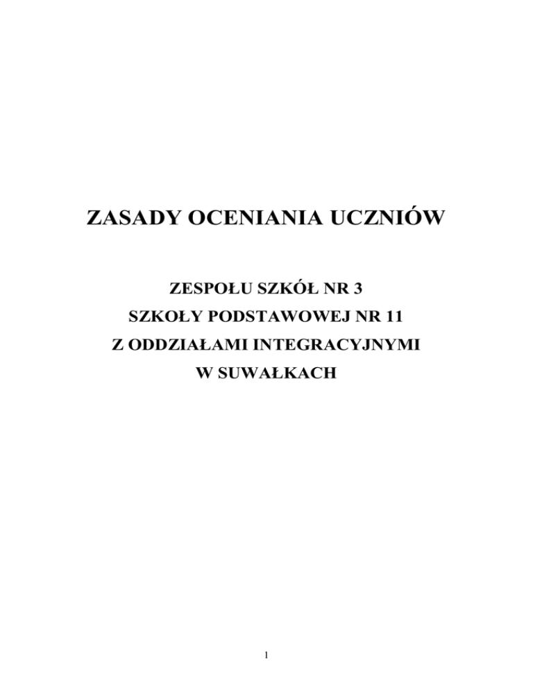 ZASADY OCENIANIA UCZNIÓW ZESPOŁU SZKÓŁ NR 3 SZKOŁY PODSTAWOWEJ NR 11 Z ODDZIAŁAMI INTEGRACYJNYMI W SUWAŁKACH 1 ZASADY OCENIANIA UCZNIÓW SZKOŁY PODSTAWOWEJ NR 11 Z ODDZIAŁAMI INTEGRACYJNYMI W SUWAŁKACH Zasady zostały opracowane na podstawie: 1. Rozporządzenia Ministra Edukacji Narodowej z dnia 27 sierpnia 2012 r. (z późniejszymi zmianami) w sprawie podstawy programowej wychowania przedszkolnego oraz kształcenia ogólnego w poszczególnych typach szkół. 2. Rozporządzenia Ministra Edukacji Narodowej z dnia 29 sierpnia 2014 r. (z późniejszymi zmianami) w sprawie sposobu prowadzenia przez publiczne przedszkola, szkoły i placówki dokumentacji przebiegu nauczania, działalności wychowawczej i opiekuńczej oraz rodzajów tej dokumentacji. 3. ROZPORZĄDZENIA Ministra Edukacji Narodowej z dnia 10.06.2015 r. (z późniejszymi zmianami) w sprawie warunków i sposobu oceniania, klasyfikowania i promowania uczniów i słuchaczy oraz przeprowadzania sprawdzianów i egzaminów w szkołach publicznych. 4. ROZPORZĄDZENIA Ministra Edukacji Narodowej z dnia 07.02.2012 r. (z późniejszymi zmianami) w sprawie ramowych planów nauczania w szkołach publicznych. 5. ROZPORZĄDZENIA Ministra Edukacji Narodowej z dnia 24.05.2001 r. (z późniejszymi zmianami) w sprawie ramowych statutów publicznego przedszkola oraz szkół publicznych. System oceniania został opracowany przez komisję Rady Pedagogicznej, przyjęty na plenarnym posiedzeniu Rady Pedagogicznej, a następnie zaopiniowany na posiedzeniu Rady Rodziców. CELE OCENIANIA SZKOLNEGO 1. Poinformowanie ucznia o poziomie jego osiągnięć edukacyjnych i postępach w tym zakresie; 2. Pomoc uczniowi w samodzielnym planowaniu swojego rozwoju; 3. Motywowanie ucznia do dalszych postępów w nauce i zachowaniu; 2 4. Dostarczanie rodzicom (prawnym opiekunom) i nauczycielom informacji o postępach, trudnościach w nauce, zachowaniu oraz specjalnych uzdolnieniach ucznia; 5. Umożliwienie nauczycielom doskonalenia organizacji i metod pracy dydaktyczno wychowawczej. ORGANIZACJA SYSTEMU OCENIANIA 1. Ocenianie osiągnięć edukacyjnych ucznia polega na rozpoznawaniu przez nauczycieli poziomu i postępów w opanowaniu przez ucznia wiadomości i umiejętności w stosunku do wymagań edukacyjnych wynikających z podstawy programowej i realizowanych w szkole programów nauczania, uwzględniających tę podstawę. 2. Rok szkolny jest podzielony na dwa semestry. 3. W klasach I – III śródroczne i roczne oceny klasyfikacyjne z zajęć edukacyjnych są ocenami opisowymi. 4. Od klasy I oceny cząstkowe wyrażane są w stopniu, w skali 1 – 6. 5. W klasach IV–VI końcoworoczne oceny klasyfikacyjne ustala się w stopniach wg skali: 1) stopień celujący – 6 2) stopień bardzo dobry – 5 3) stopień dobry – 4 4) stopień dostateczny – 3 5) stopień dopuszczający – 2 6) stopień niedostateczny – 1. 6. Oceny bieżące i śródroczne oceny klasyfikacyjne z zajęć edukacyjnych ustala się wg powyższej skali (oceny od 2 do 5 mogą być poszerzone o „+” i „–”). 7. Szczegóły dotyczące wystawiania ocen bieżących regulują Zasady Oceniania Uczniów z poszczególnych przedmiotów. 8. W każdym semestrze uczeń klas IV – VI powinien otrzymać nie mniej niż 4 oceny z każdego przedmiotu (w tym z prac pisemnych, odpowiedzi ustnej i zadania domowego); nauczyciele języka polskiego, języka angielskiego i matematyki mają te normy dwa razy wyższe. 9. Oceny są jawne dla ucznia i jego rodziców (prawnych opiekunów). 10. Na wniosek ucznia lub jego rodziców (prawnych opiekunów) nauczyciel uzasadnia ustaloną ocenę. 3 11. Nauczyciel ma obowiązek dostosować poziom wymagań wobec ucznia na podstawie pisemnej opinii poradni psychologiczno – pedagogicznej. 12. Przy ustalaniu oceny z wychowania fizycznego, techniki, muzyki i plastyki należy w szczególności brać pod uwagę wysiłek wkładany przez ucznia w wywiązywaniu się z obowiązków wynikających ze specyfiki tych zajęć. 13. Oceny w dzienniku lekcyjnym powinny być opisane, jakiego zakresu materiału dotyczą. 14. Oceny ustalają nauczyciele prowadzący poszczególne zajęcia edukacyjne, a ocenę z zachowania – wychowawca klasy po zasięgnięciu opinii o uczniu innych nauczycieli i pracowników szkoły, uczniów danej szkoły oraz ocenianego ucznia. 15. Oceny klasyfikacyjne z zajęć edukacyjnych nie mają wpływu na ocenę klasyfikacyjną zachowania. 16. W przypadku wprowadzenia w szkolnym planie nauczania zestawienia zajęć edukacyjnych w blok przedmiotowy, odrębnie ocenia się poszczególne zajęcia edukacyjne wchodzące w skład tego bloku. 17. Dyrektor szkoły zwalnia ucznia z zajęć wychowania fizycznego lub informatyki na podstawie opinii o ograniczonych możliwościach uczestniczenia ucznia w tych zajęciach, wydanej przez lekarza, oraz na czas określony w tej opinii. 18. W przypadku zwolnienia ucznia z zajęć wychowania fizycznego lub informatyki w dokumentacji przebiegu nauczania zamiast oceny klasyfikacyjnej wpisuje się „zwolniony”. 19. Prace pisemne uczniów: a) kartkówki – krótkie sprawdziany pisemne do 15 minut, obejmujące wiadomości maksymalnie z 2-3 ostatnich lekcji – powinny zostać ocenione w ciągu 7 dni. b) sprawdzian pisemny na zakończenie zrealizowanego działu programu lub dwóch krótkich działów, trwający 1–2 godziny – powinien być oceniony w ciągu 14 dni. 20. Sprawdzone i ocenione sprawdziany pisemne są udostępniane uczniowi lub jego rodzicom (prawnym opiekunom) w obecności nauczyciela. 21. Nie przewiduje się pracy kontrolnej śródrocznej/końcoworocznej. 22. Ocena śródroczna/końcoworoczna nie jest średnią arytmetyczną ocen bieżących. 23. Przy wystawianiu oceny końcoworocznej uwzględniana jest ocena śródroczna. 24. O zasadach i kryteriach sprawdzania osiągnięć edukacyjnych i zachowania nauczyciele informują uczniów i rodziców we wrześniu na pierwszym zebraniu z rodzicami. 25. Na miesiąc przed k