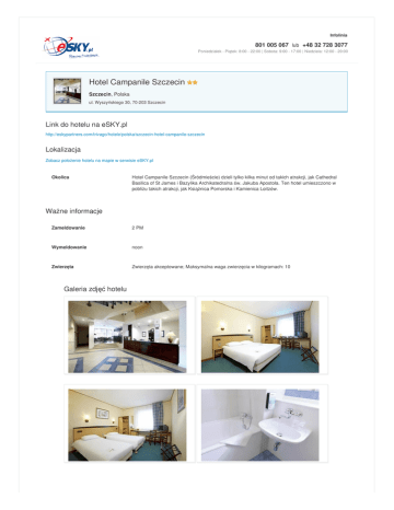 Infolinia 801 005 067 lub +48 32 728 3077 Poniedziałek - Piątek: 8:00 - 22:00 | Sobota: 9:00 - 17:00 | Niedziela: 12:00 - 20:00 Hotel Campanile Szczecin Szczecin, Polska ul. Wyszyńskiego 30, 70-203 Szczecin Link do hotelu na eSKY.pl http://eskypartners.com/trivago/hotele/polska/szczecin-hotel-campanile-szczecin Lokalizacja Zobacz położenie hotelu na mapie w serwisie eSKY.pl Okolica Hotel Campanile Szczecin (Śródmieście) dzieli tylko kilka minut od takich atrakcji, jak Cathedral Basilica of St James i Bazylika Archikatedralna św. Jakuba Apostoła. Ten hotel umieszczono w pobliżu takich atrakcji, jak Książnica Pomorska i Kamienica Loitzów. Ważne informacje Zameldowanie 2 PM Wymeldowanie noon Zwierzęta Zwierzęta akceptowane; Maksymalna waga zwierzęcia w kilogramach: 10 Galeria zdjęć hotelu Hotele – Bilety lotnicze – Tanie linie lotnicze – Ubezpieczenia Podróżne
